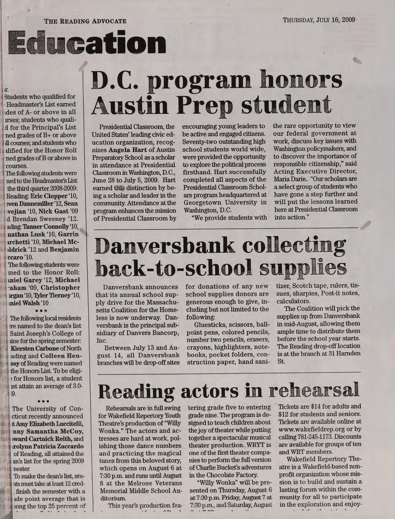 Presidential Classroom, the United States’ leading civic education organization, recognizes Angela Hart of Austin. Preparatory School as ascholar in attendance at Presidential Classroom in Washington, D.C., June 28 to July 5, 2009. Hart earned th% distinction by being a scholar and leader in the community. Attendance at the program enhances the mission of Presidential Classroom by
