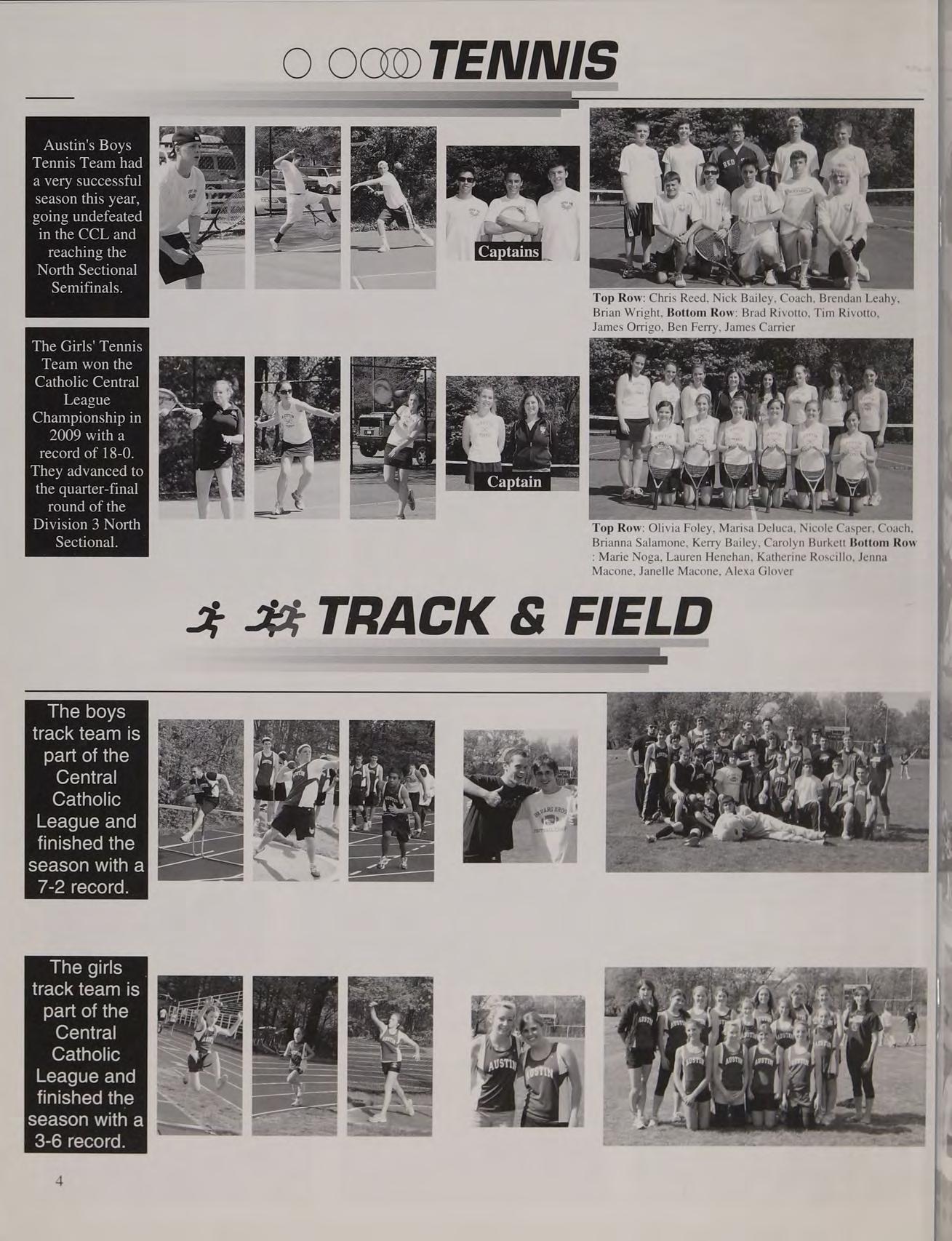 The Girls' Tennis Team won the Catholic Central League Championship in 2009 witha record of 18-0. They advanced to the quarter-final round of the Division 3 North Sectional.