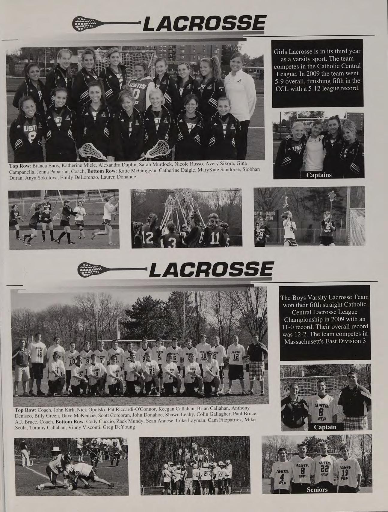 The Boys Varsity Lacrosse Team won their fifth straight Catholic Central Lacrosse League Championship in 2009 with an 11-0 record. Their overall record was 12-2. The team competes in Massachusett's East Division 3