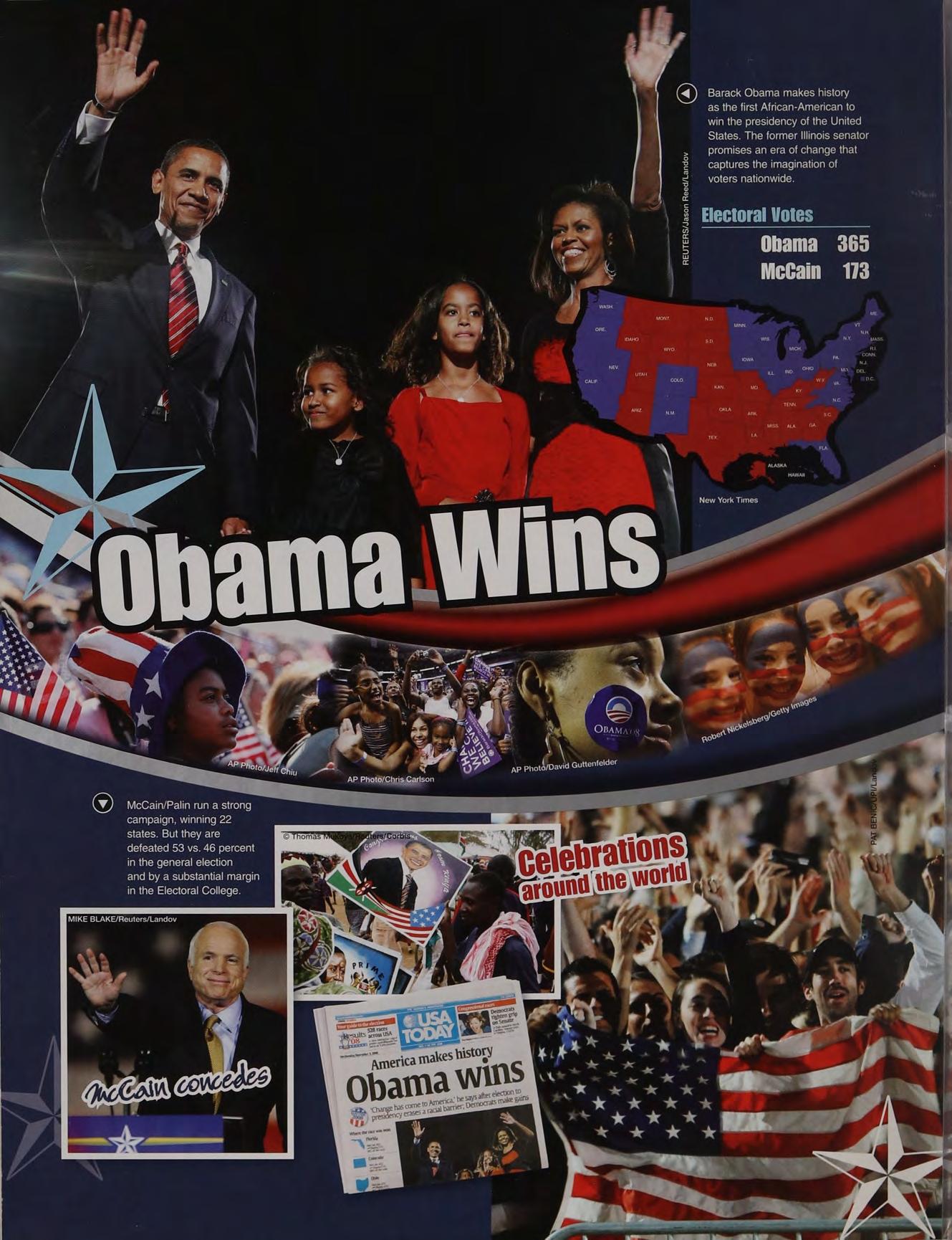 i) Barack Obama makes history as the first African-American to win the presidency of the United States. The former Illinois senator promises an era of change that captures the imagination of voters nationwide.