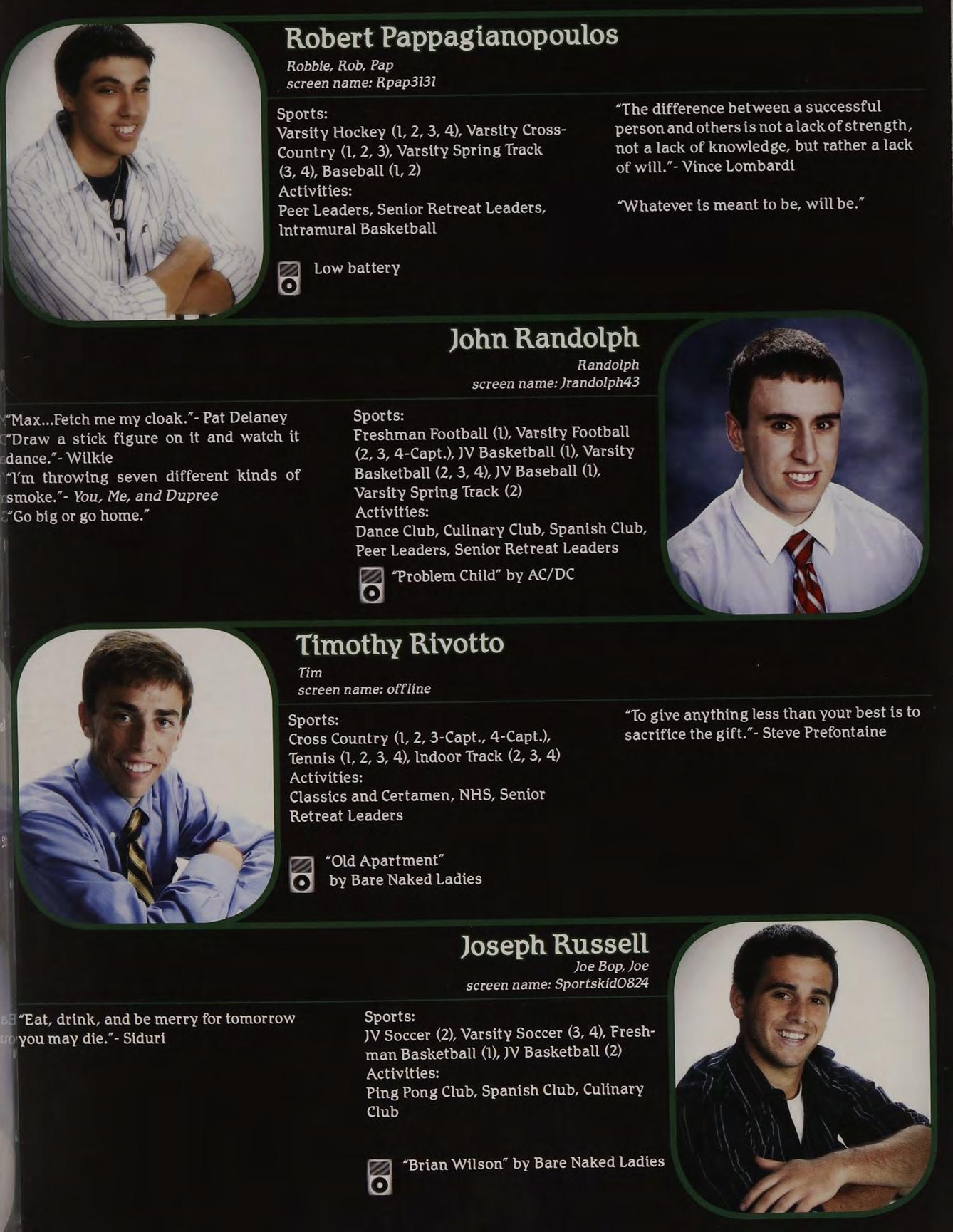 “Well he’s kind of had it in for me since 1 ac- Football (1,2), )V Baseball (1,2,3), cidentally ran over his dog. Actually replace Volleyball (4) “accidentally” with “repeatedly” and “dog” Activities: with “Son.” -Lionel Hutz