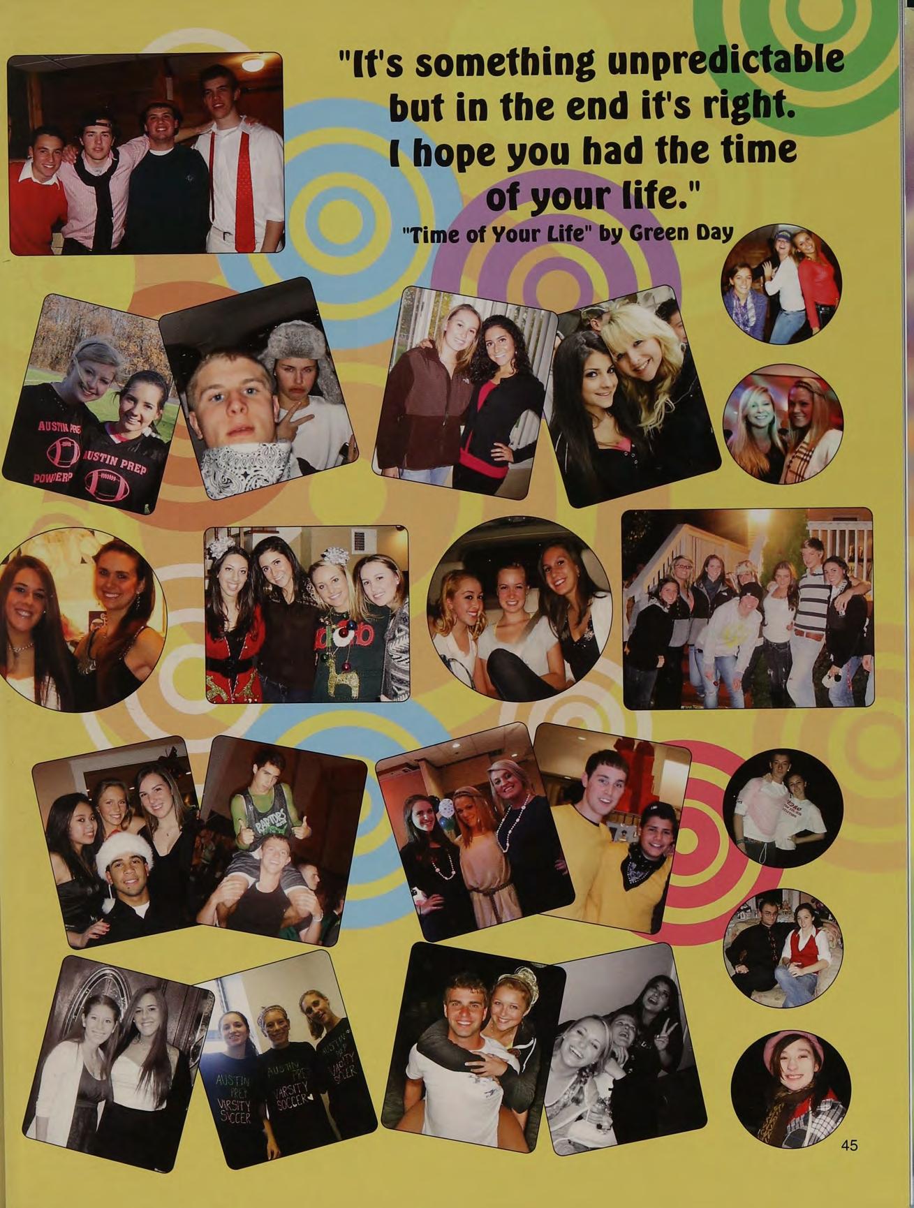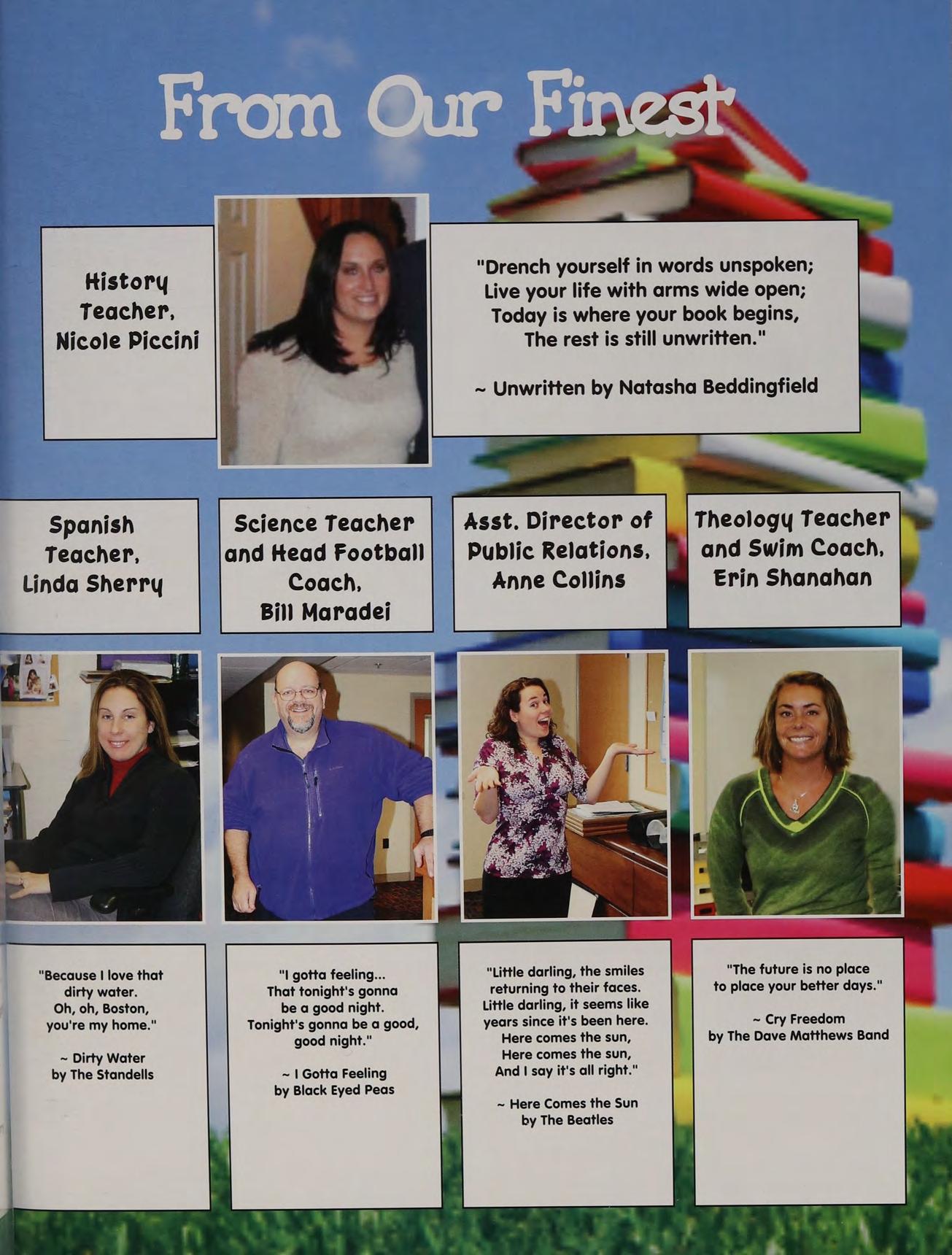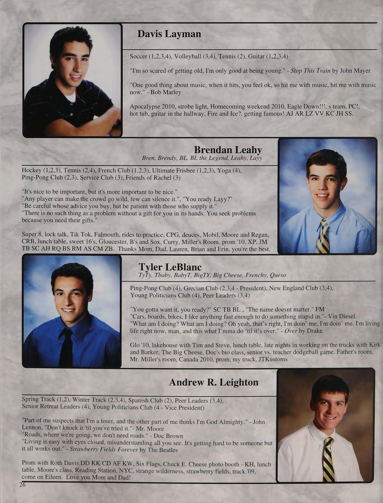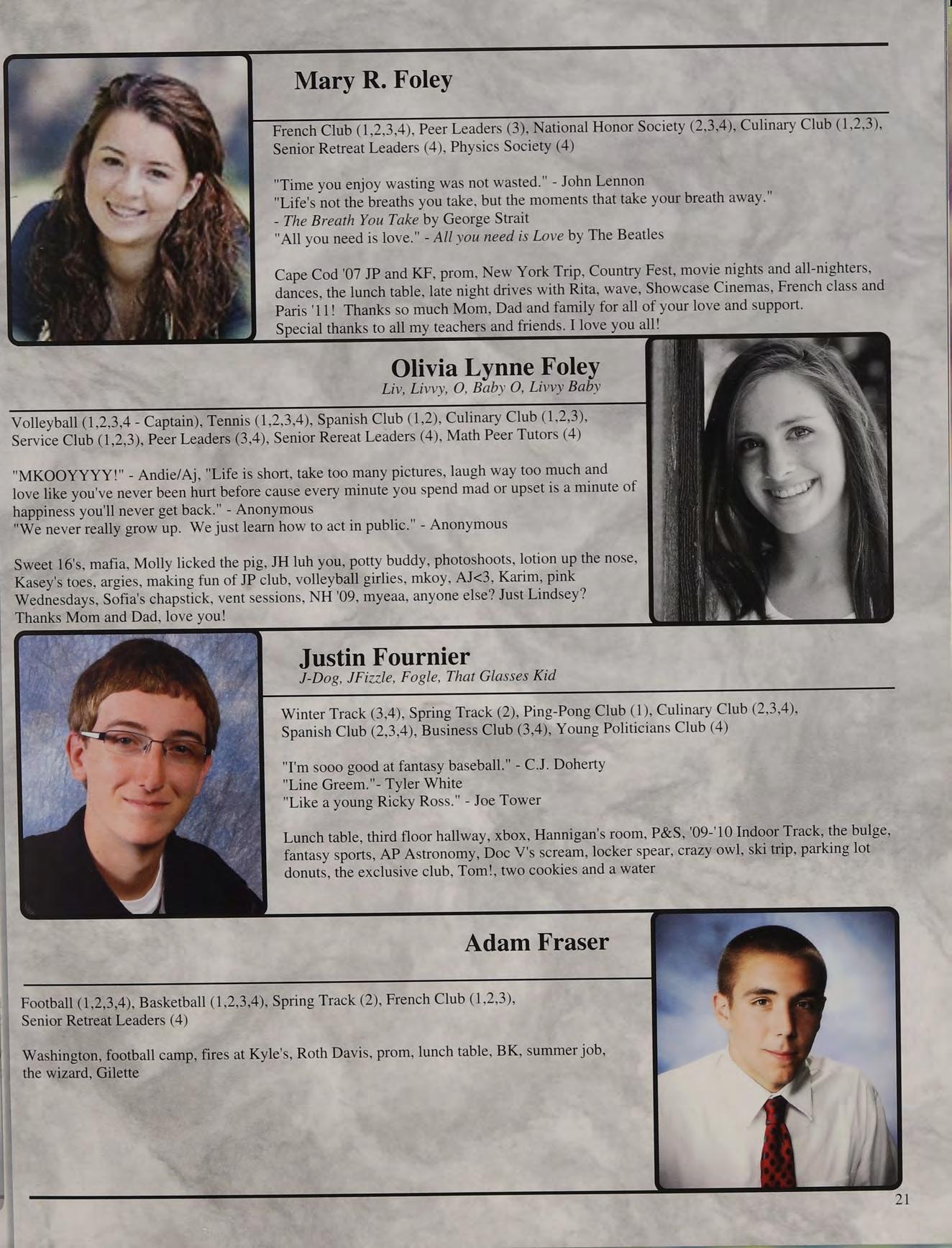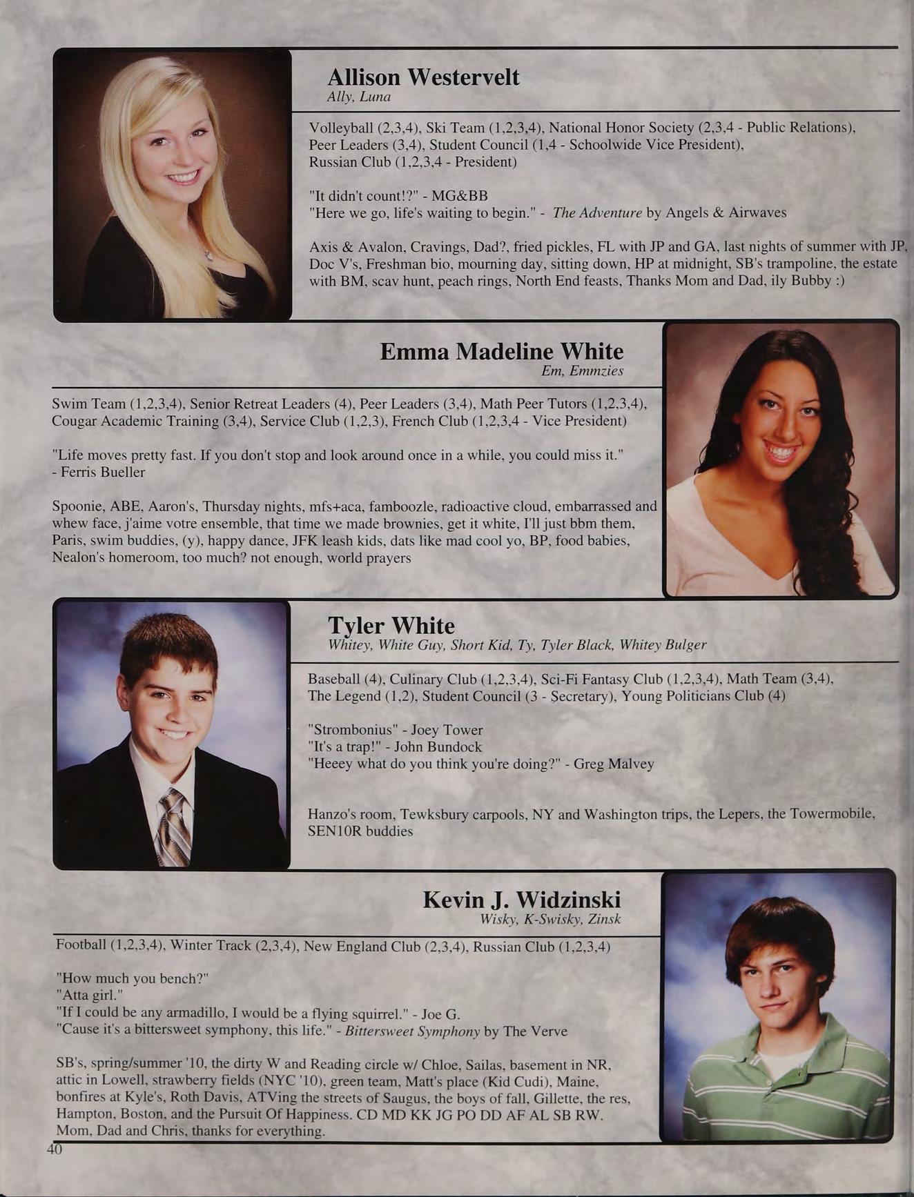 Italia & FL '09, Humarock, SPB & Sara's parties, concerts w/ Katie, Naughty Nine, falling asleep at Mike's house, Mr. DeLuca's class, scav hunt, Gloucester beach days, missing the Superbowl, prom '10, Mr. Mayo's room, JD JP AW VC KH BM MG SB BB and Mom and Dad, love you!