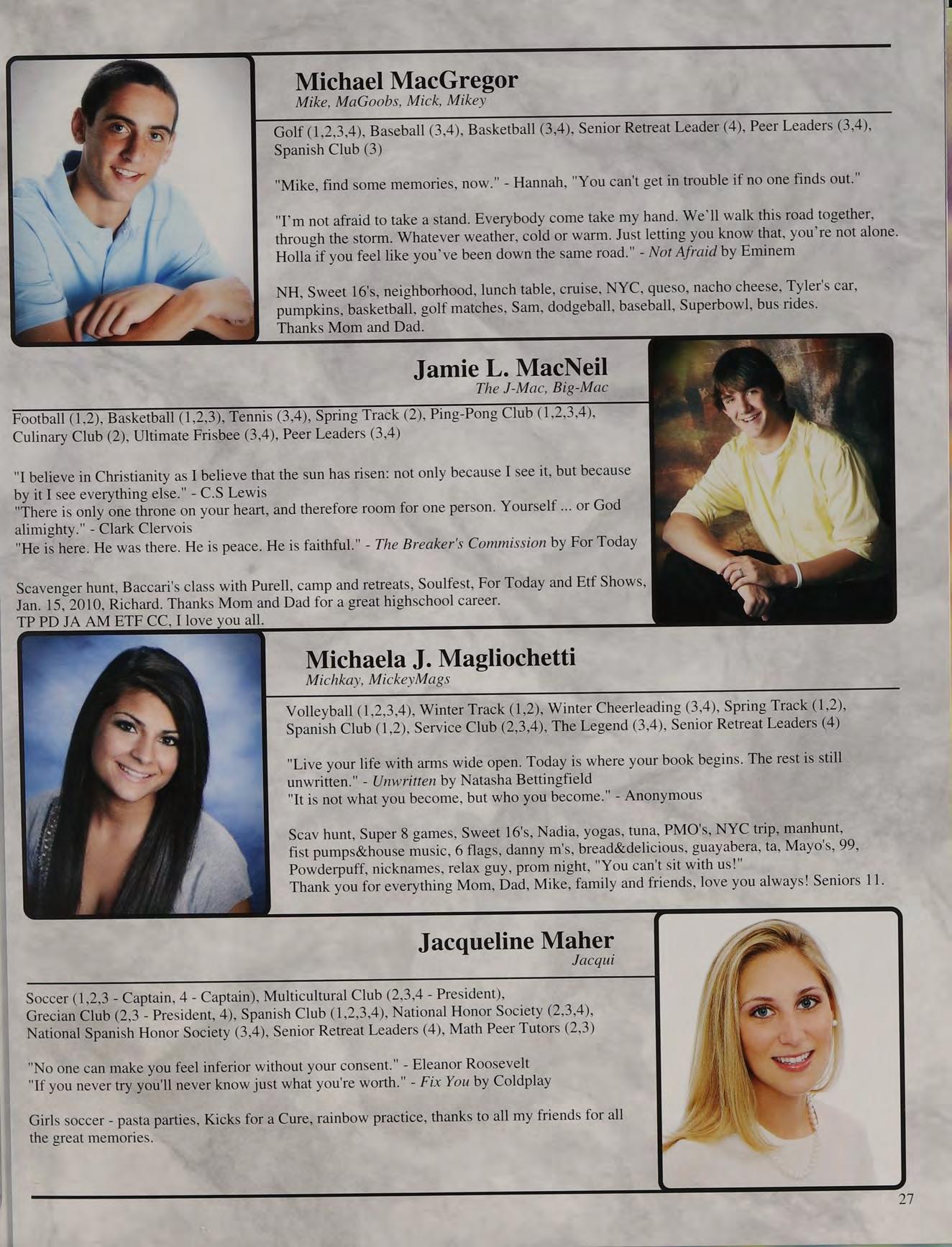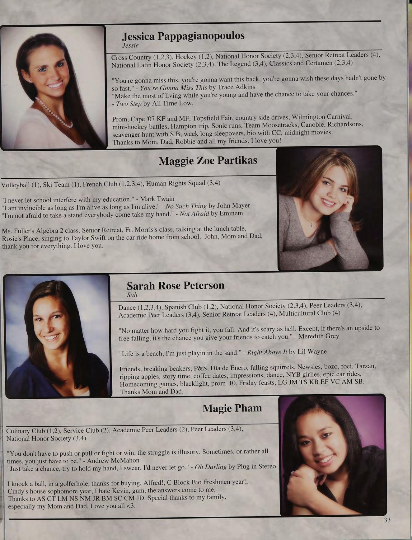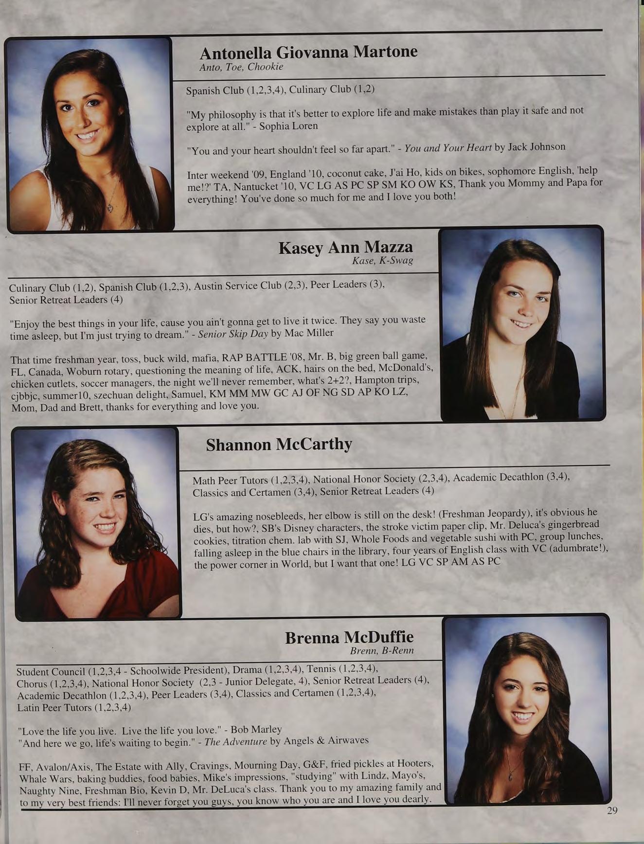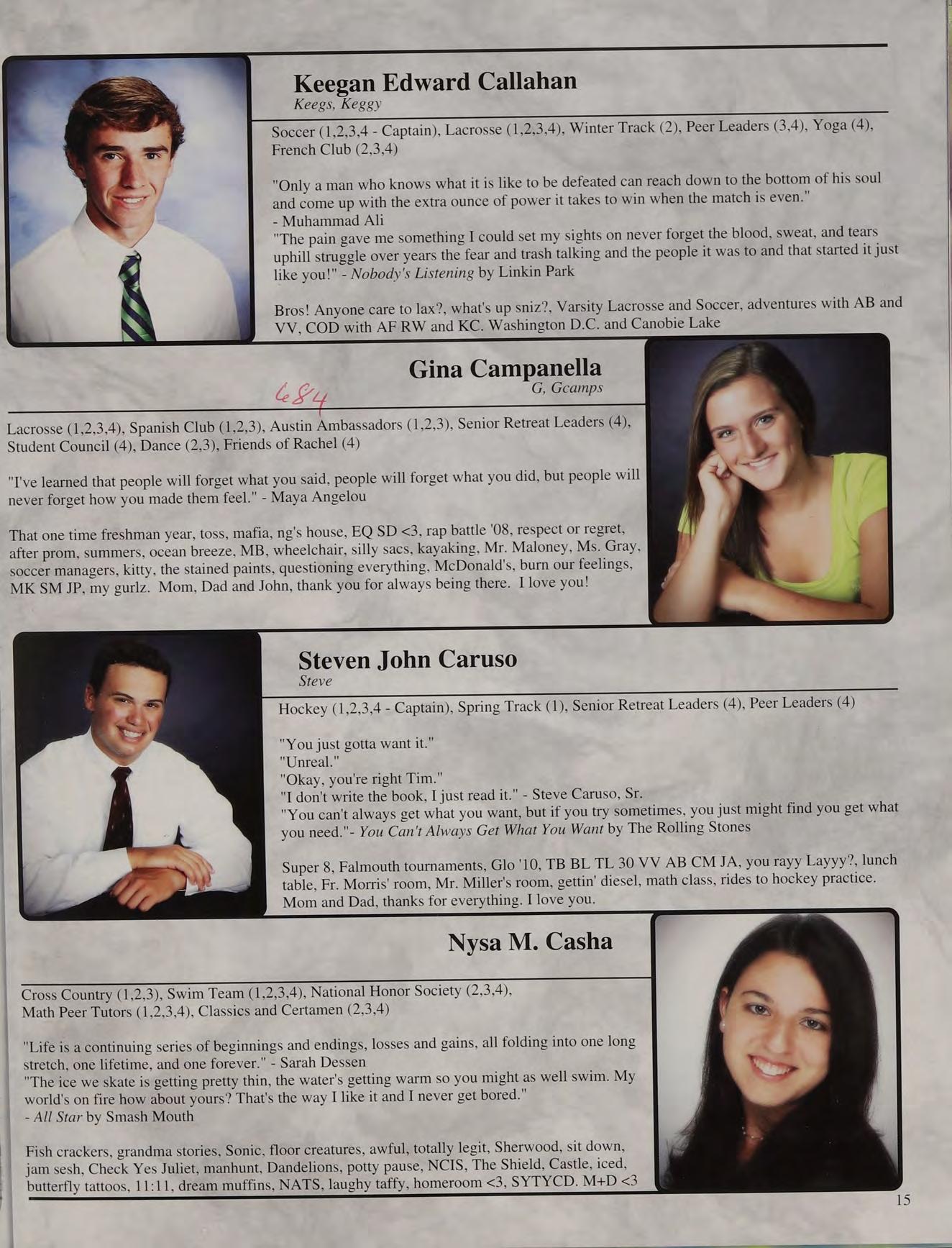 That one time freshman year, toss, mafia, ng's house, EQ SD <3, rap battle '08, respect or regret, after prom, summers, ocean breeze, MB, wheelchair, silly sacs, kayaking, Mr. Maloney, Ms. Gray, soccer managers, kitty, the stained paints, questioning everything, McDonald's, burn our feelings, MK SM JP, my gurlz. Mom, Dad and John, thank you for always being there. I love you!
