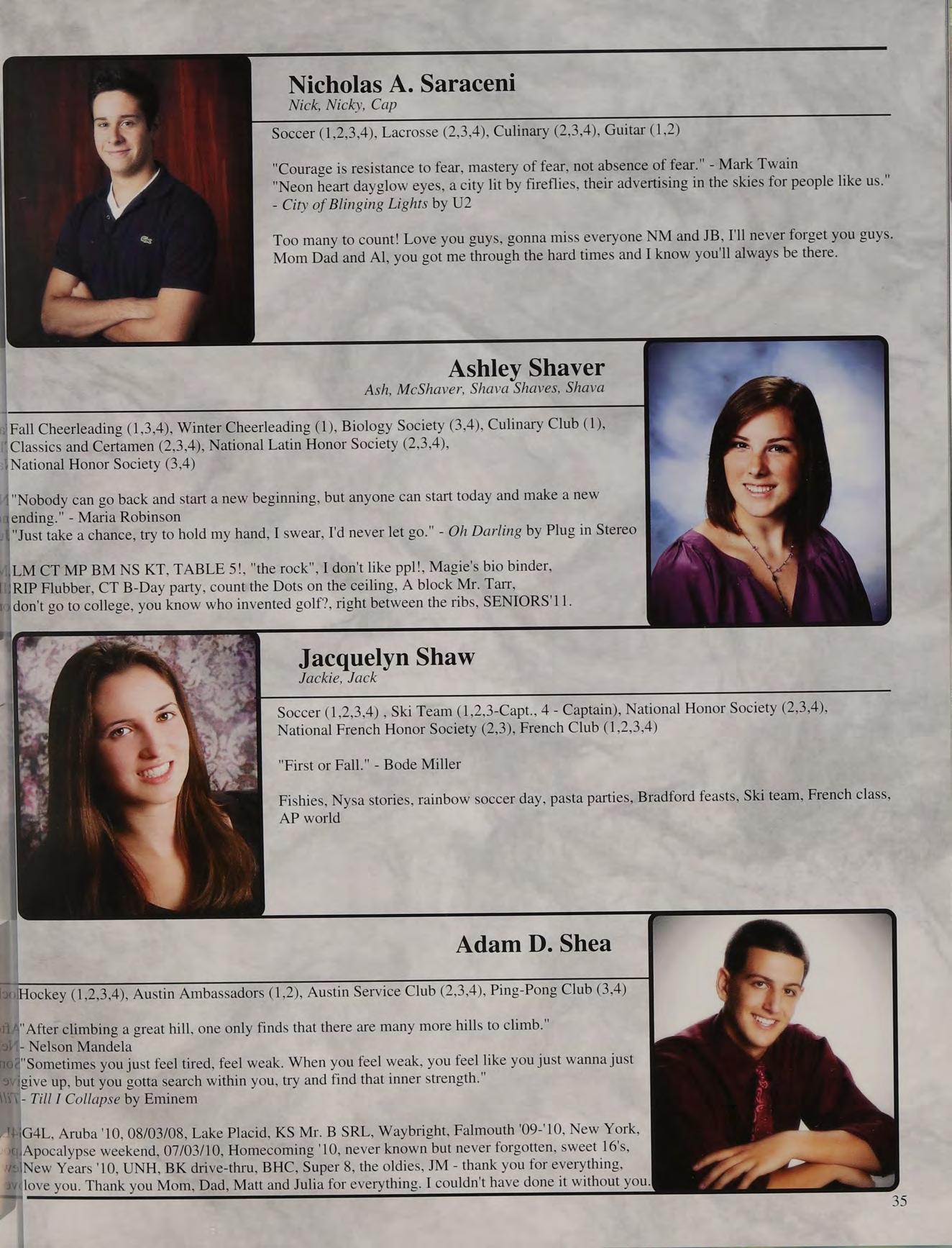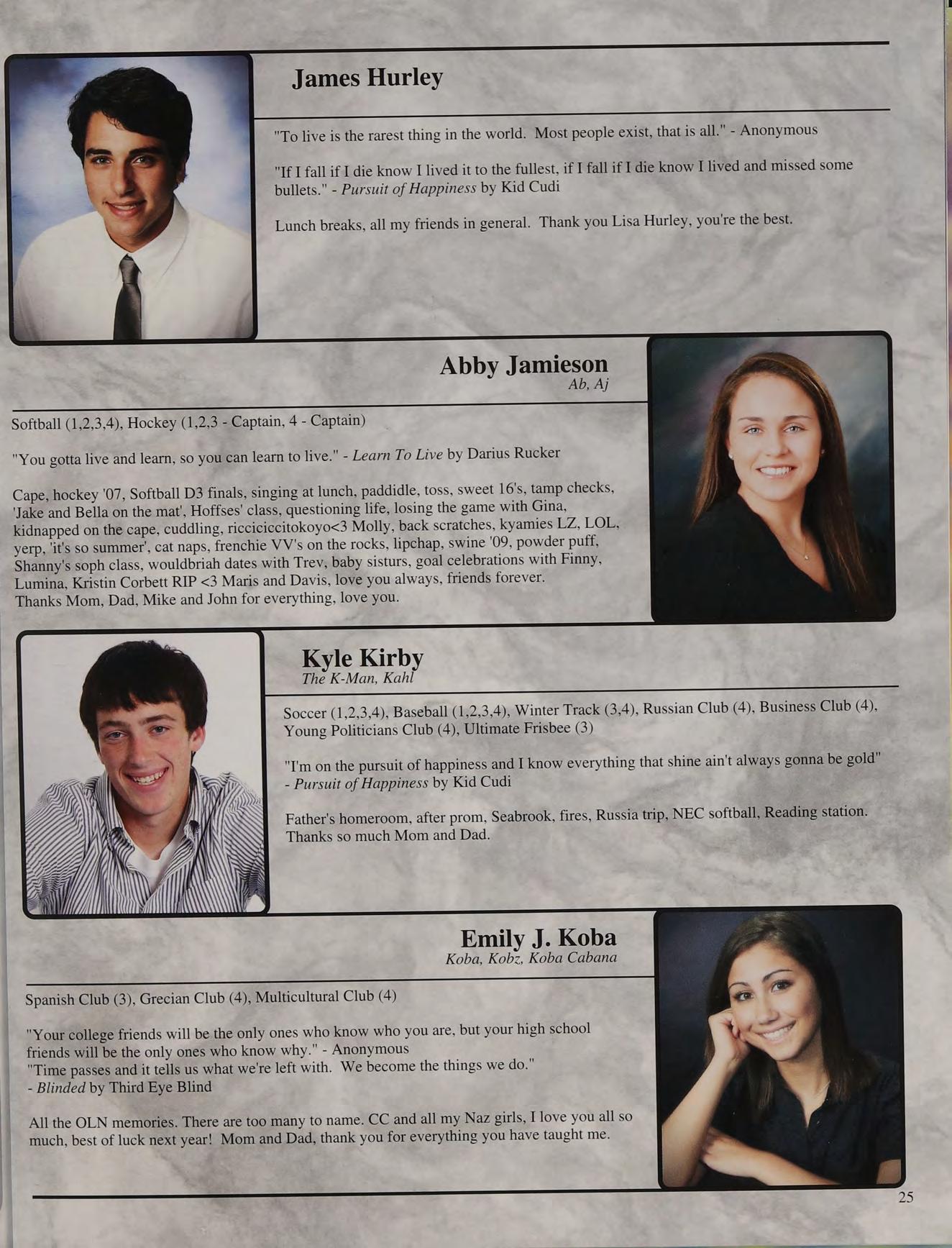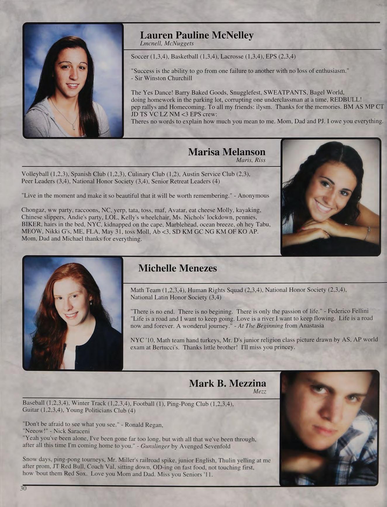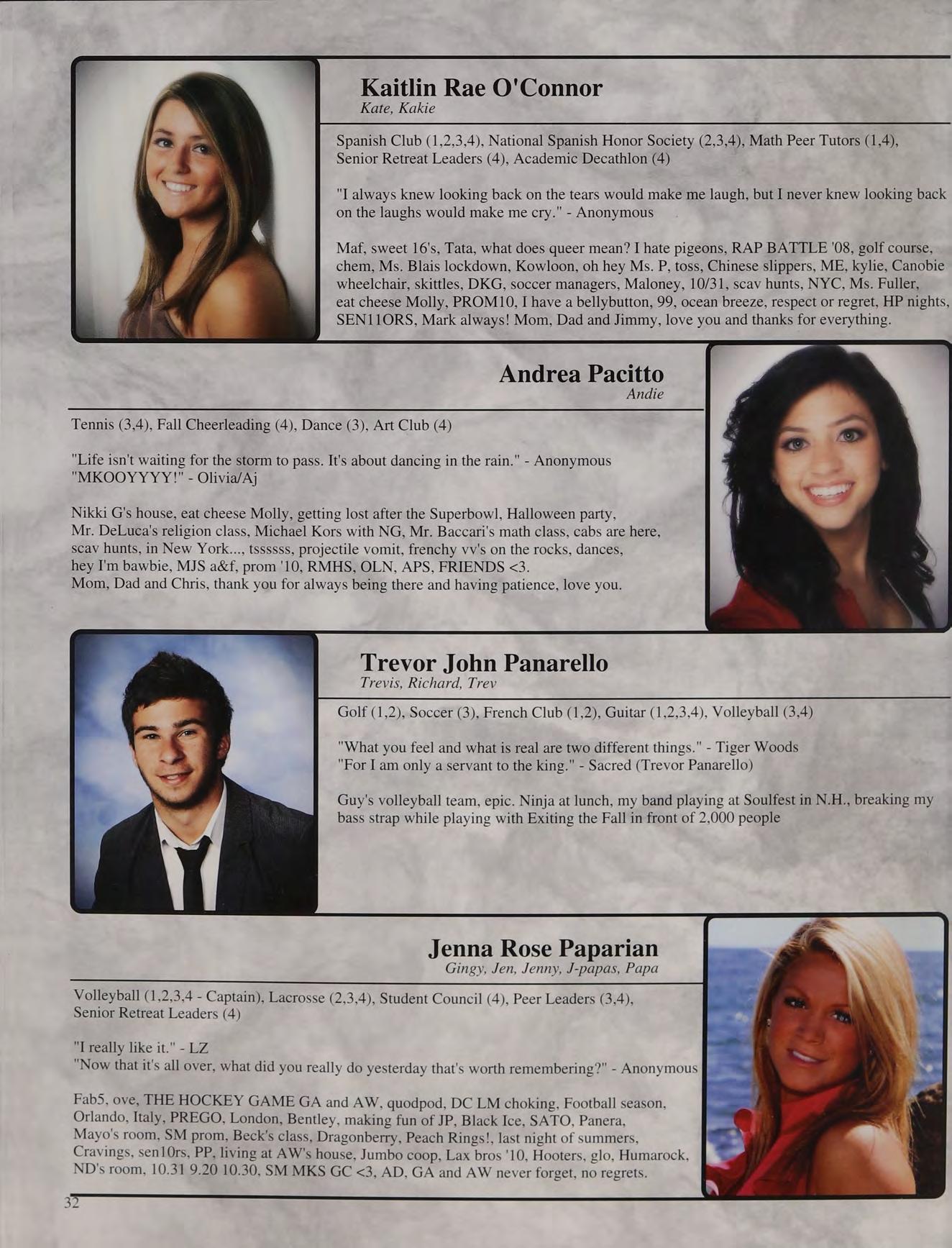 That one time freshman year, toss, mafia, ng's house, EQ SD <3, rap battle '08, respect or regret, after prom, summers, ocean breeze, MB, wheelchair, silly sacs, kayaking, Mr. Maloney, Ms. Gray, soccer managers, kitty, the stained paints, questioning everything, McDonald's, burn our feelings, MK SM JP, my gurlz. Mom, Dad and John, thank you for always being there. I love you!