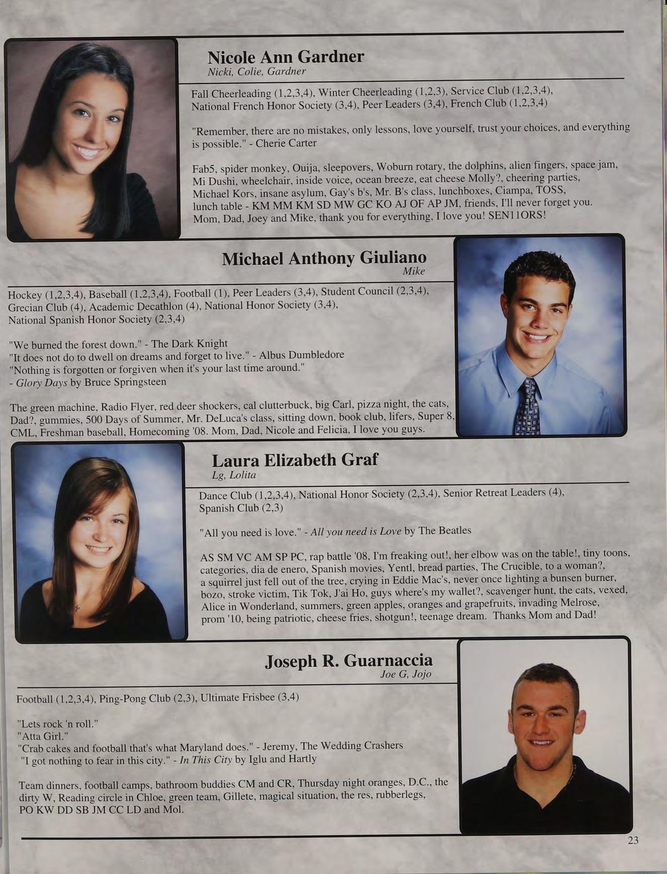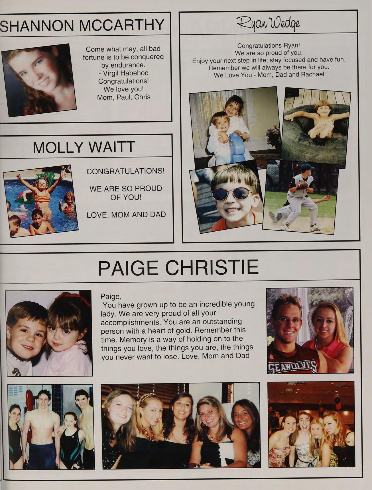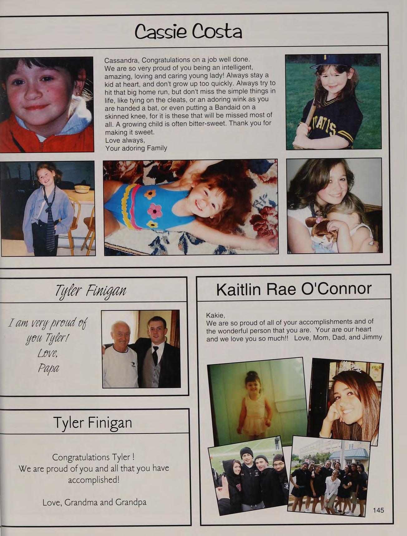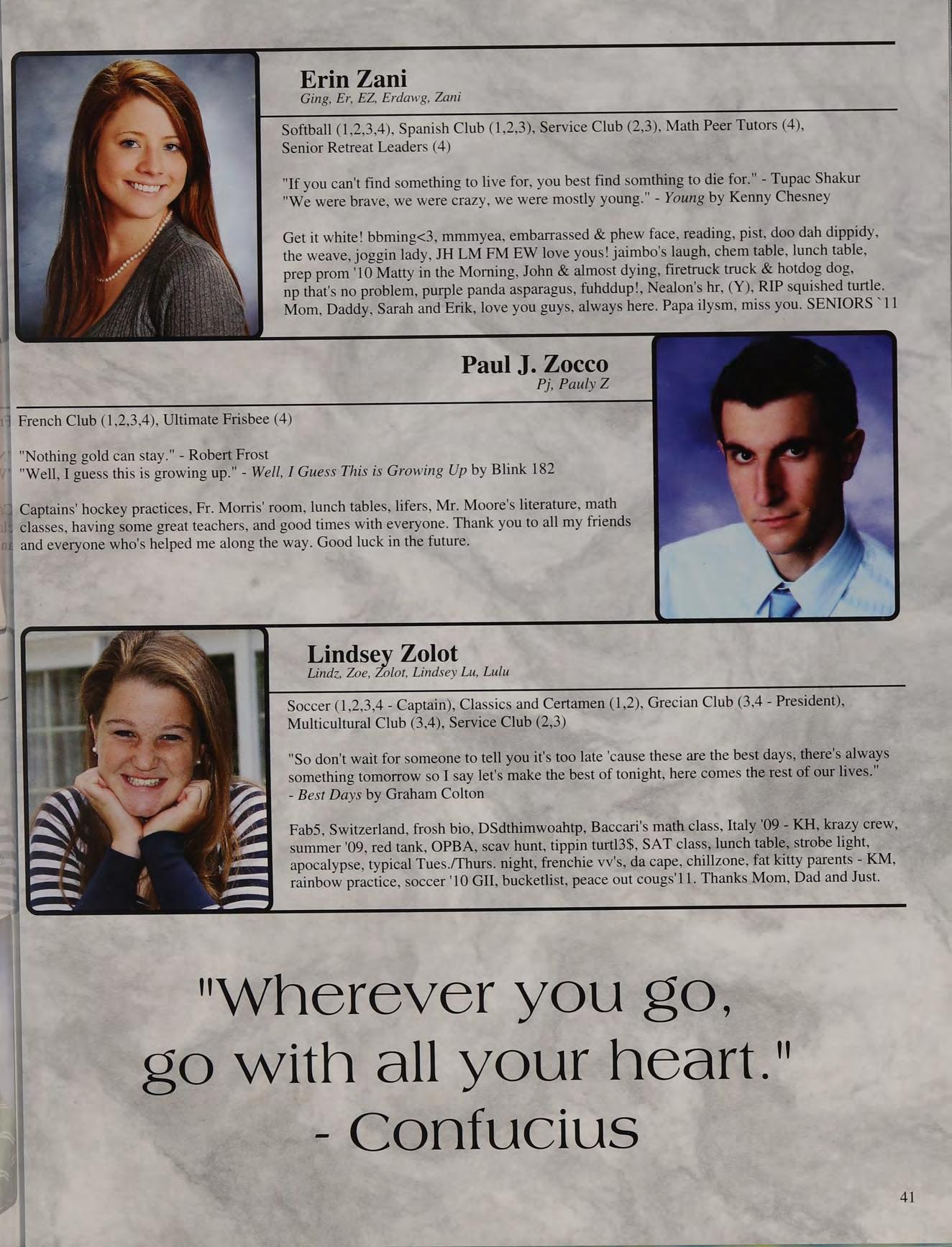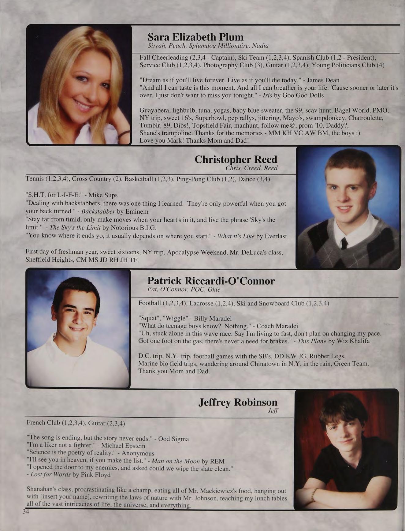 That one time freshman year, toss, mafia, ng's house, EQ SD <3, rap battle '08, respect or regret, after prom, summers, ocean breeze, MB, wheelchair, silly sacs, kayaking, Mr. Maloney, Ms. Gray, soccer managers, kitty, the stained paints, questioning everything, McDonald's, burn our feelings, MK SM JP, my gurlz. Mom, Dad and John, thank you for always being there. I love you!
