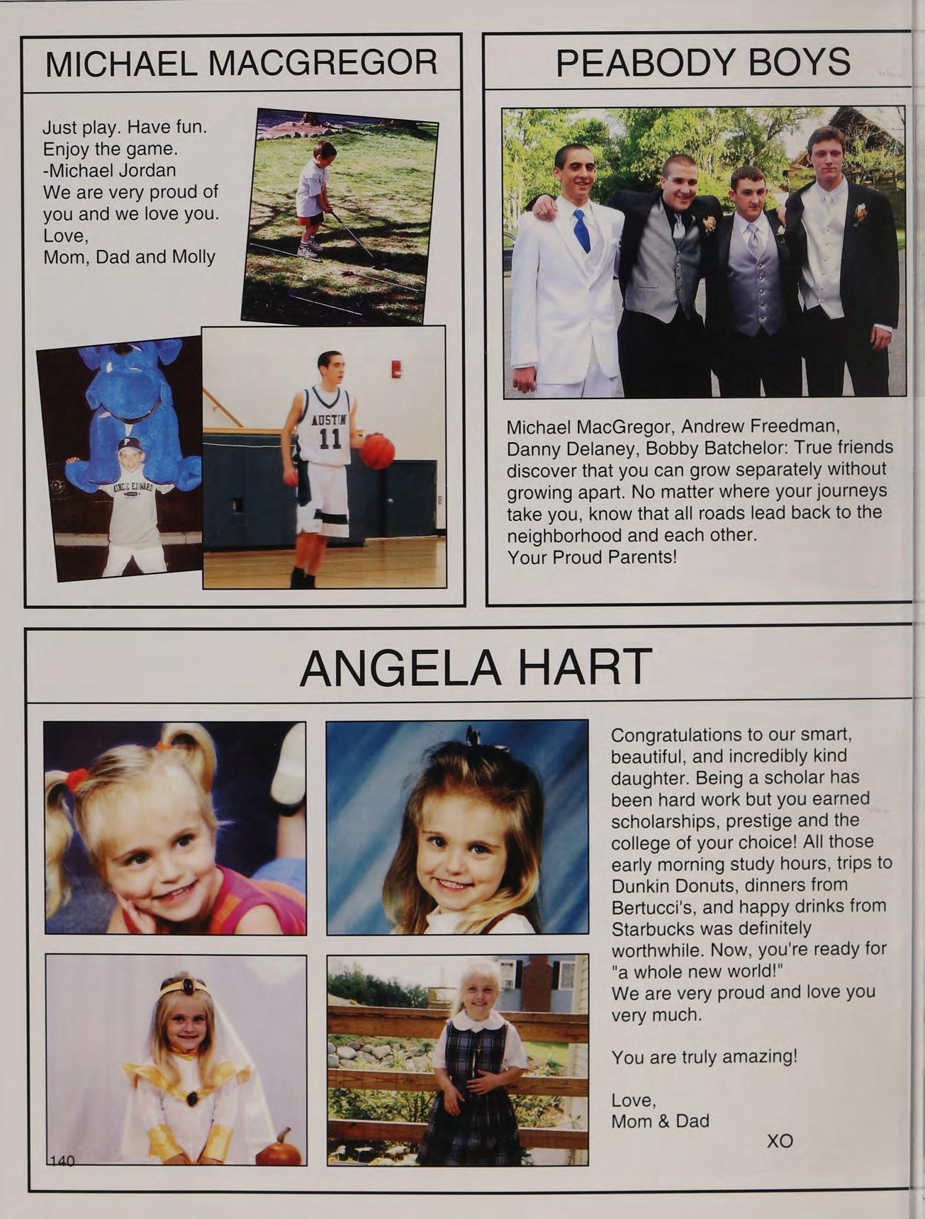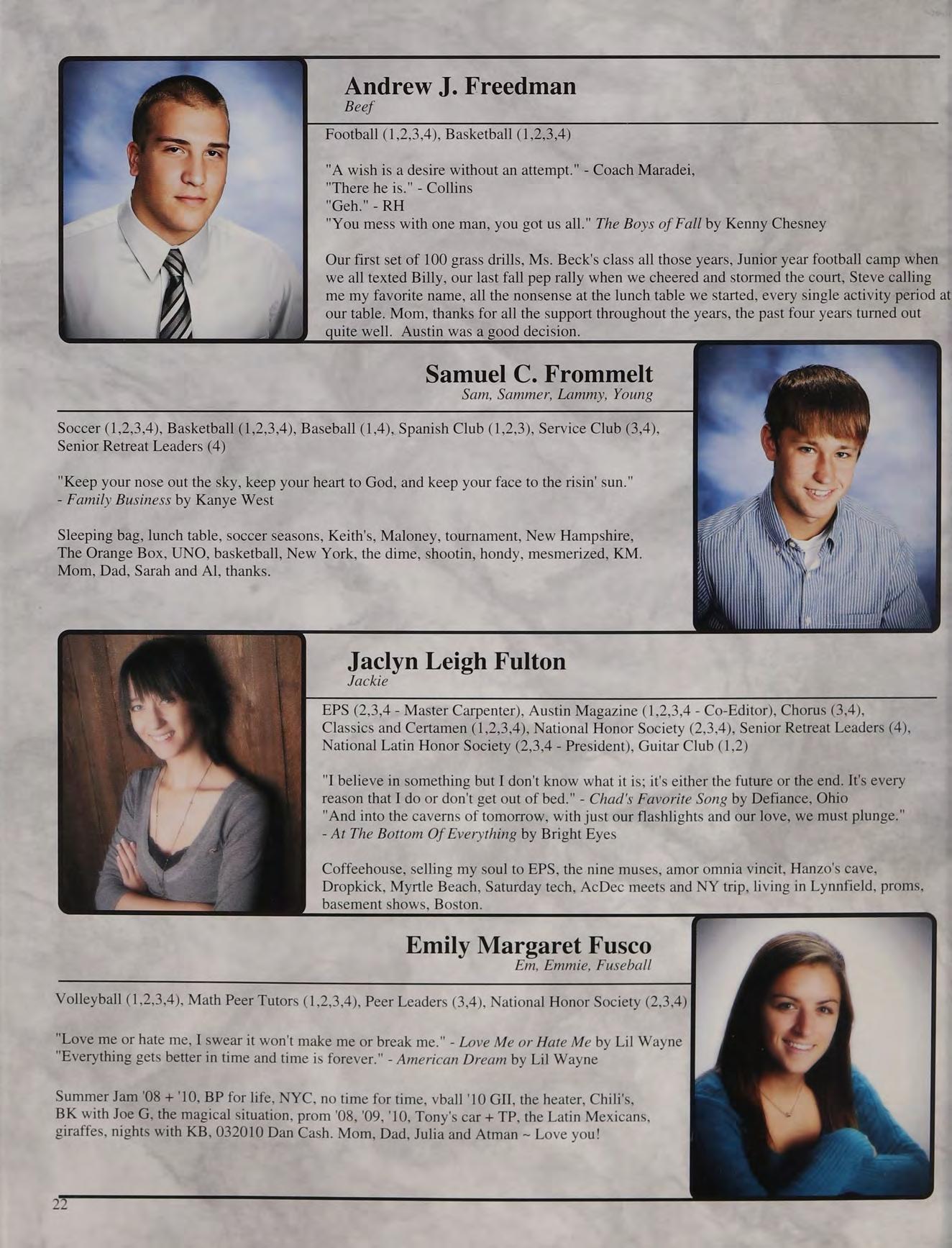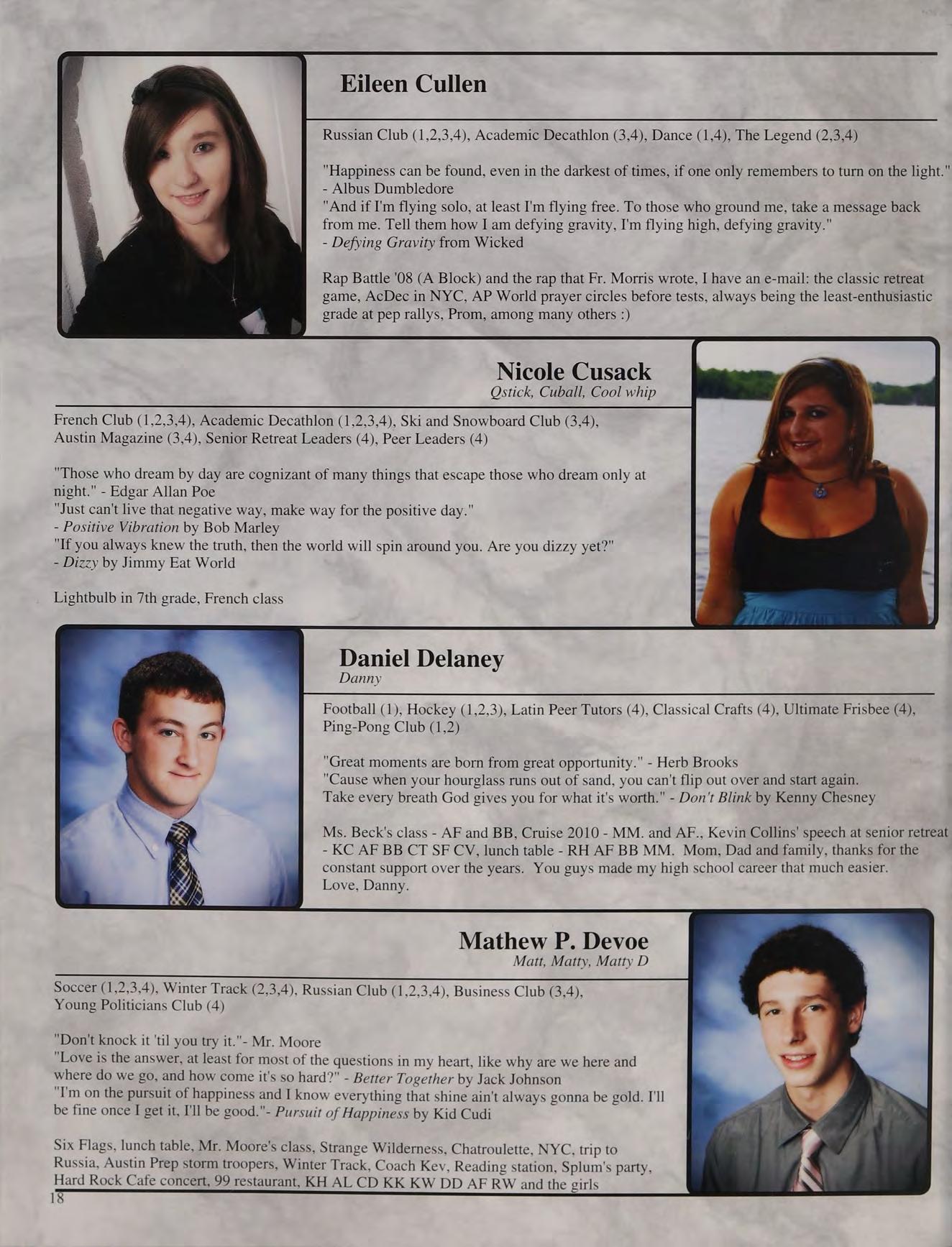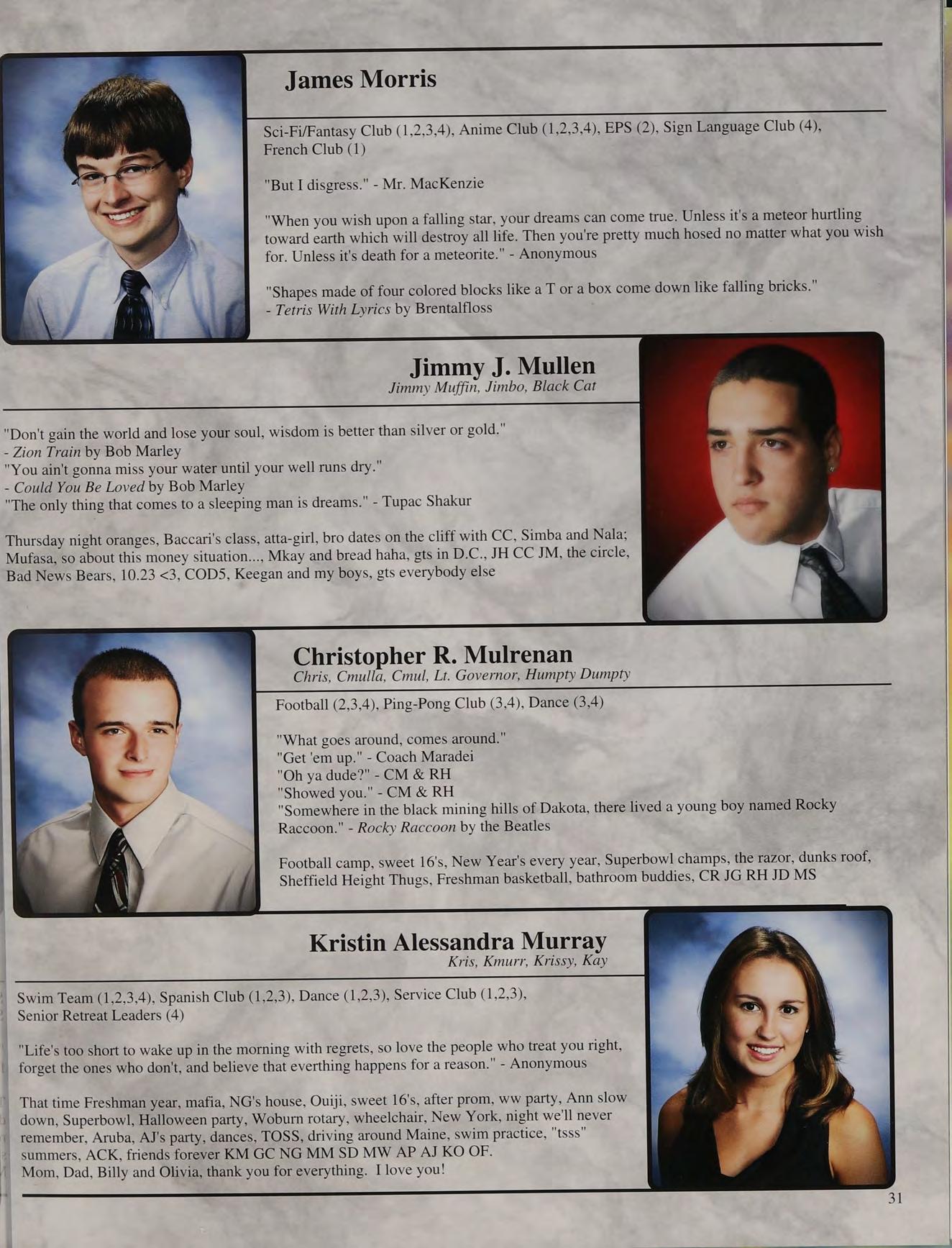 That one time freshman year, toss, mafia, ng's house, EQ SD <3, rap battle '08, respect or regret, after prom, summers, ocean breeze, MB, wheelchair, silly sacs, kayaking, Mr. Maloney, Ms. Gray, soccer managers, kitty, the stained paints, questioning everything, McDonald's, burn our feelings, MK SM JP, my gurlz. Mom, Dad and John, thank you for always being there. I love you!