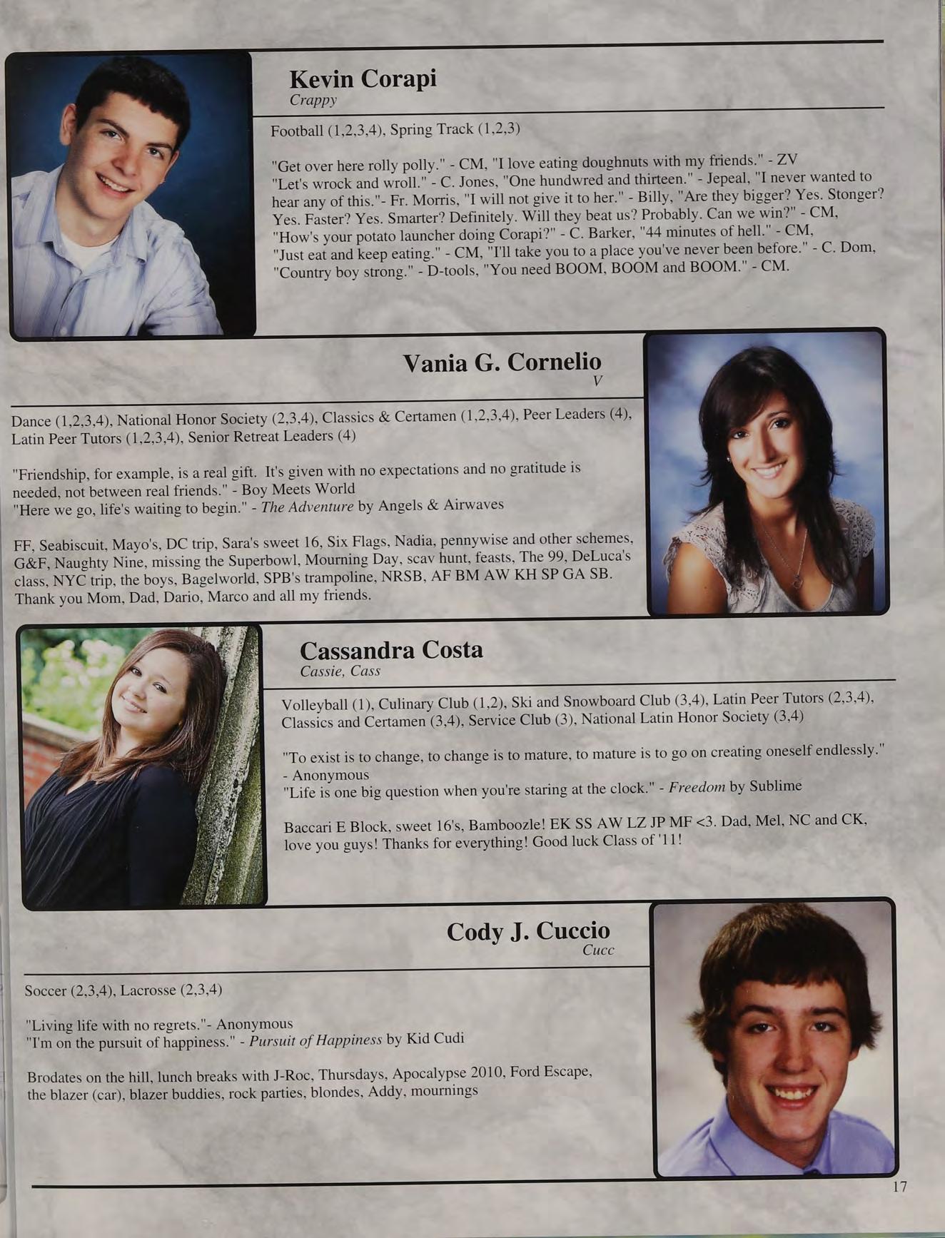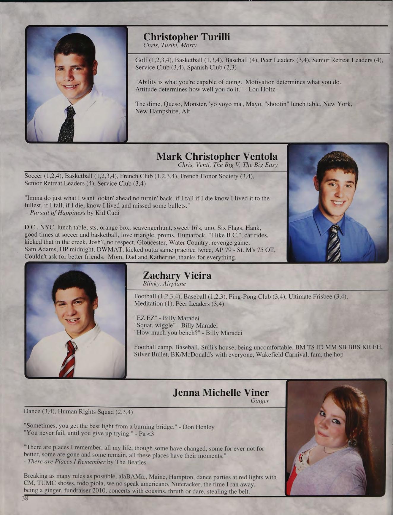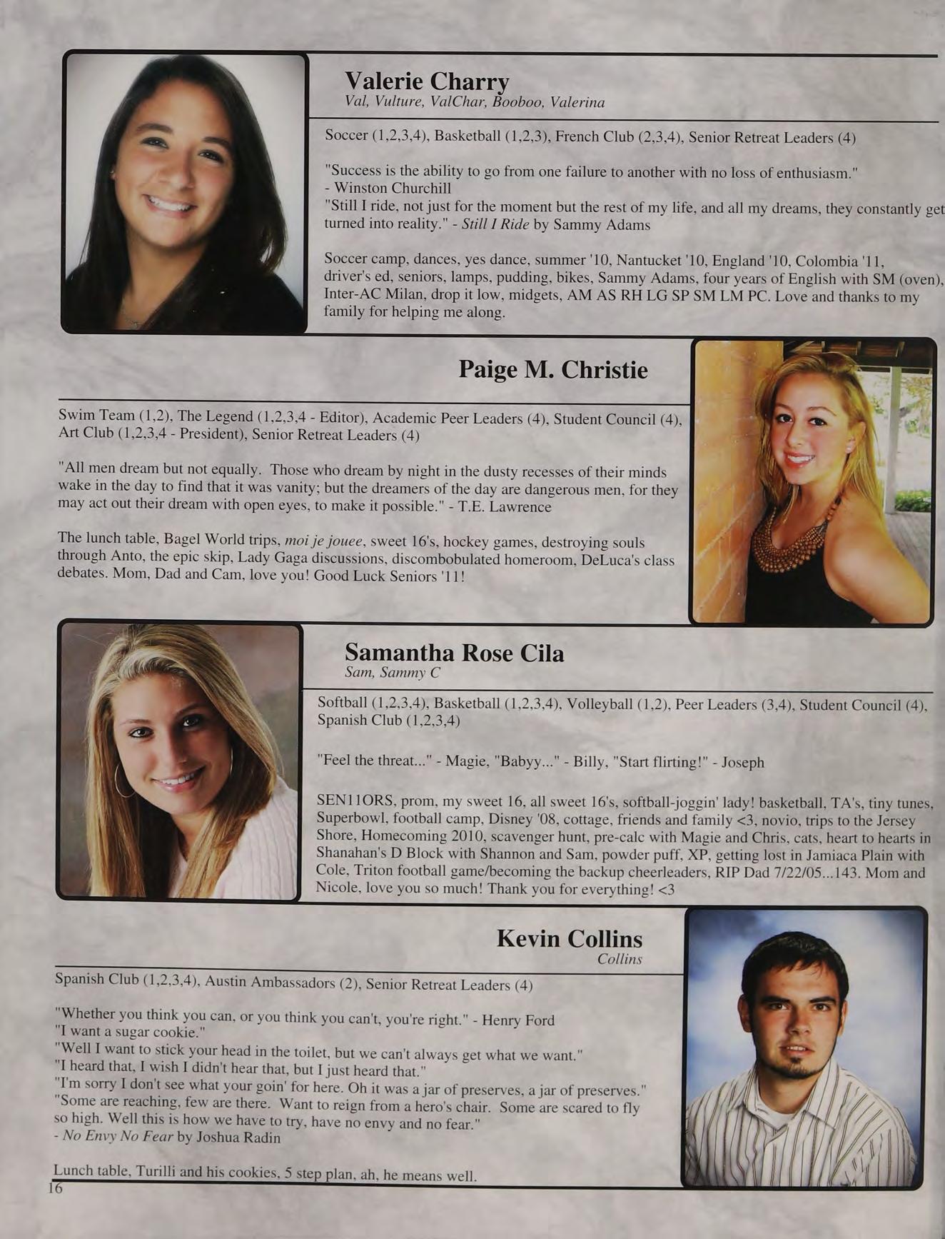 Val, Vulture, ValChar, Booboo, Valerina Soccer (1,2,3,4), Basketball (1,2,3), French Club (2,3,4), Senior Retreat Leaders (4)