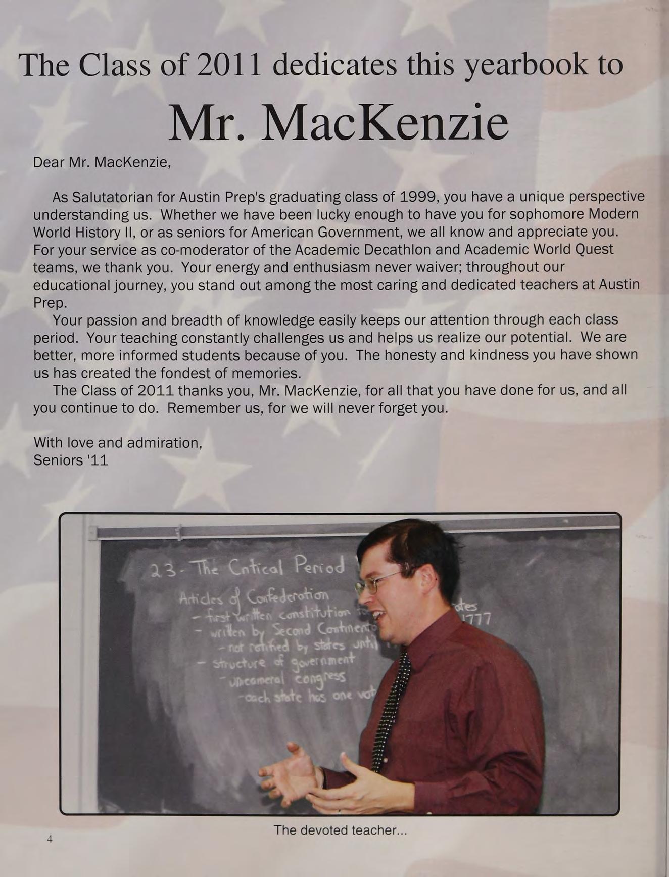 The Class of 2011 thanks you, Mr. MacKenzie, for all that you have done for us, and all you continue to do. Remember us, for we will never forget you.