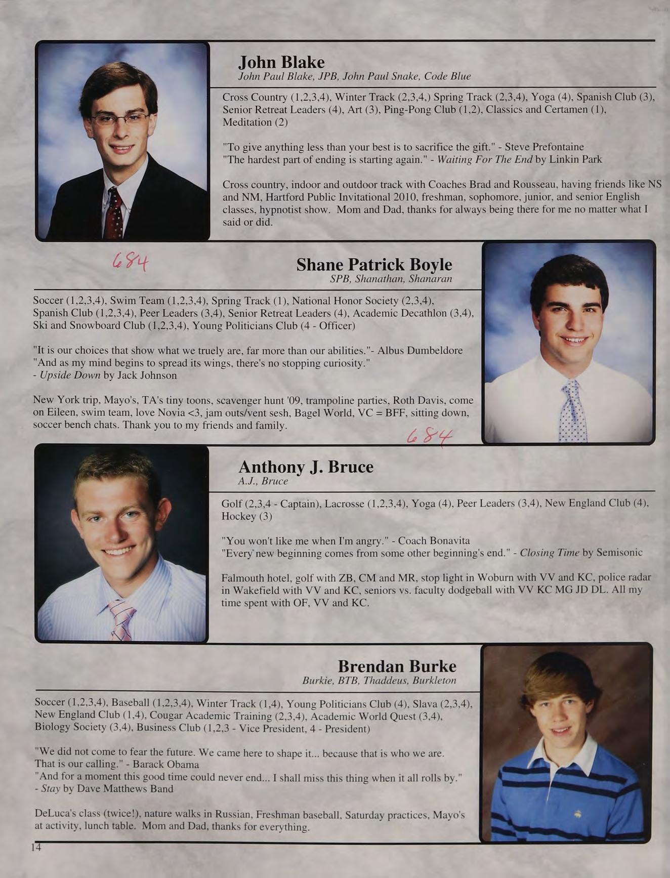 John Paul Blake, JPB, John Paul Snake, Code Blue Cross Country (1,2,3,4), Winter Track (2,3,4,) Spring Track (2,3,4), Yoga (4), Spanish Club (3), Senior Retreat Leaders (4), Art (3), Ping-Pong Club (1,2), Classics and Certamen (1), Meditation (2)