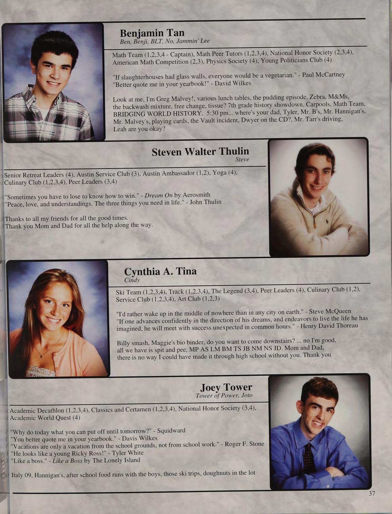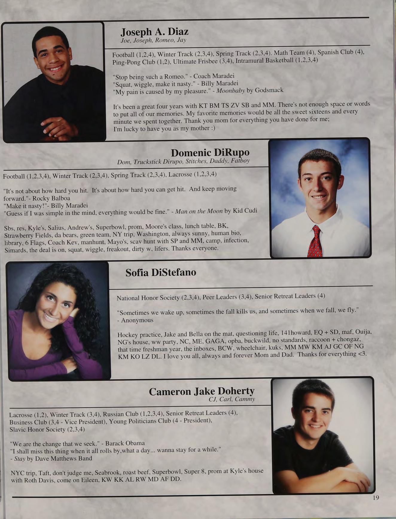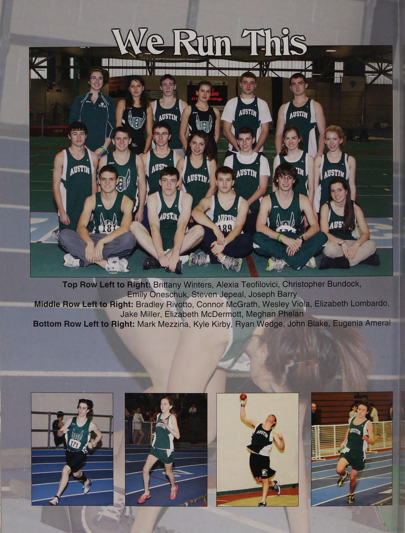 Cross country, indoor and outdoor track with Coaches Brad and Rousseau, having friends like NS and NM, Hartford Public Invitational 2010, freshman, sophomore, junior, and senior English classes, hypnotist show. Mom and Dad, thanks for always being there for me no matter what I said or did.