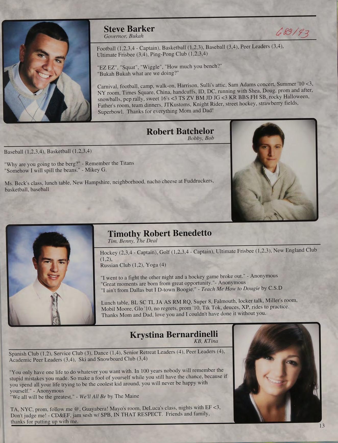 Football (1,2,3,4 - Captain), Basketball (1,2,3), Baseball (3,4), Peer Leaders (3,4), Ultimate Frisbee (3,4), Ping-Pong Club (1,2,3,4)