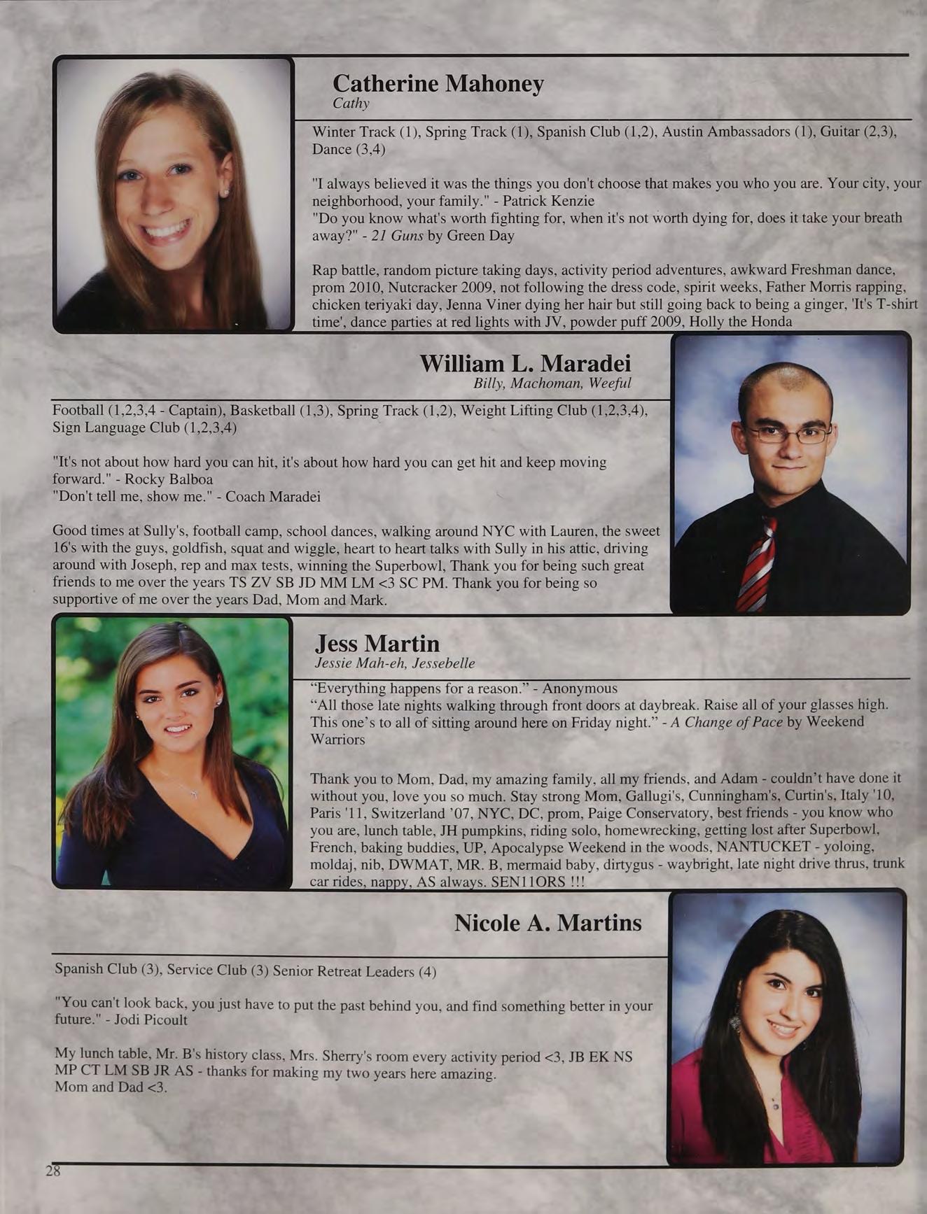 Winter Track (1,3,4), Spring Track (1,3,4), National Honor Society (2,3,4 - Senior Representative), National Latin Honor Society (2,3,4), Classics and Certamen (1,2,3,4 - Vice President), Peer Leaders (3,4 - President), Senior Retreat Leaders (4)