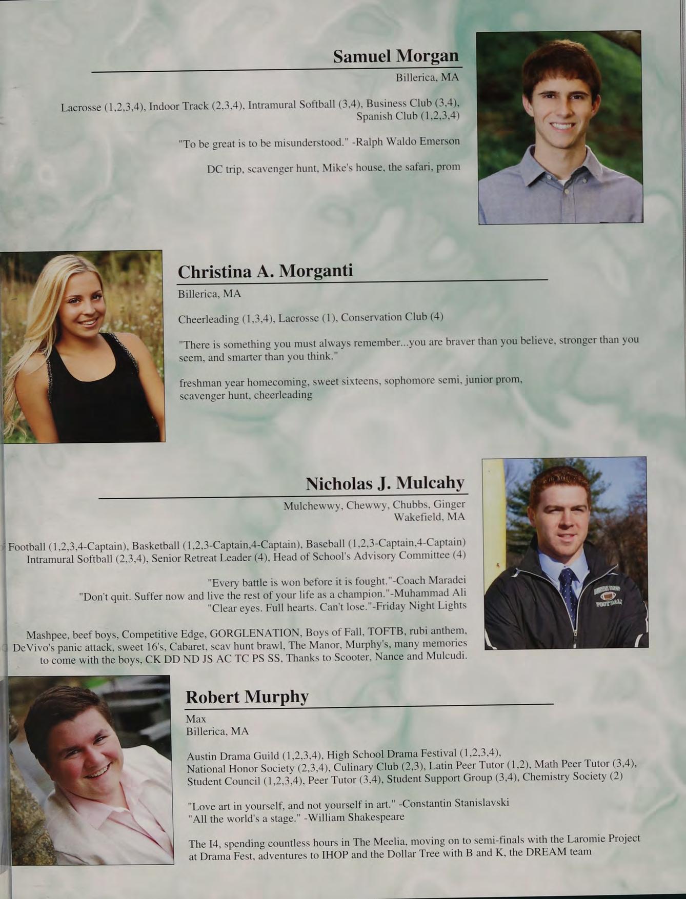 Football (1,2,3,4-Captain), Baseball (1,2,3,4), New England Club (1,2,3), Intramural Softball (1,2,3.4), Senior Retreat Leader (4)