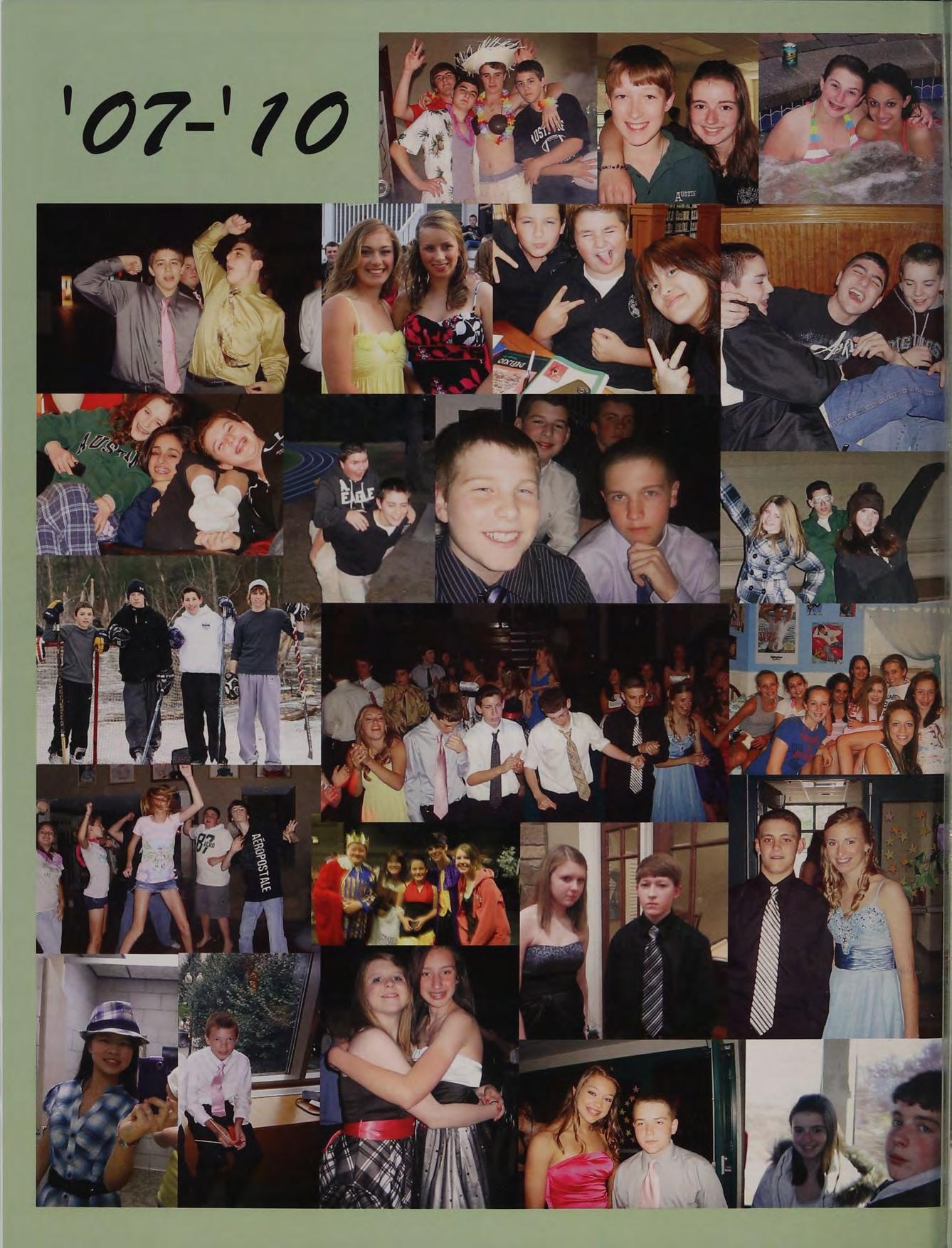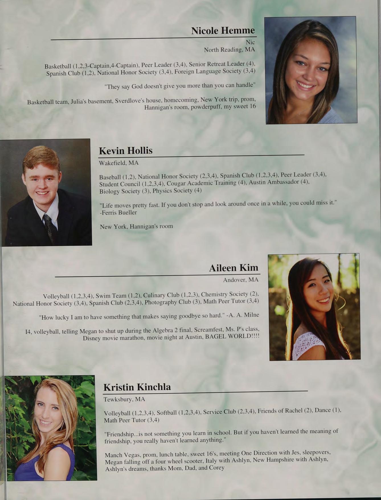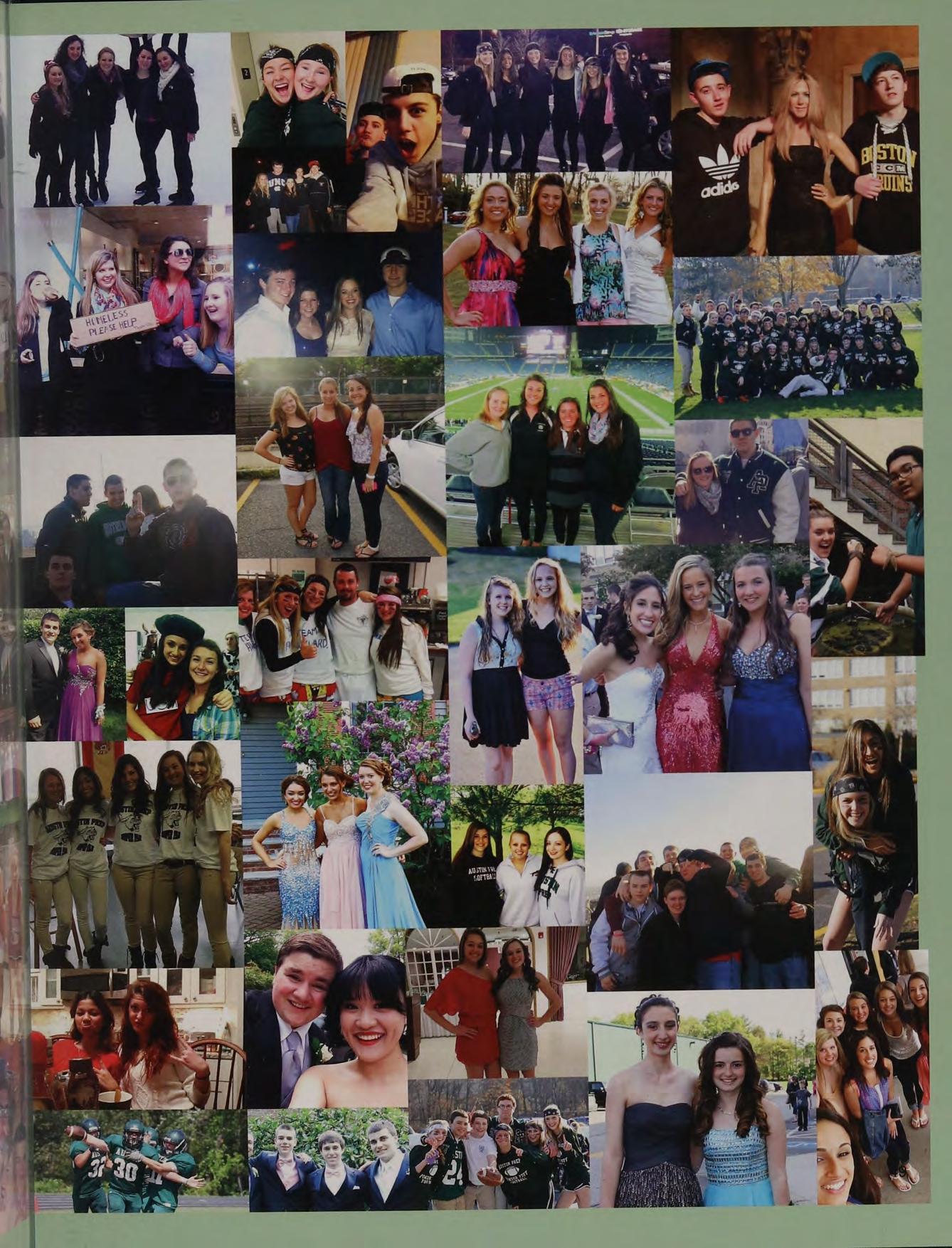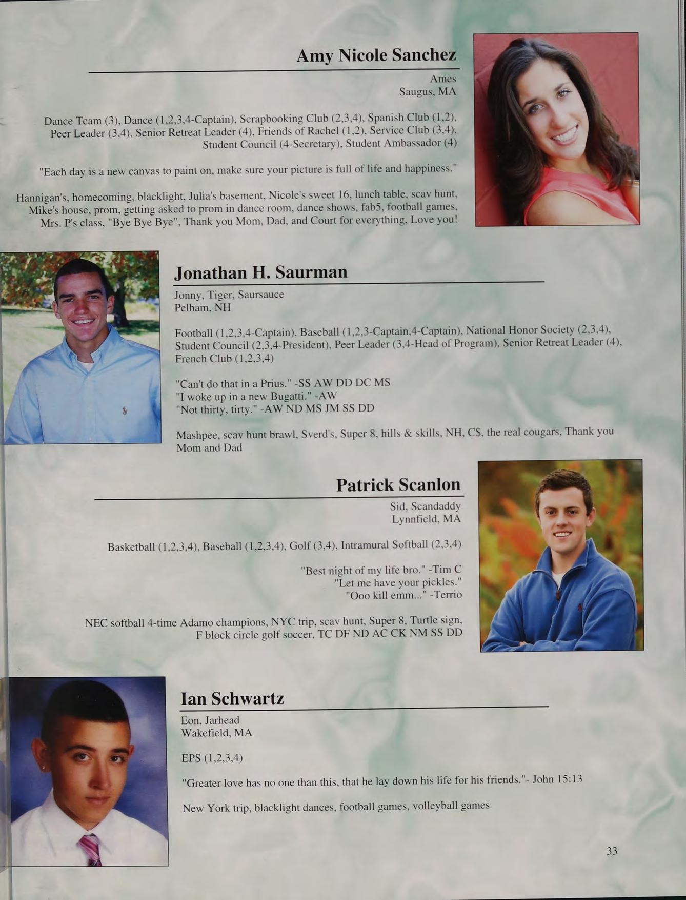 lunch table with the boys NM CK ND JS TC PS and AC, hanging out at Nick and Stos' houses, NY trip, CEOs, scav hunt, sweet 16's, blacklight dances, scav hunt brawl, squad, football at Father Seymour Field, game 2 at the Red Sox, prom with Mel, Coach D