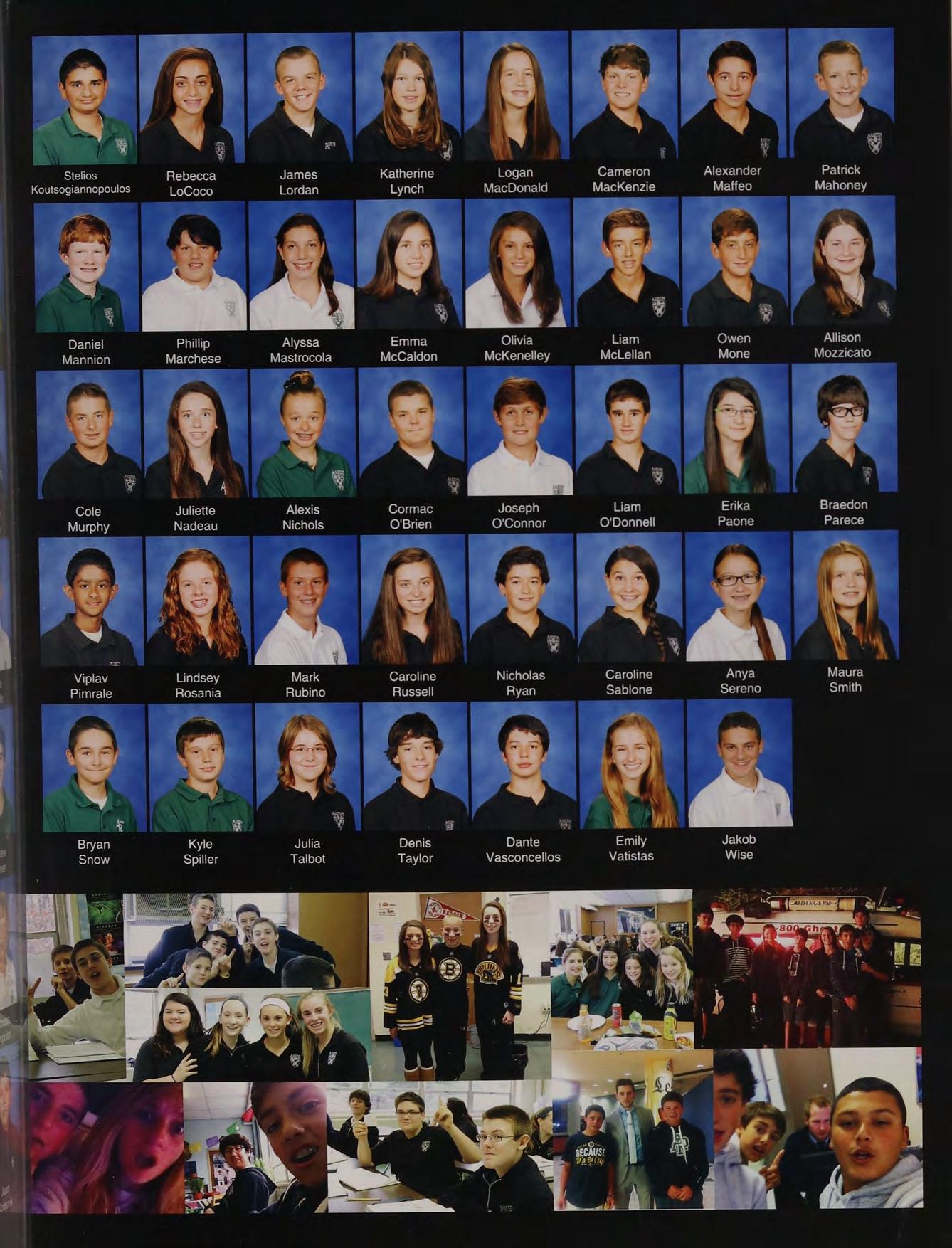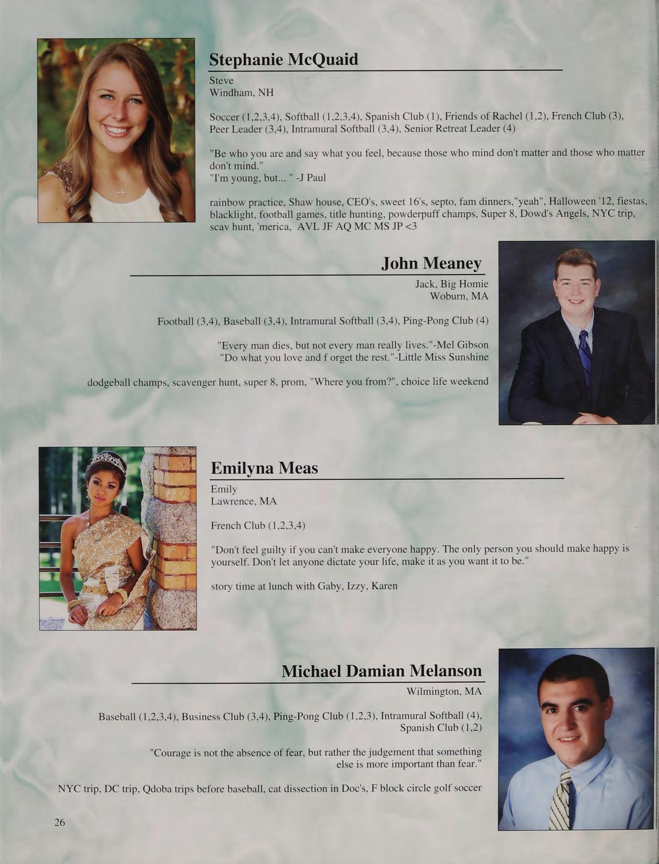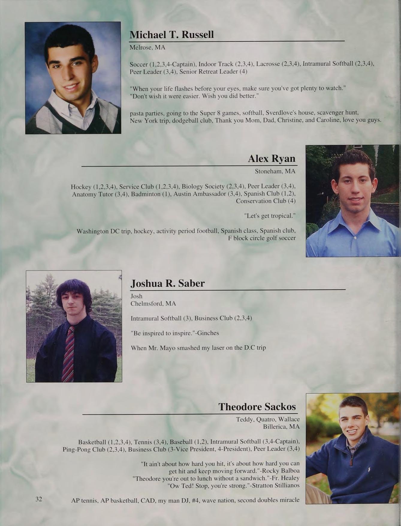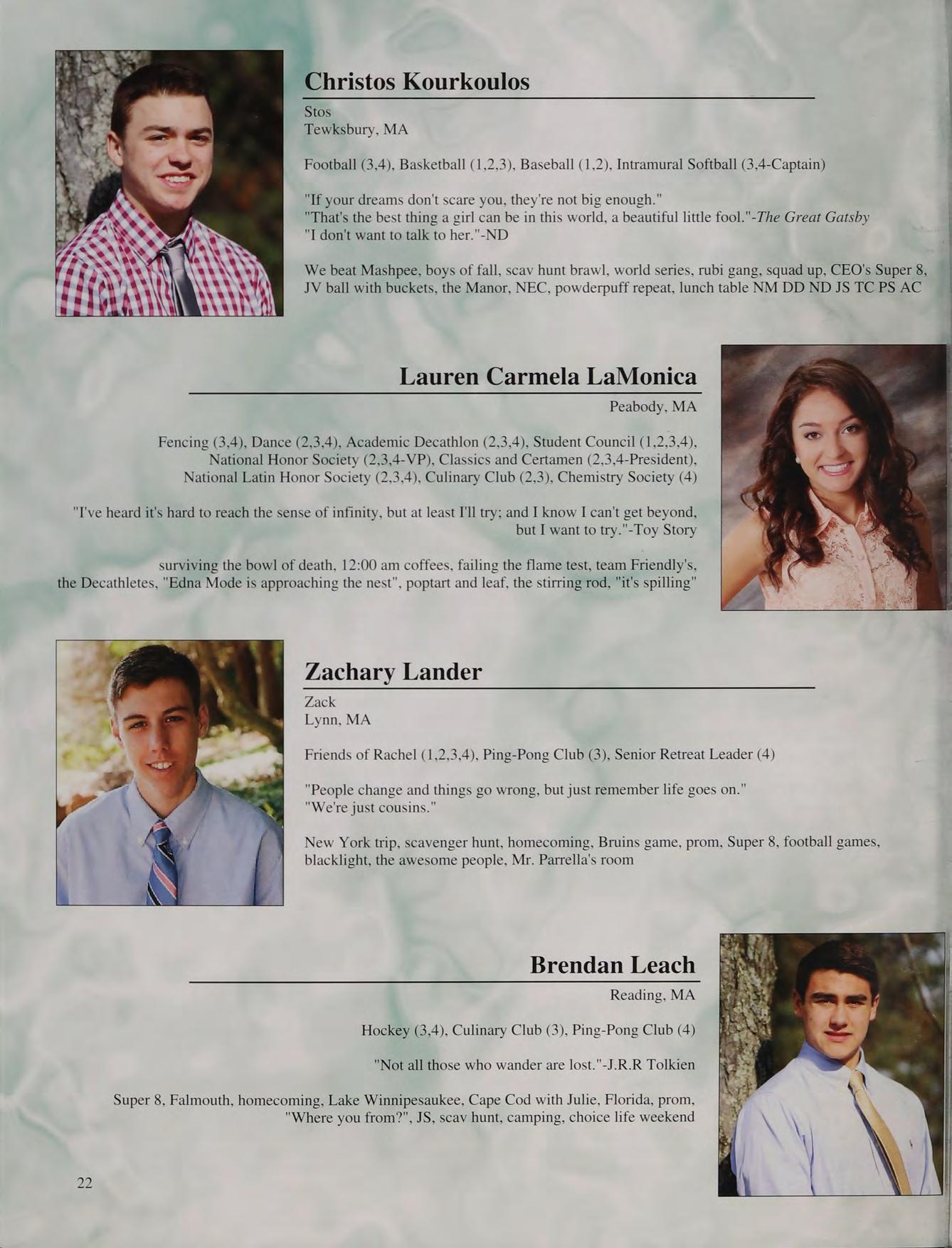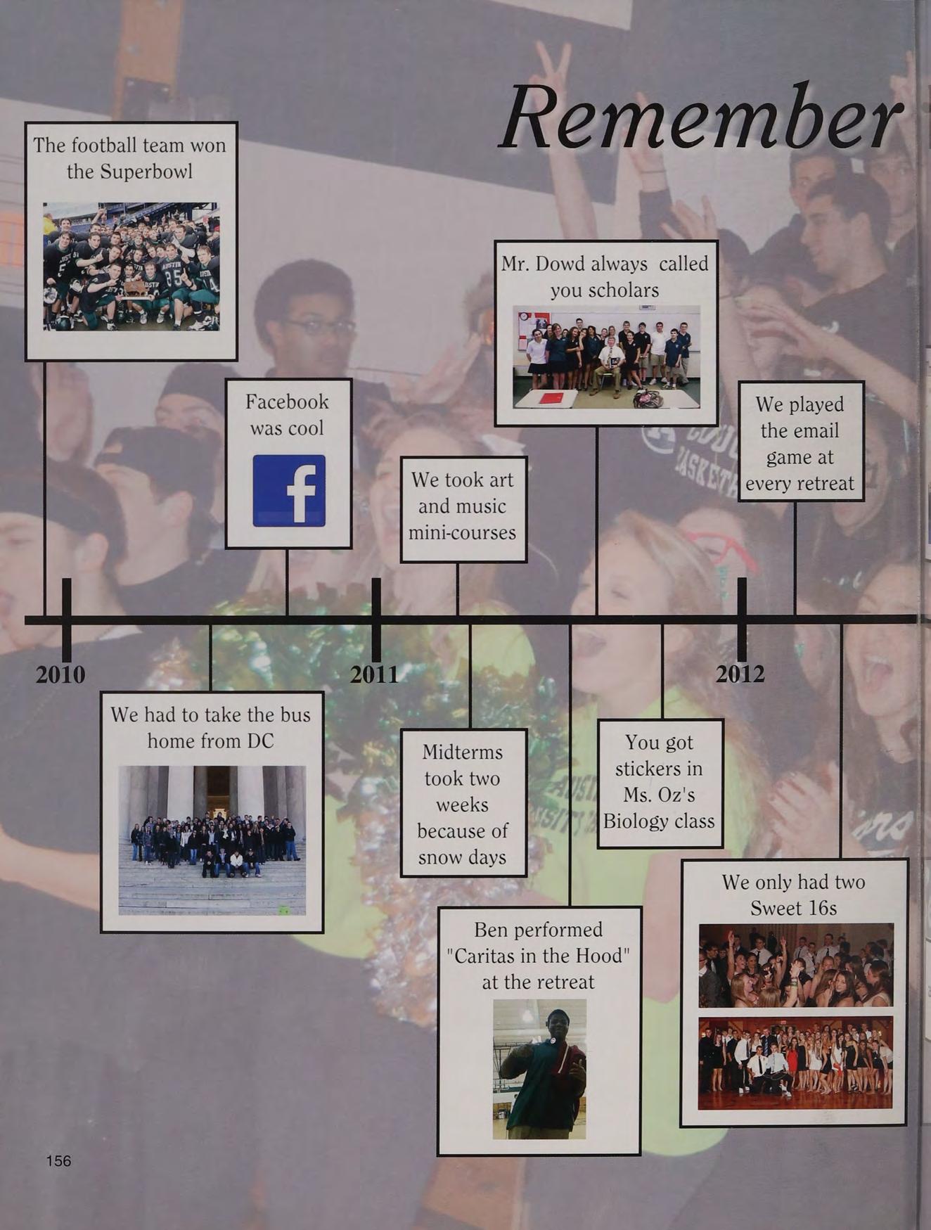 lunch table with the boys NM CK ND JS TC PS and AC, hanging out at Nick and Stos' houses, NY trip, CEOs, scav hunt, sweet 16's, blacklight dances, scav hunt brawl, squad, football at Father Seymour Field, game 2 at the Red Sox, prom with Mel, Coach D