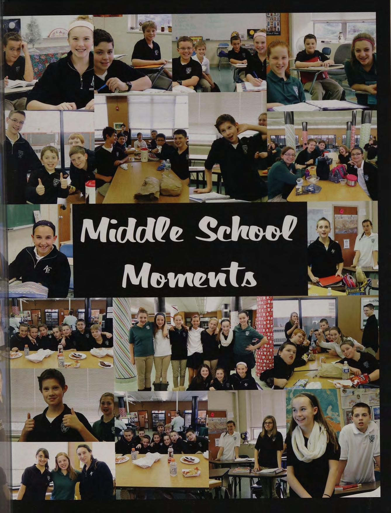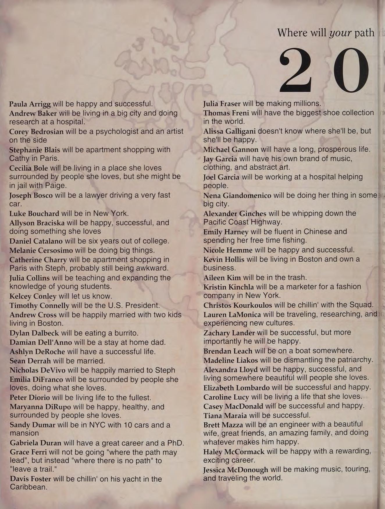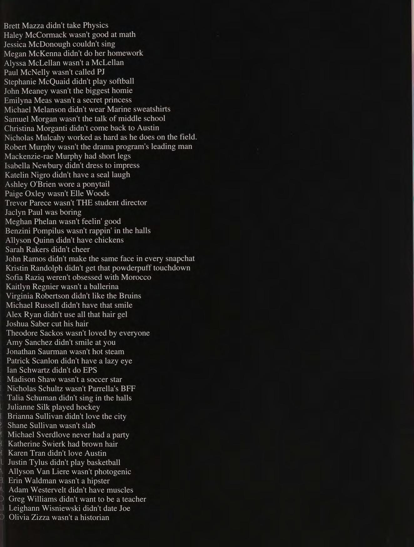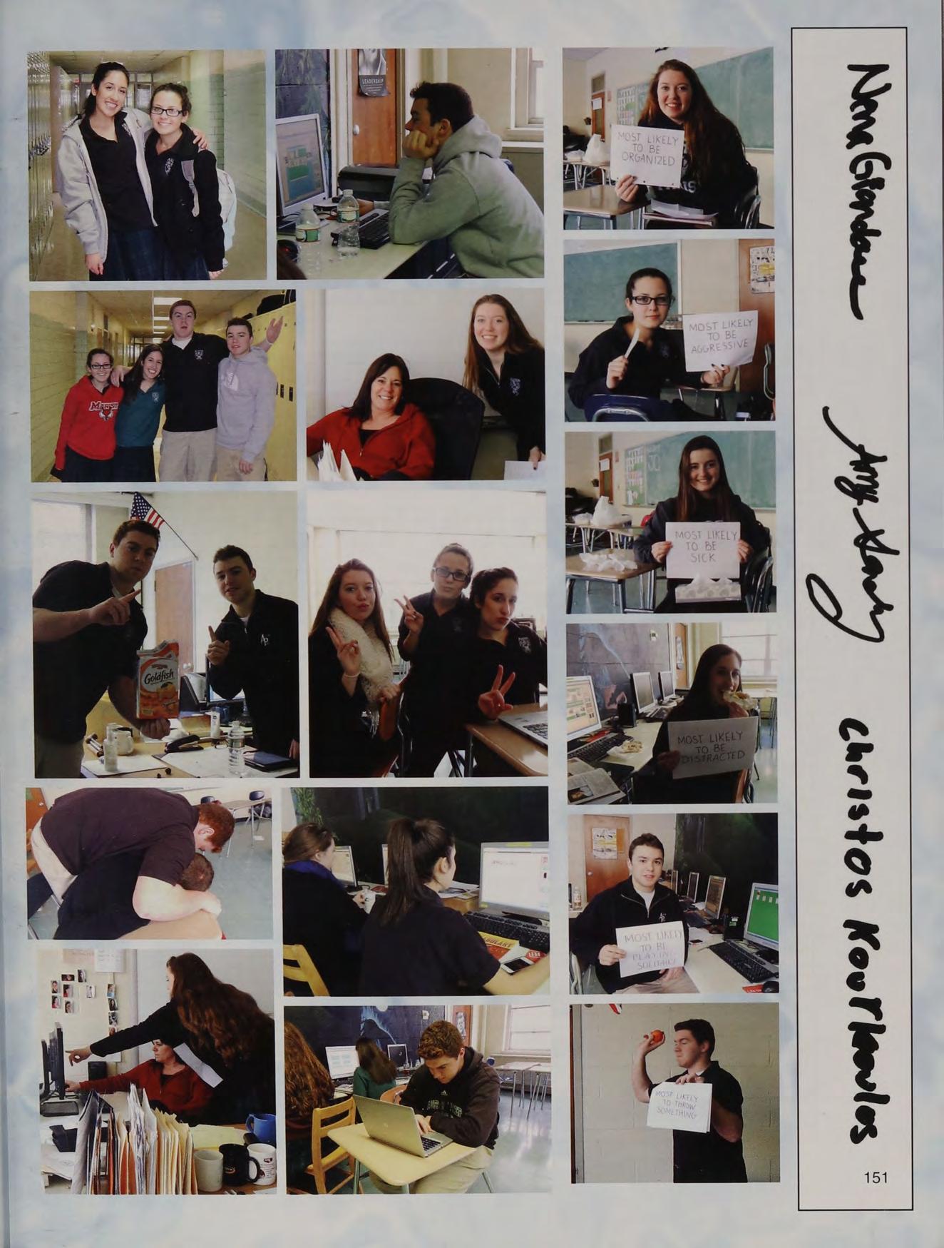 lunch table with the boys NM CK ND JS TC PS and AC, hanging out at Nick and Stos' houses, NY trip, CEOs, scav hunt, sweet 16's, blacklight dances, scav hunt brawl, squad, football at Father Seymour Field, game 2 at the Red Sox, prom with Mel, Coach D