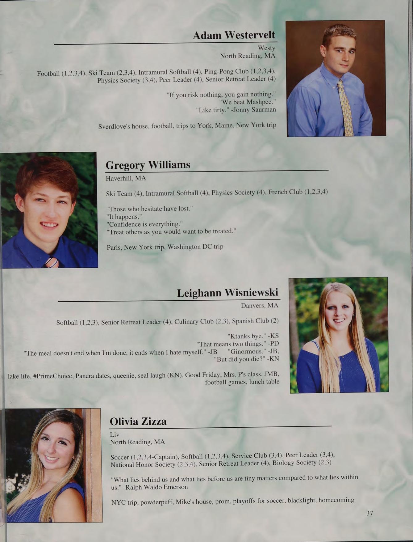 Football (1,2,3,4-Captain), Ski Team (2,4), Peer Leader (3,4-Officer), Ping-Pong Club (1,2,3,4)