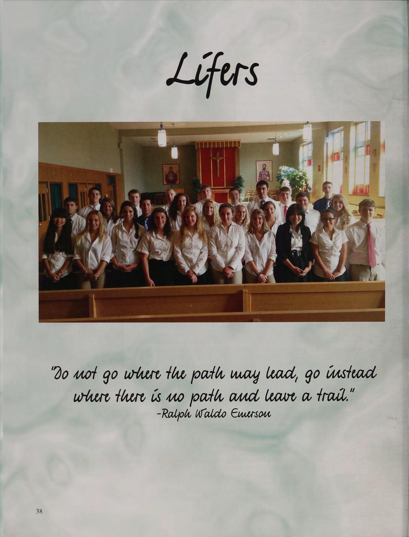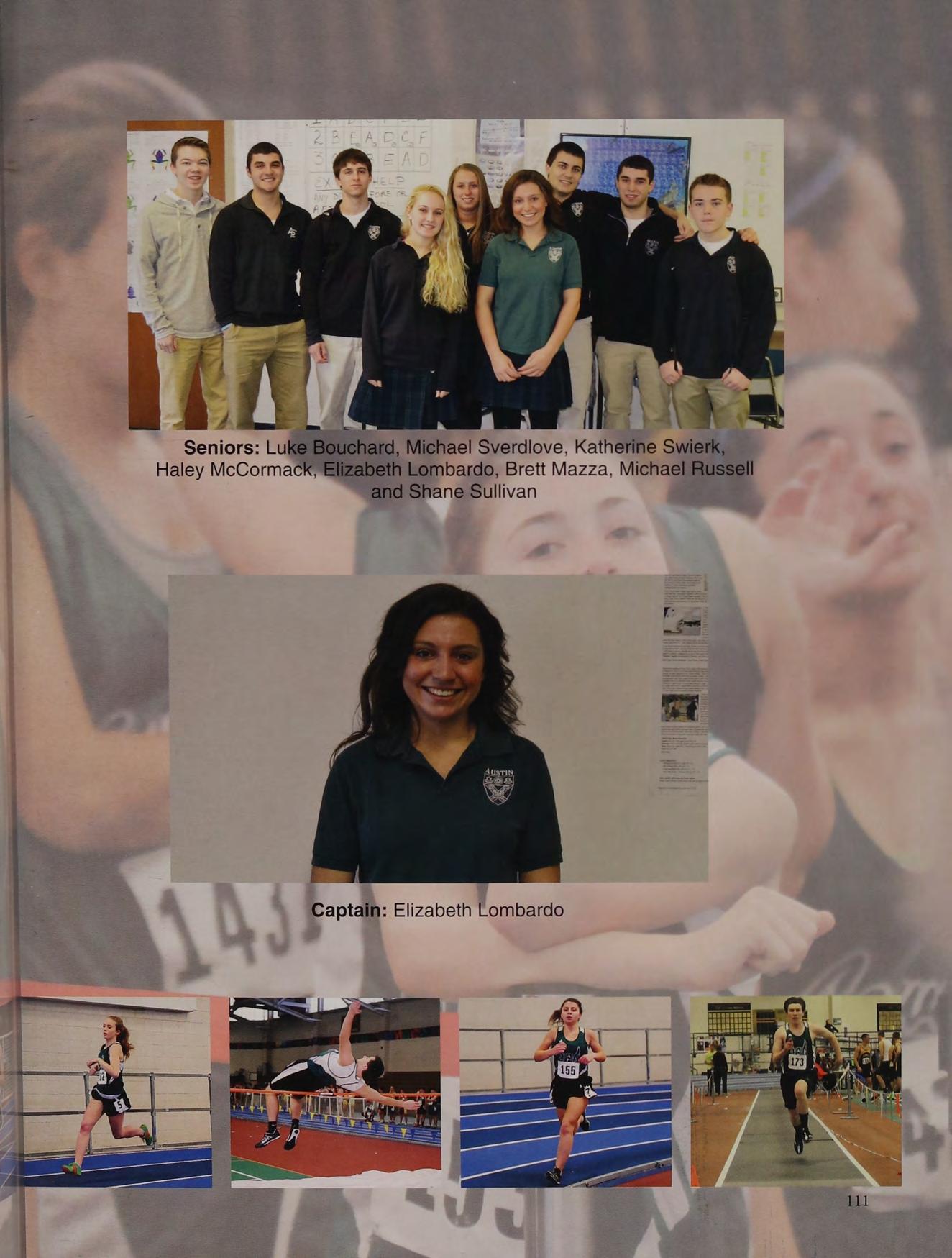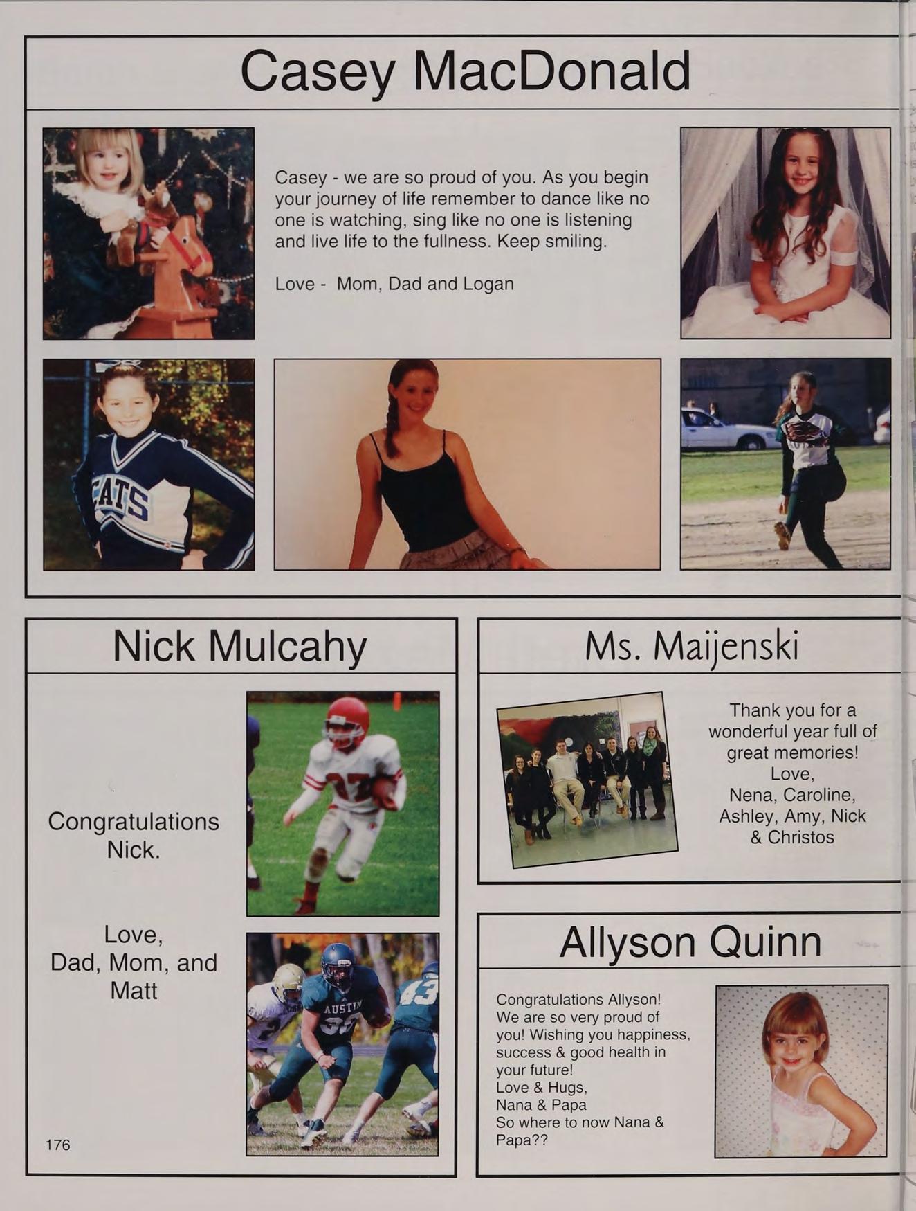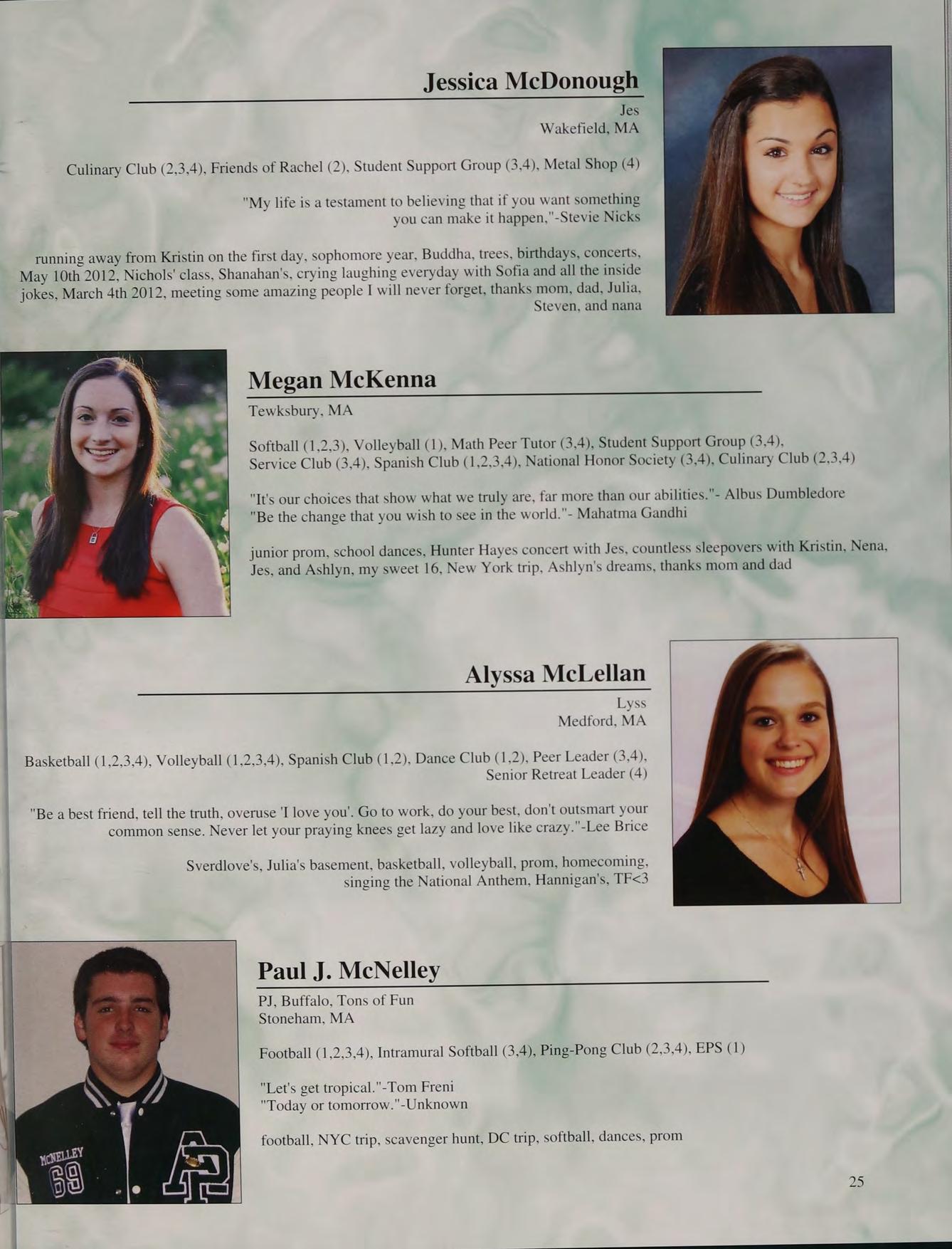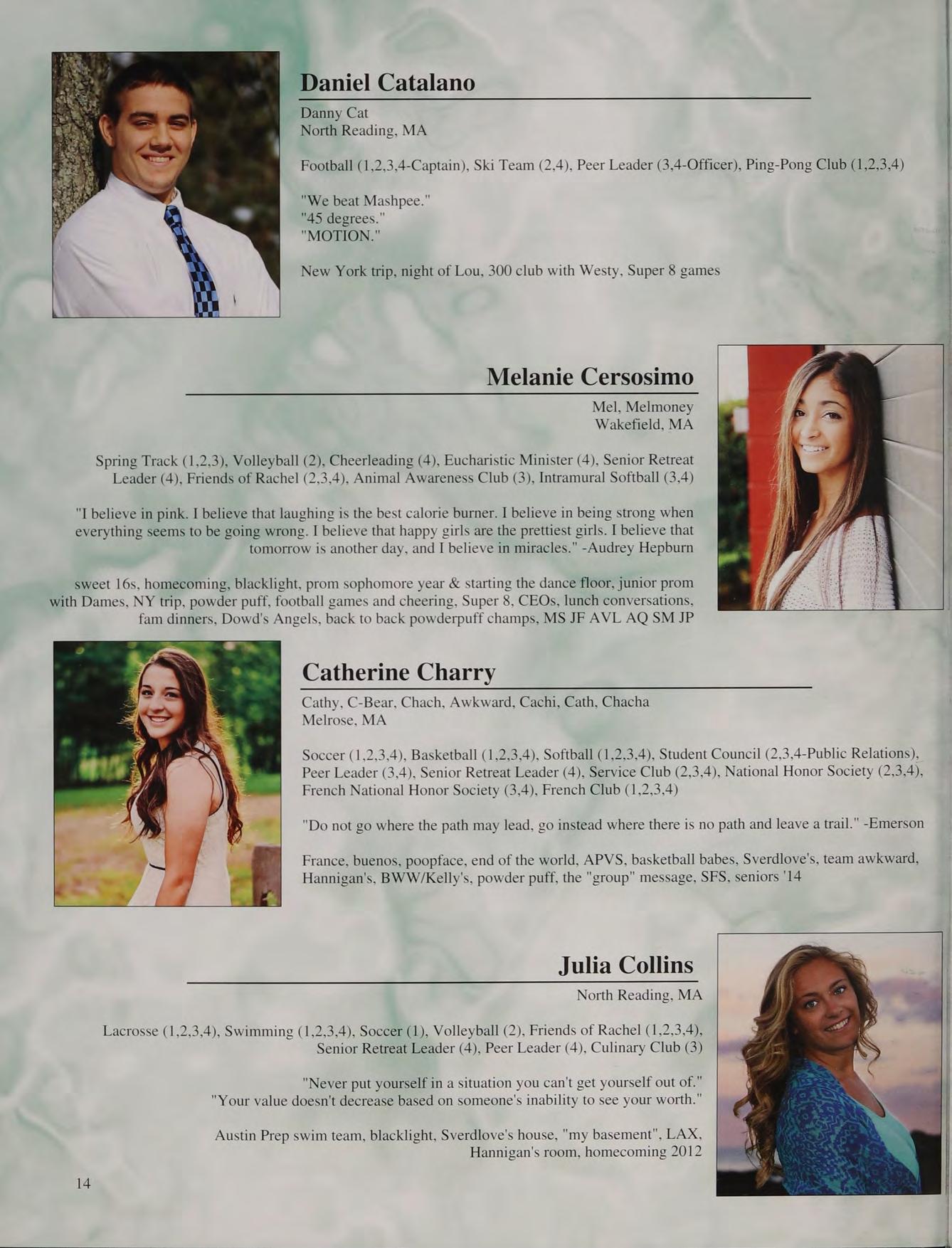 Spring Track (1,2,3), Volleyball (2), Cheerleading (4), Eucharistic Minister (4), Senior Retreat Leader (4), Friends of Rachel (2,3,4), Animal Awareness Club (3), Intramural Softball (3,4)
