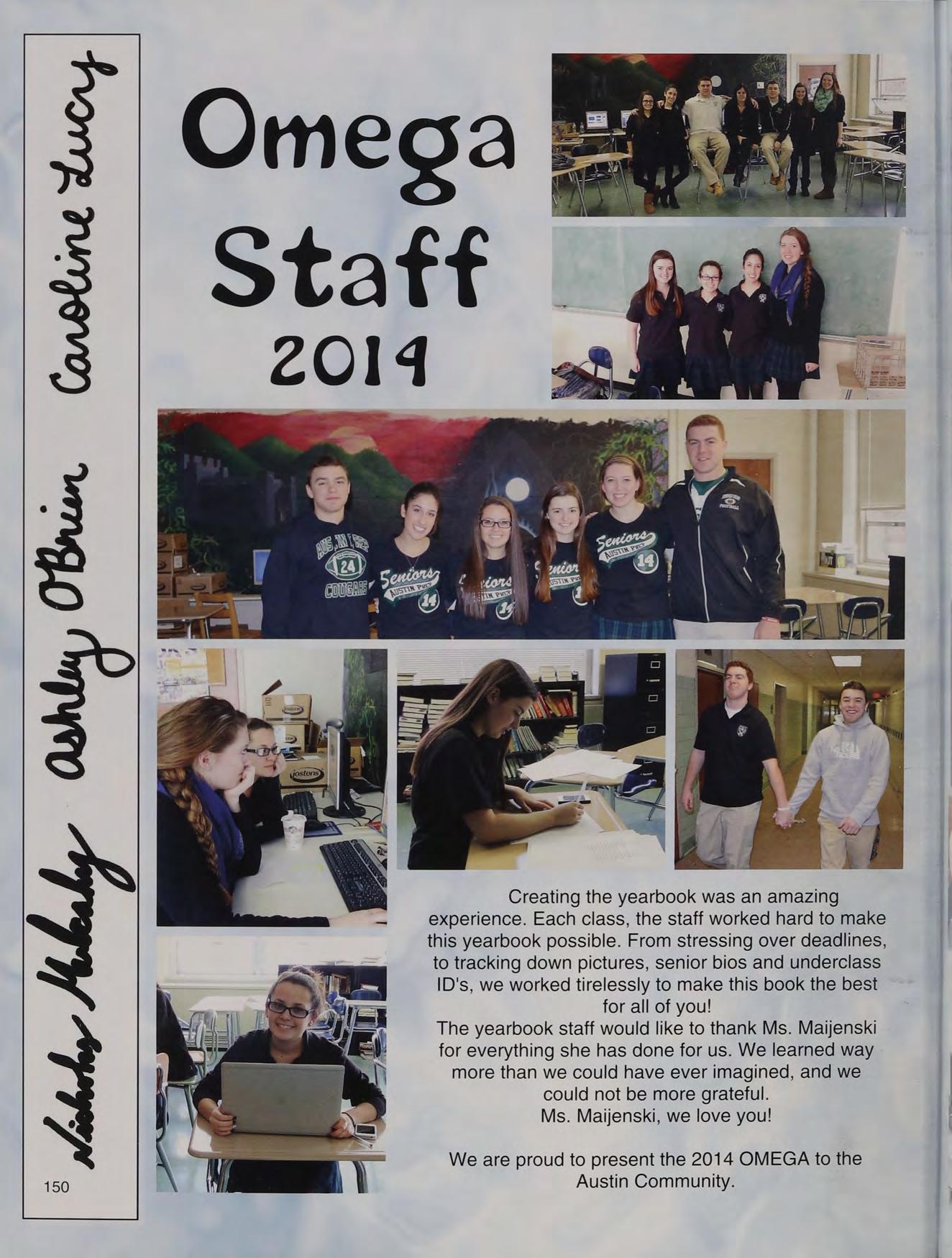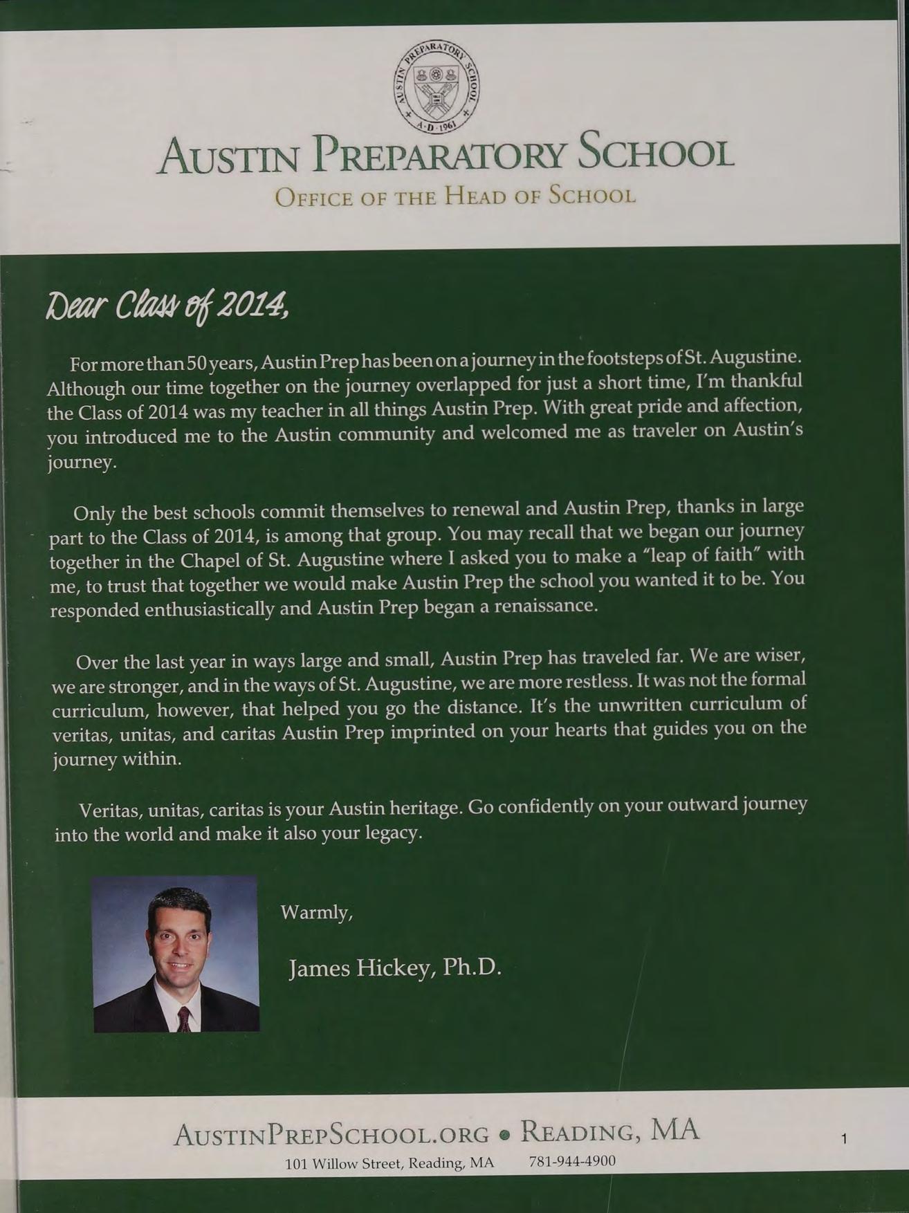 For more than 50years, Austin Prep has been onajourney in the footsteps of St. Augustine. Although our time together on the journey overlapped for just a short time, I’m thankful the Class of 2014 was my teacher in all things Austin Prep. With great pride and affection, you introduced me to the Austin community and welcomed me as traveler on Austin’s journey.