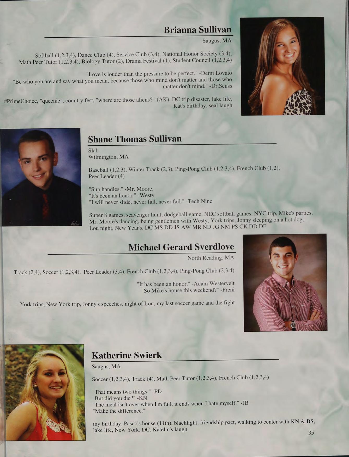 Swimming (1,2,3,4), Senior Retreat Leader (4), Volleyball (2), Culinary Club (2,3,4), Spanish Club (1,2), Student Support Group (3,4), Chemistry Society (2)