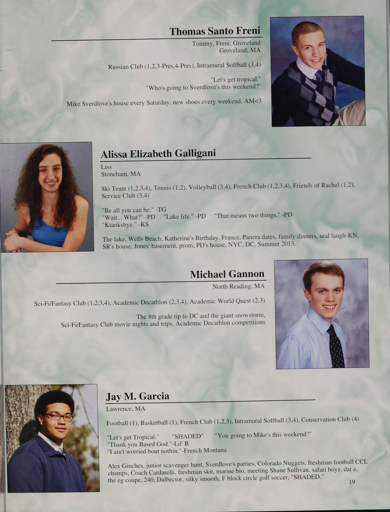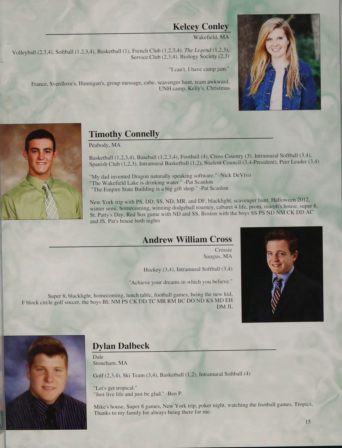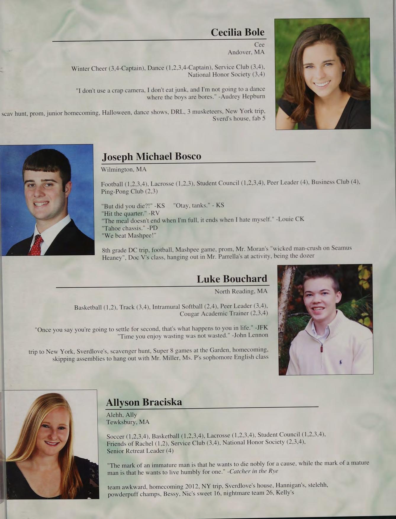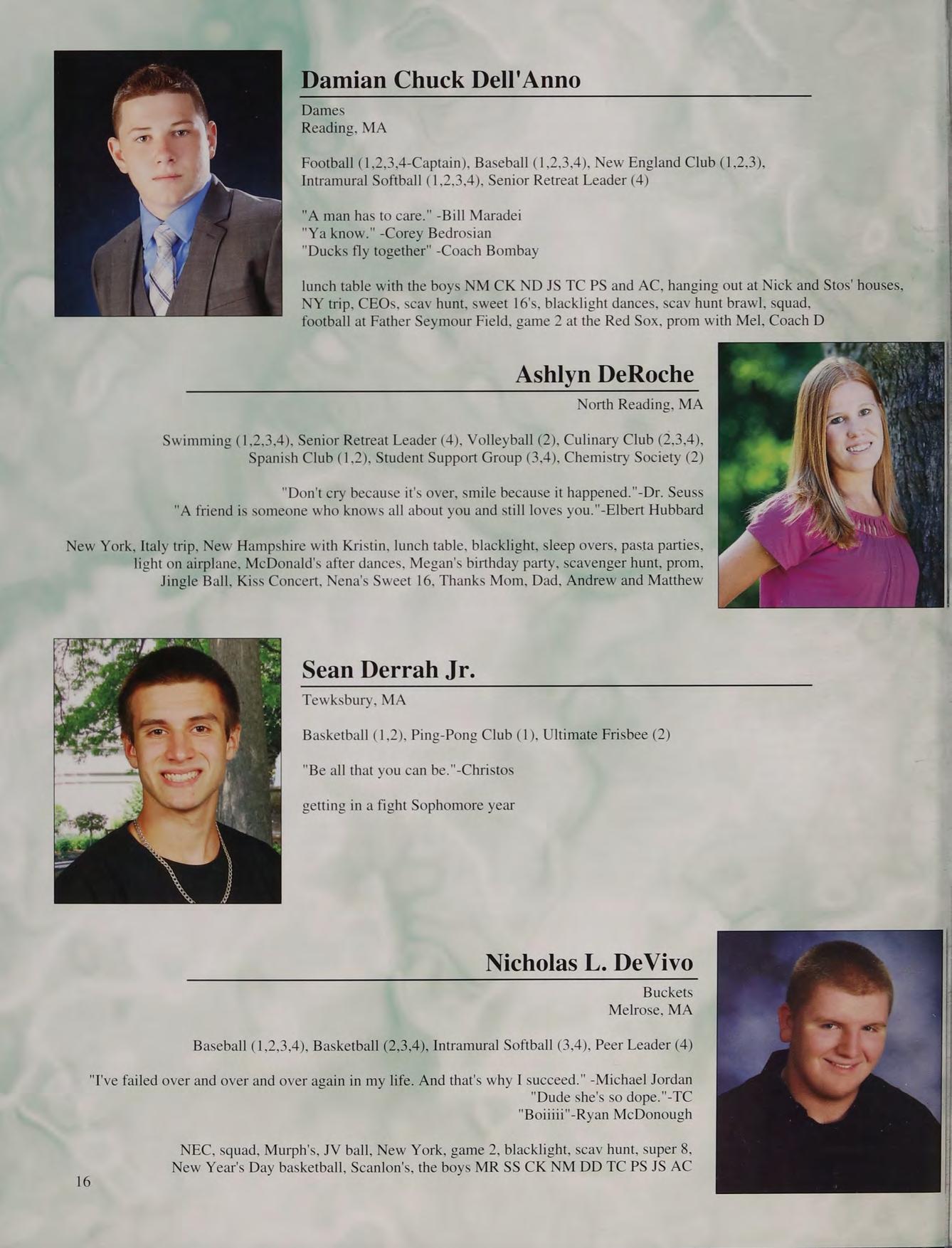 8th grade DC trip, football, Mashpee game, prom, Mr. Moran's "wicked man-crush on Seamus Heaney", Doc V's class, hanging out in Mr. Parrella’s at activity, being the dozer