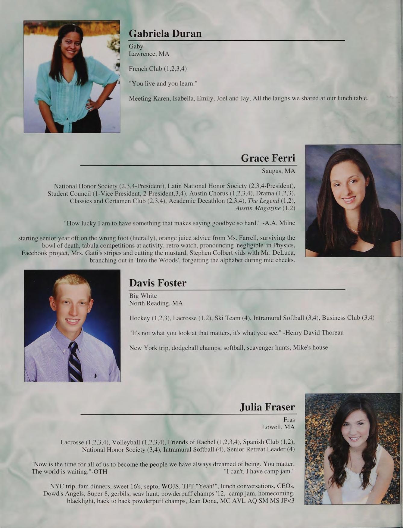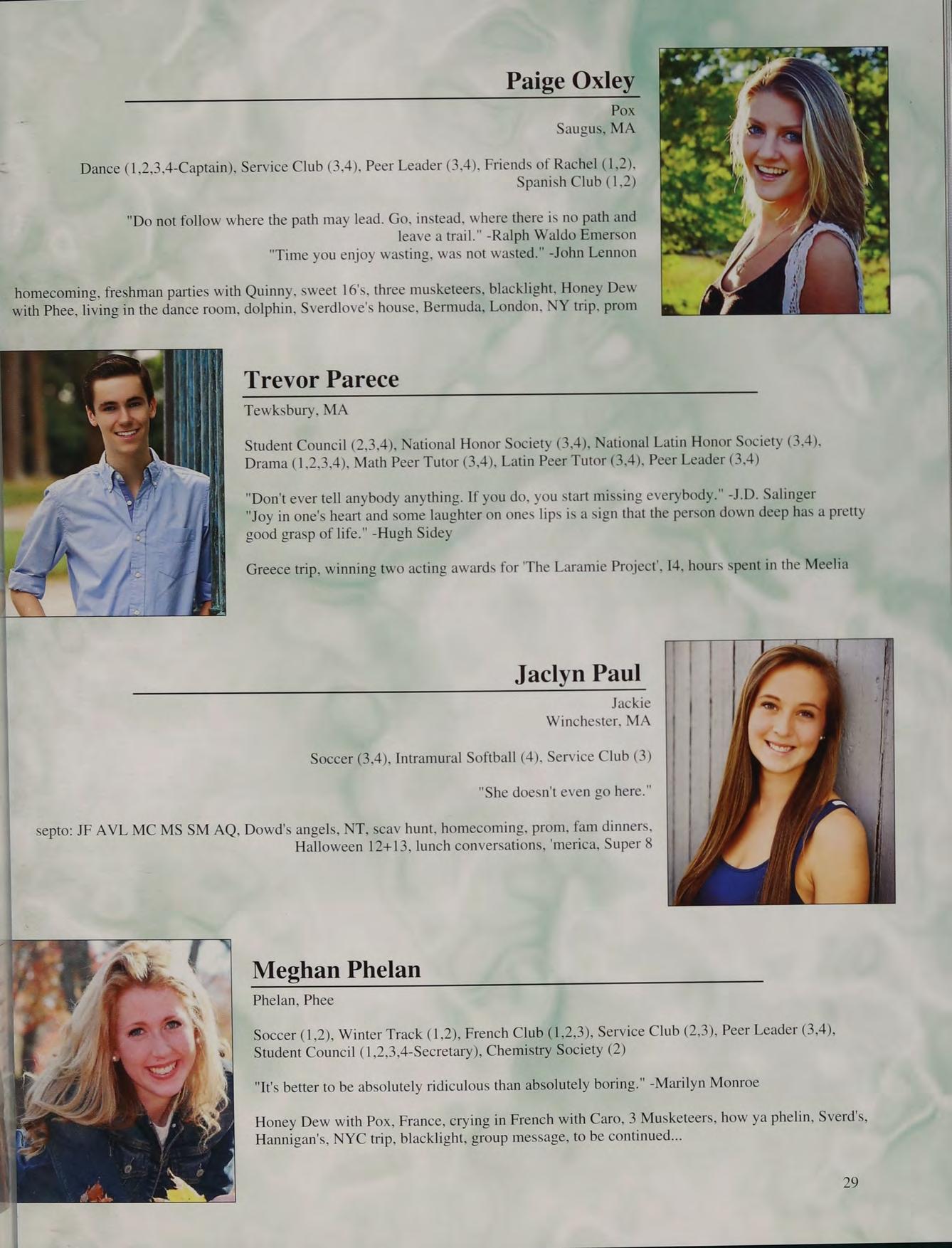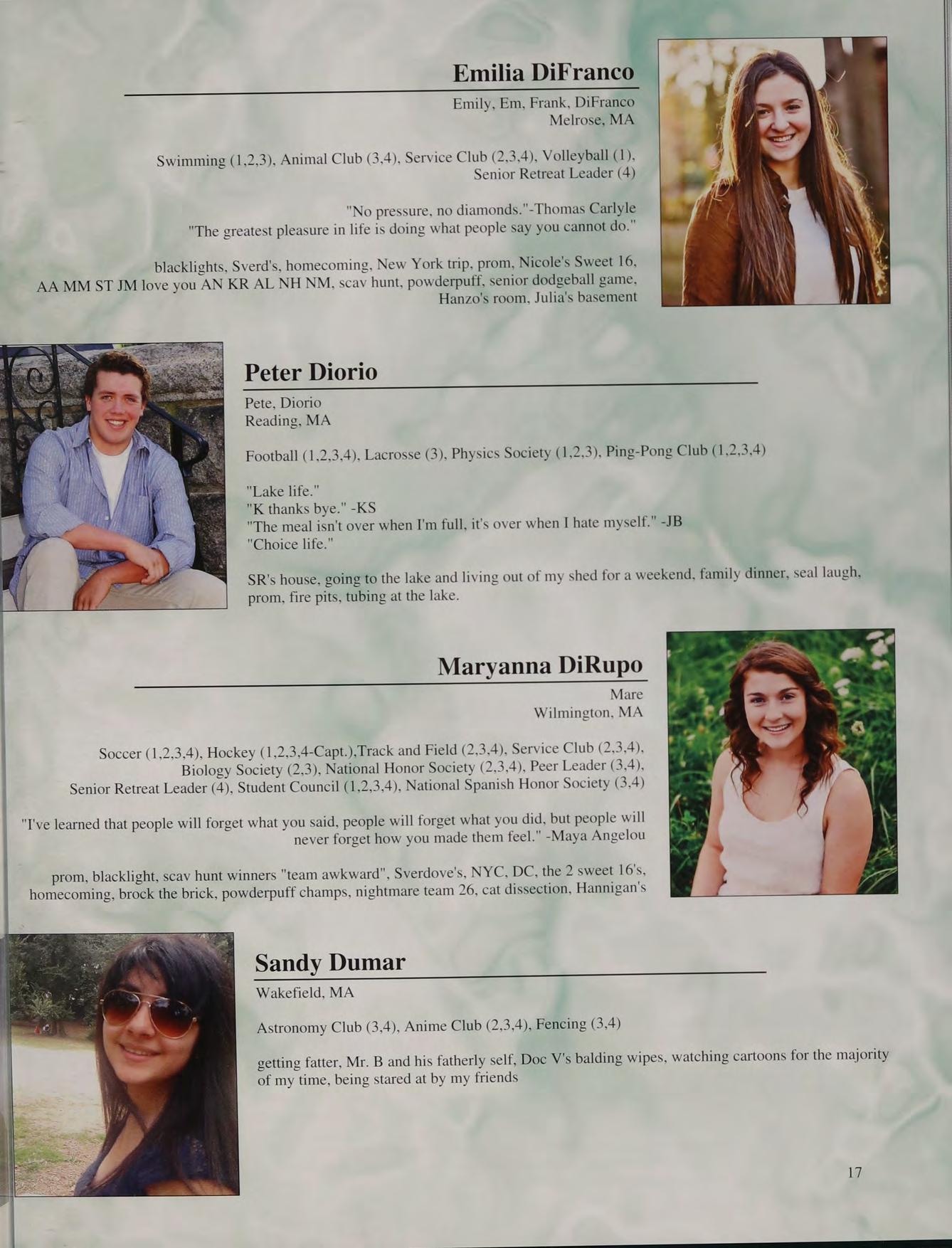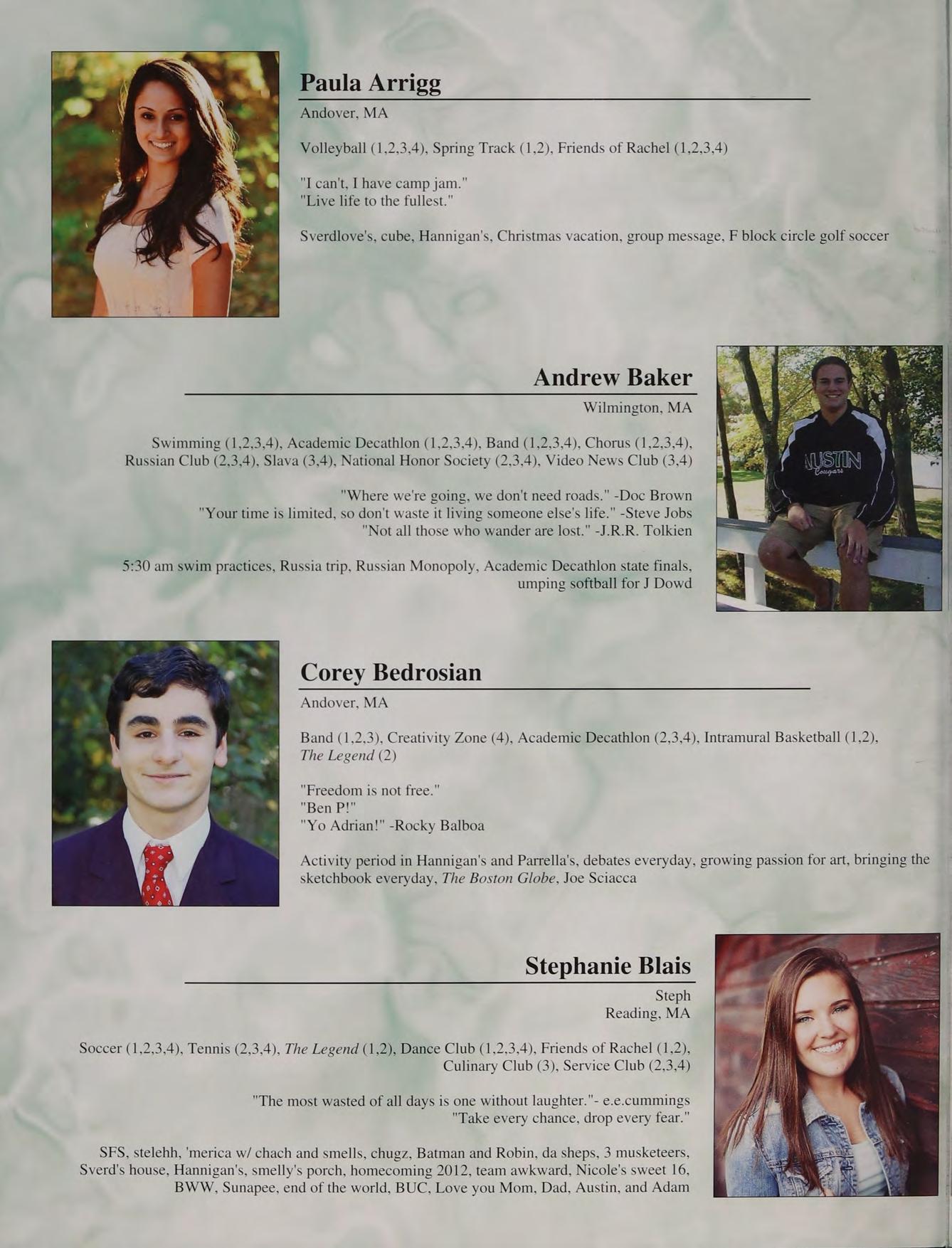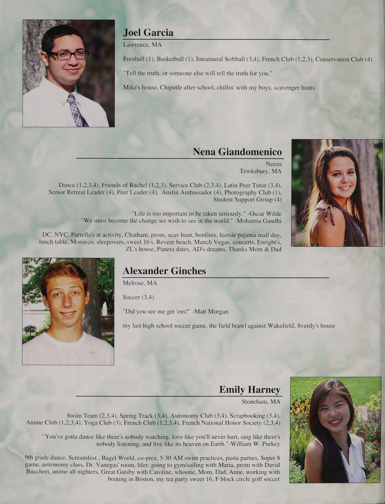 8th grade DC trip, football, Mashpee game, prom, Mr. Moran's "wicked man-crush on Seamus Heaney", Doc V's class, hanging out in Mr. Parrella’s at activity, being the dozer