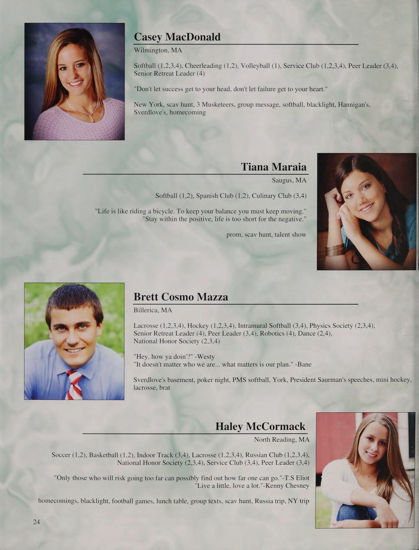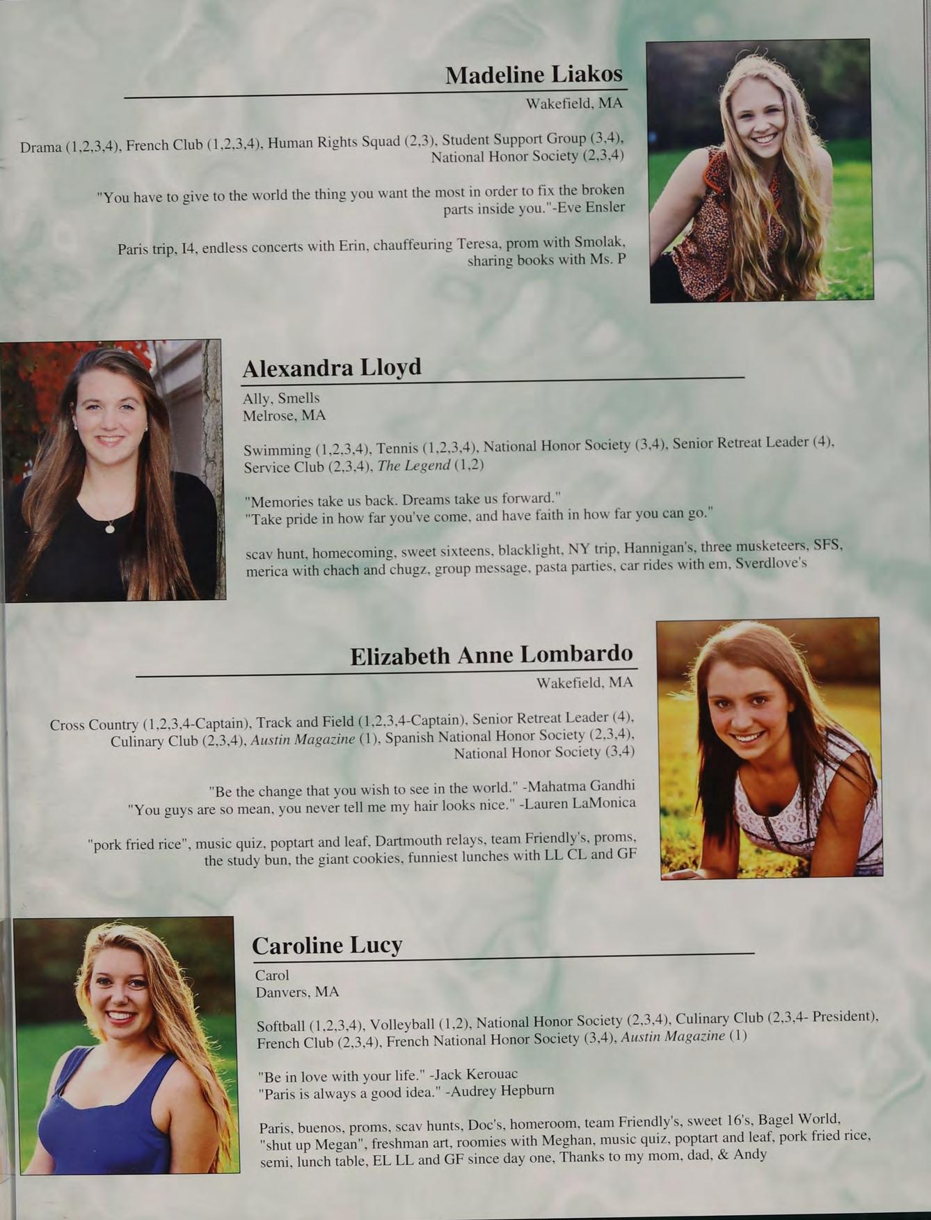 Soccer (1.2,3,4), Basketball (1,2,3,4), Lacrosse (1,2,3,4), Student Council (1,2,3,4), Friends of Rachel (1,2), Service Club (3,4), National Honor Society (2,3,4), Senior Retreat Leader (4)