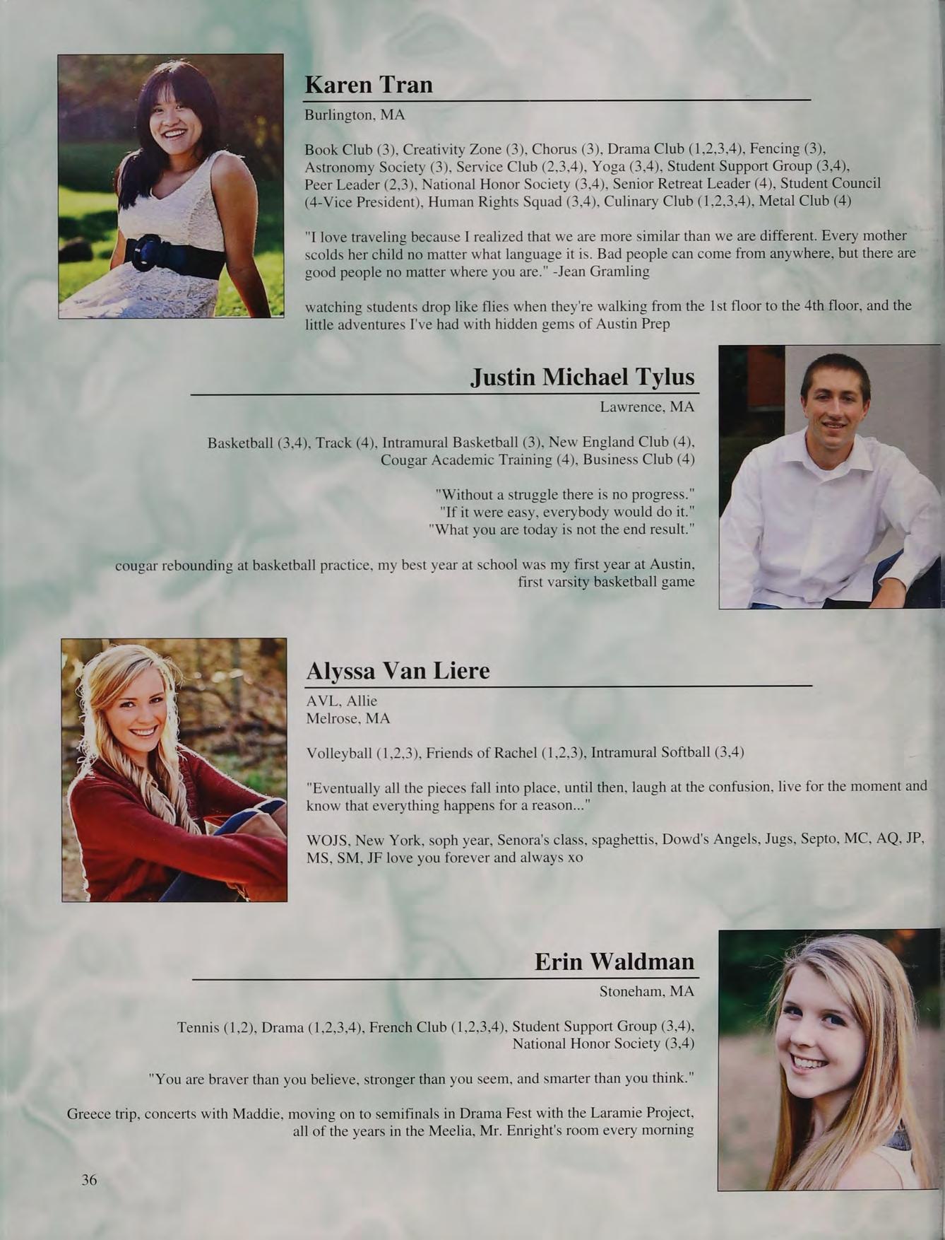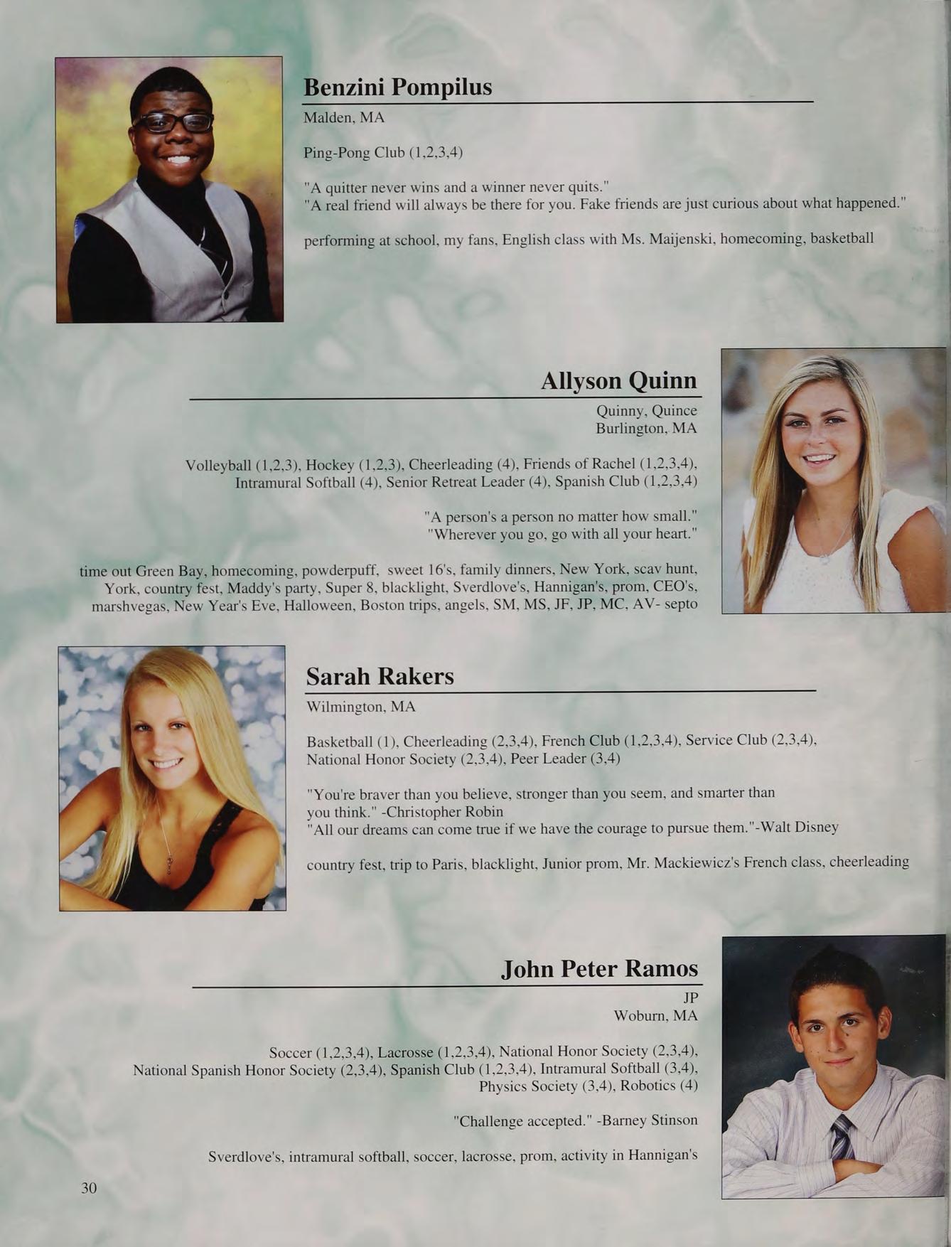 Volleyball (2.3.4), Softball (1.2.3.4), Basketball (1), French Club (1,2,3,4), The Legend (1,2,3), Service Club (2.3.4), Biology Society (2,3)