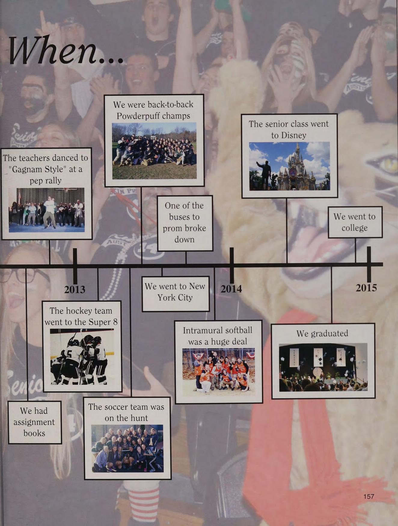 sweet 16s, homecoming, blacklight, prom sophomore year & starting the dance floor, junior prom with Dames, NY trip, powder puff, football games and cheering, Super 8, CEOs, lunch conversations, fam dinners, Dowd's Angels, back to back powderpuff champs, MS JF AVL AQ SM JP