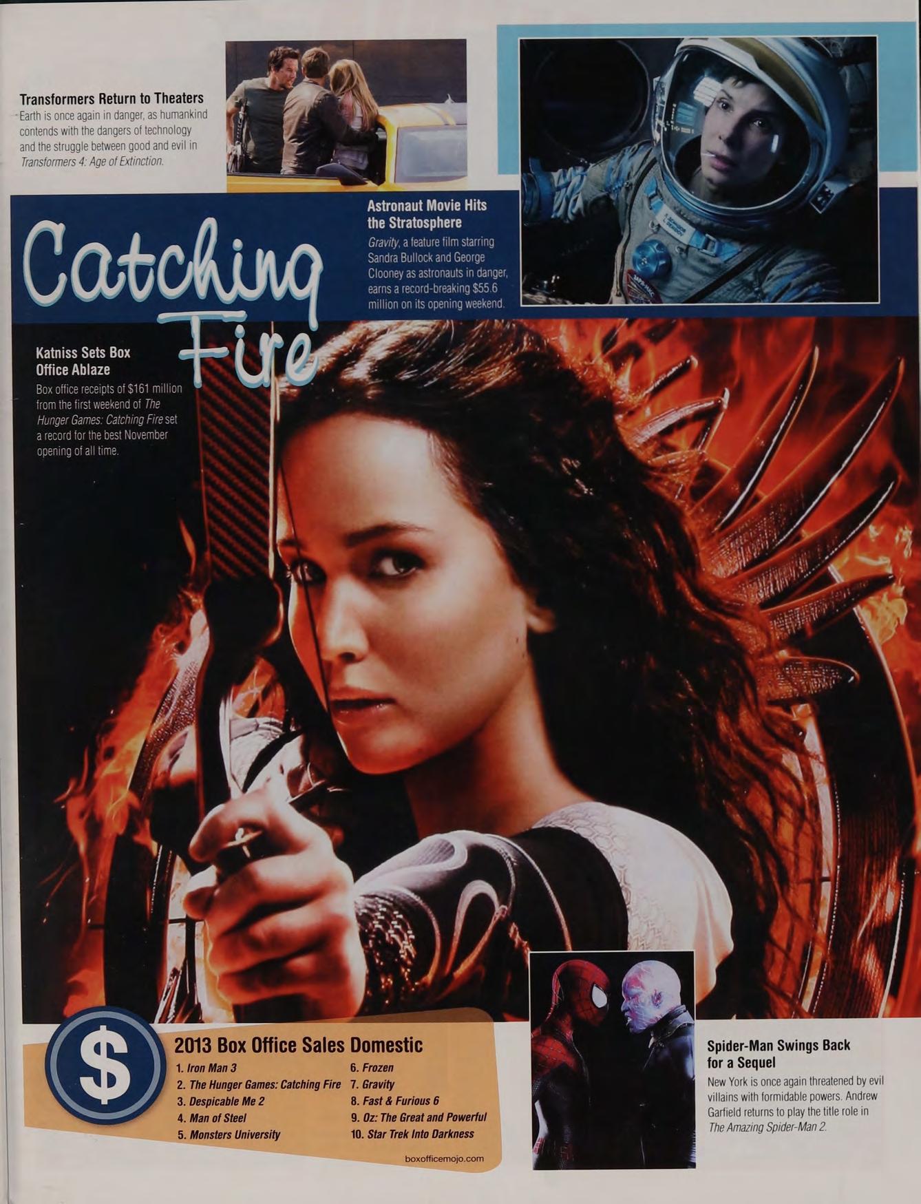 Sets Box Office Ablaze Box office receipts of $161 million from the first weekend of The Hunger Games: Catching Fire set a record for the best November opening of all time. Astronaut Movie Hits the Stratosphere Gravity, a feature film starring Sandra Bullock and George Clooney