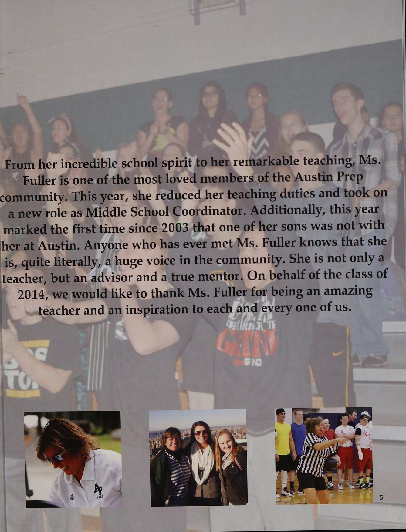 From her incredible school spirit to her remarkable teaching, Ms. Fuller is one of the most loved members of the Austin Prep community. This year, she reduced her teaching duties and took on a new role as Middle School Coordinator. Additionally, this year marked the first'time since 2003.that one of her sons was not with her at Austin. Anyone who has ever met Ms. Fuller knows that she is, quite literally, a huge voice in the community. She is not only a teacher, but an advisor and a true mentor. On behalf of the class of 2014, we would like to thank Ms. Fuller for being an amazing teacher and an inspiration to each and every one of us.