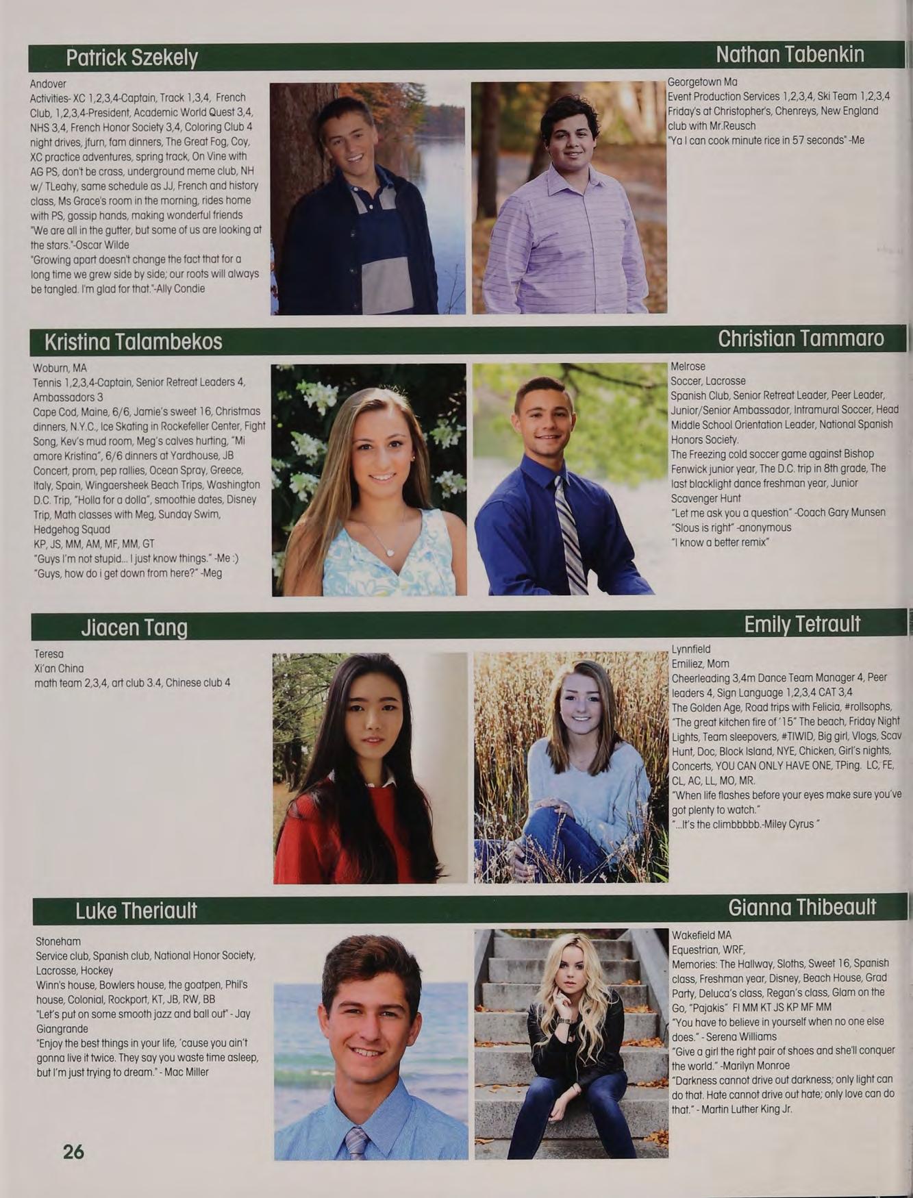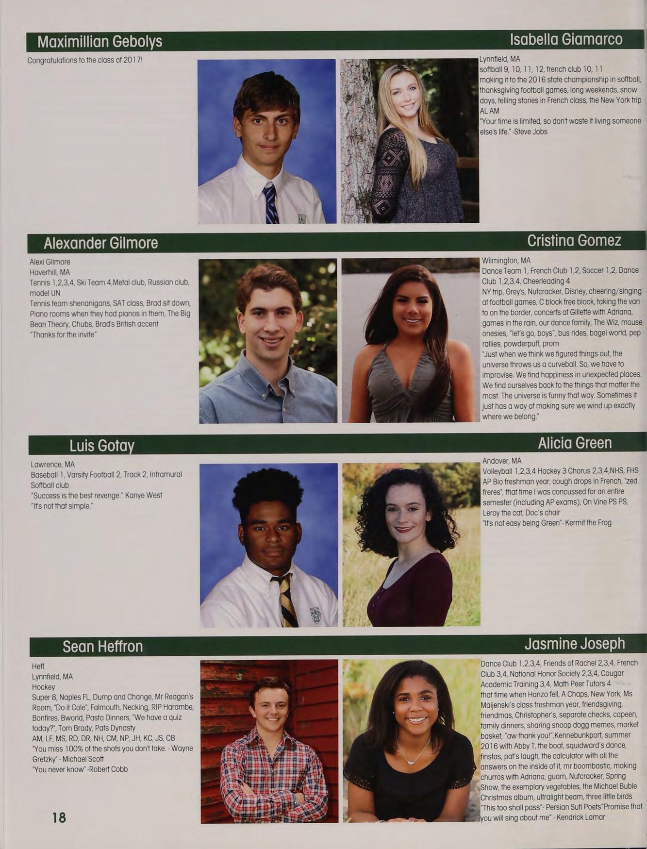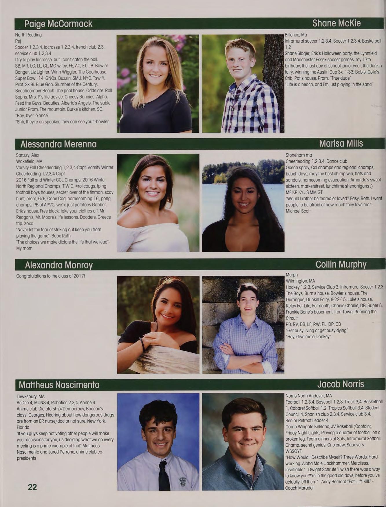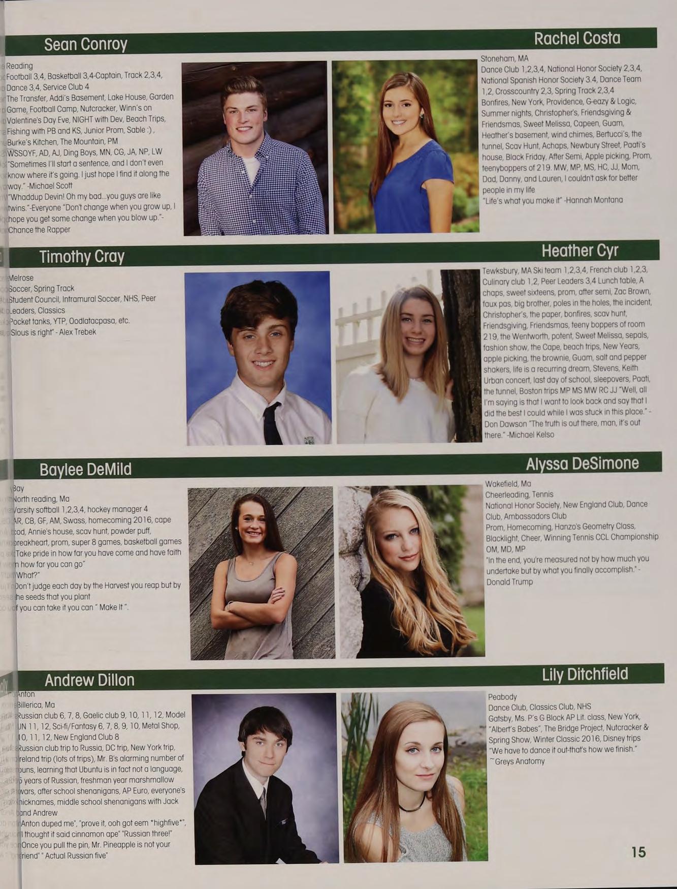 Soccer 1,2,3, Indoor Track 3,4m Lacrosse 2, 3,4 5B JJ PS LJ PS AL alpha, TCLs, Chance, cotton eyed ‘oe, Tobbo, pep rally, Great Fog, the Oz Debate jalentines, funkytown, market basket, "I'm a large’ gossip hands, JB KT PF New York trip, boys night in TOPS, capeen, Zootopia, basketball games, another day another adventure, pork?, jefe, Fab Five, tleahy's NH house, “aw thank youl”, family dinners, MFA shapins, SLTP, Norris is a secret genius, ‘theyre our Dreaking the ice at prom. Thank you to all of my boaches, teachers, and parents. Much love to you l:)