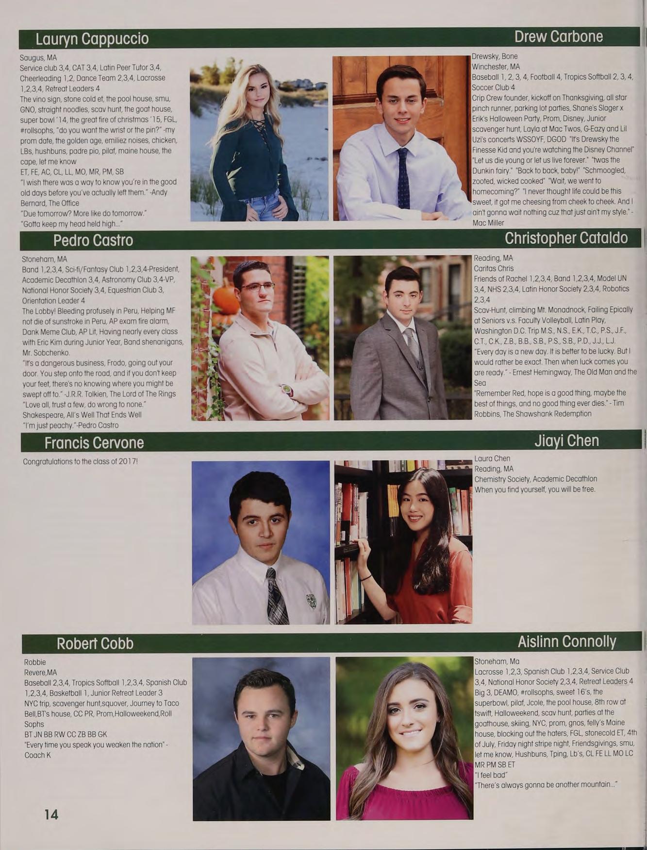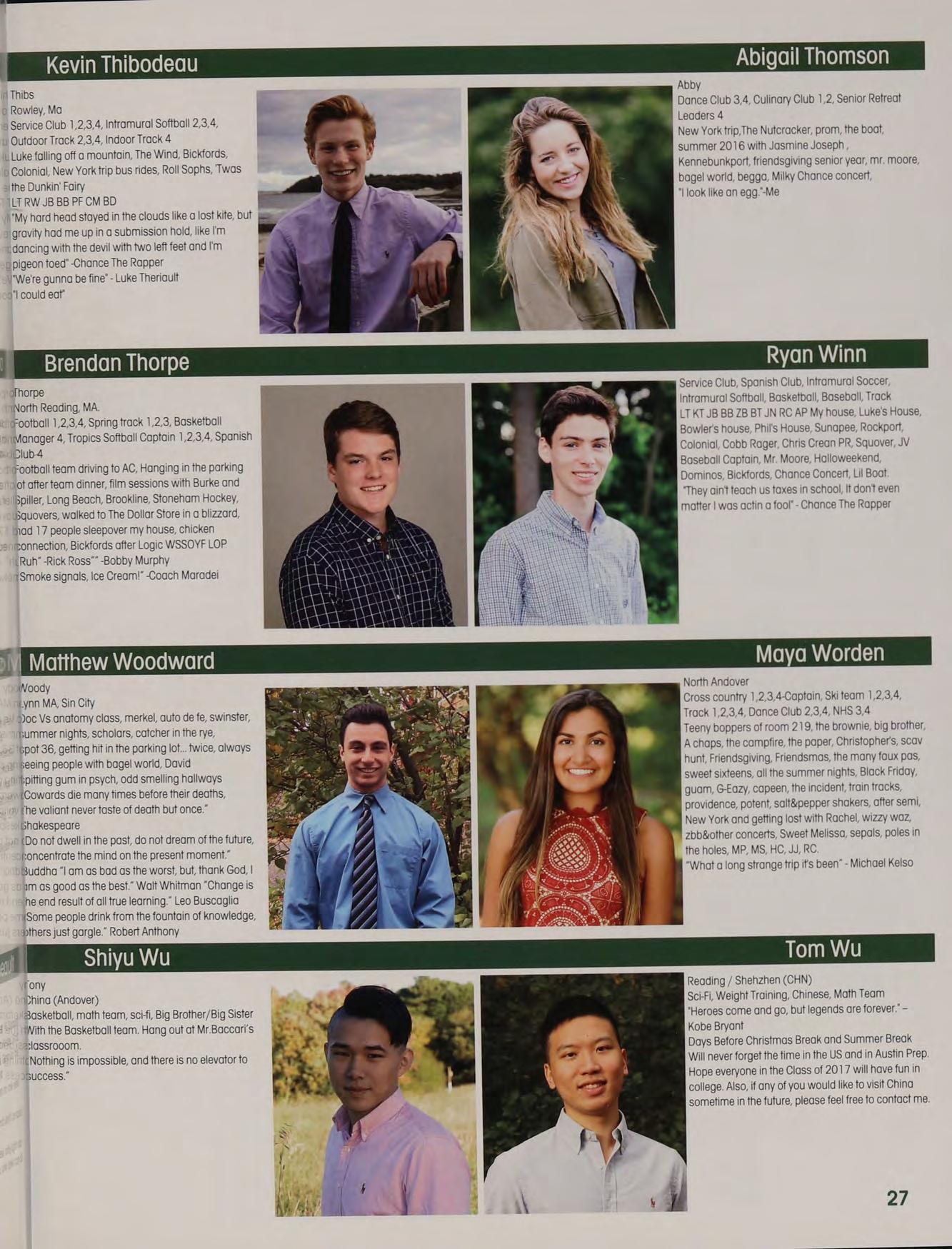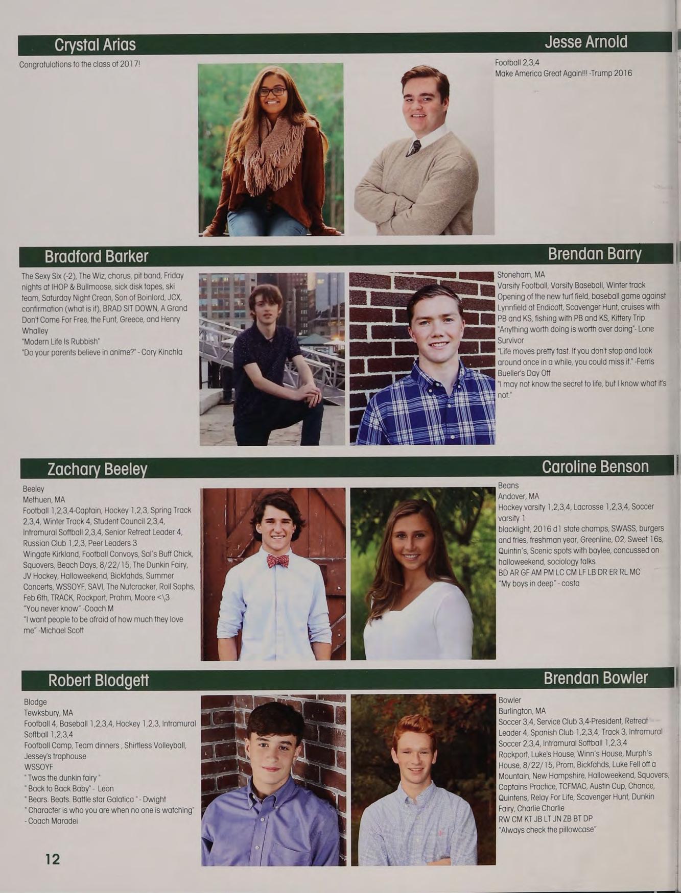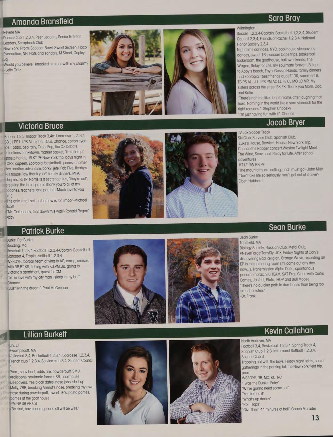 Soccer 3,4, Service Club 3,4-President, Retreat Leader 4, Spanish Club 1,2,3,4, Track 3, Intramural Soccer 2,3,4, Intramural Softball 1,2,3,4 Rockport, Luke's House, Winn’s House, Murph’s House, 8/22/15, Prom, Bickfahds, Luke Fell off a Mountain, New Hampshire, Halloweekend, Squovers, Captains Practice, TCFMAC, Austin Cup, Chance, Quintens, Relay For Life, Scavenger Hunt, Dunkin Fairy, Charlie Charlie RW CM KT JB LT JN ZB BT DP “Always check the pillowcase”