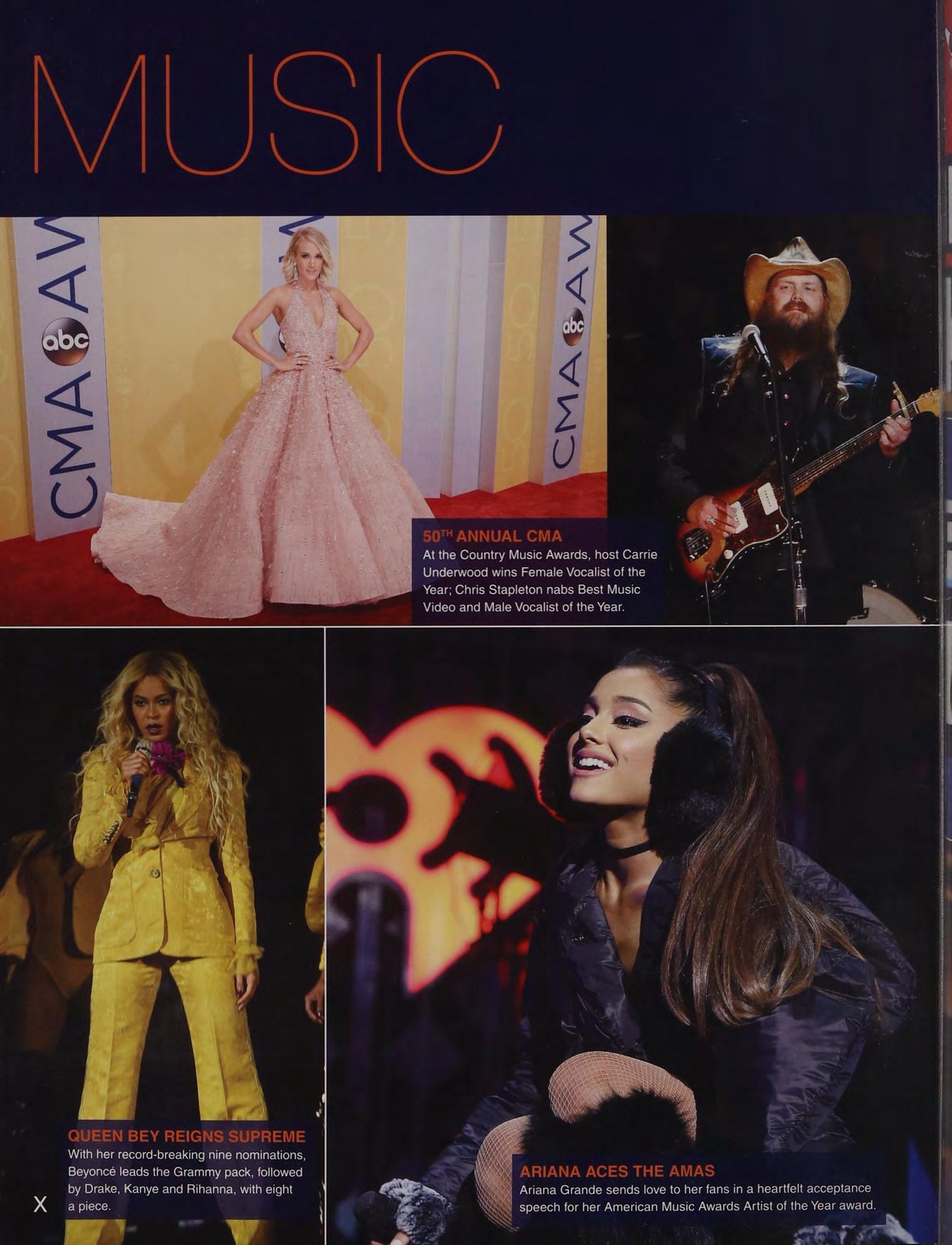 At the Country Music Awards, host Carrie Underwood wins Female Vocalist of the Year; Chris Stapleton nabs Best Music Video and Male Vocalist of the Year.