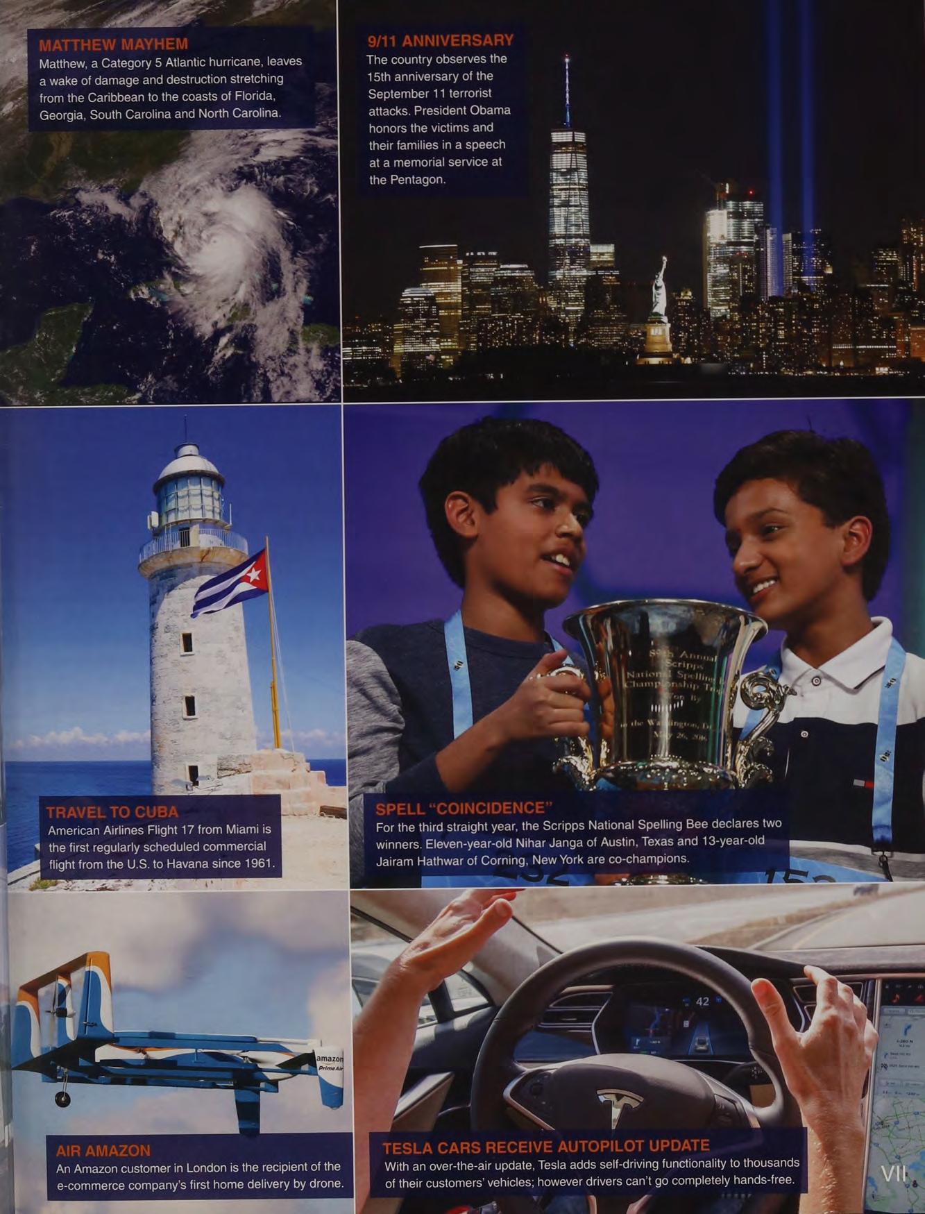 Matthew, a Category 5 Atlantic hurricane, leaves The country observes the j "= awake of damage and destruction stretching 15th anniversary of the = from the Caribbean to the coasts of Florida, September 11 terrorist a Georgia, South Carolina and North Carolina. attacks. President Obama | honors the victims and their families in a speech at a memorial service at the Pentagon.
