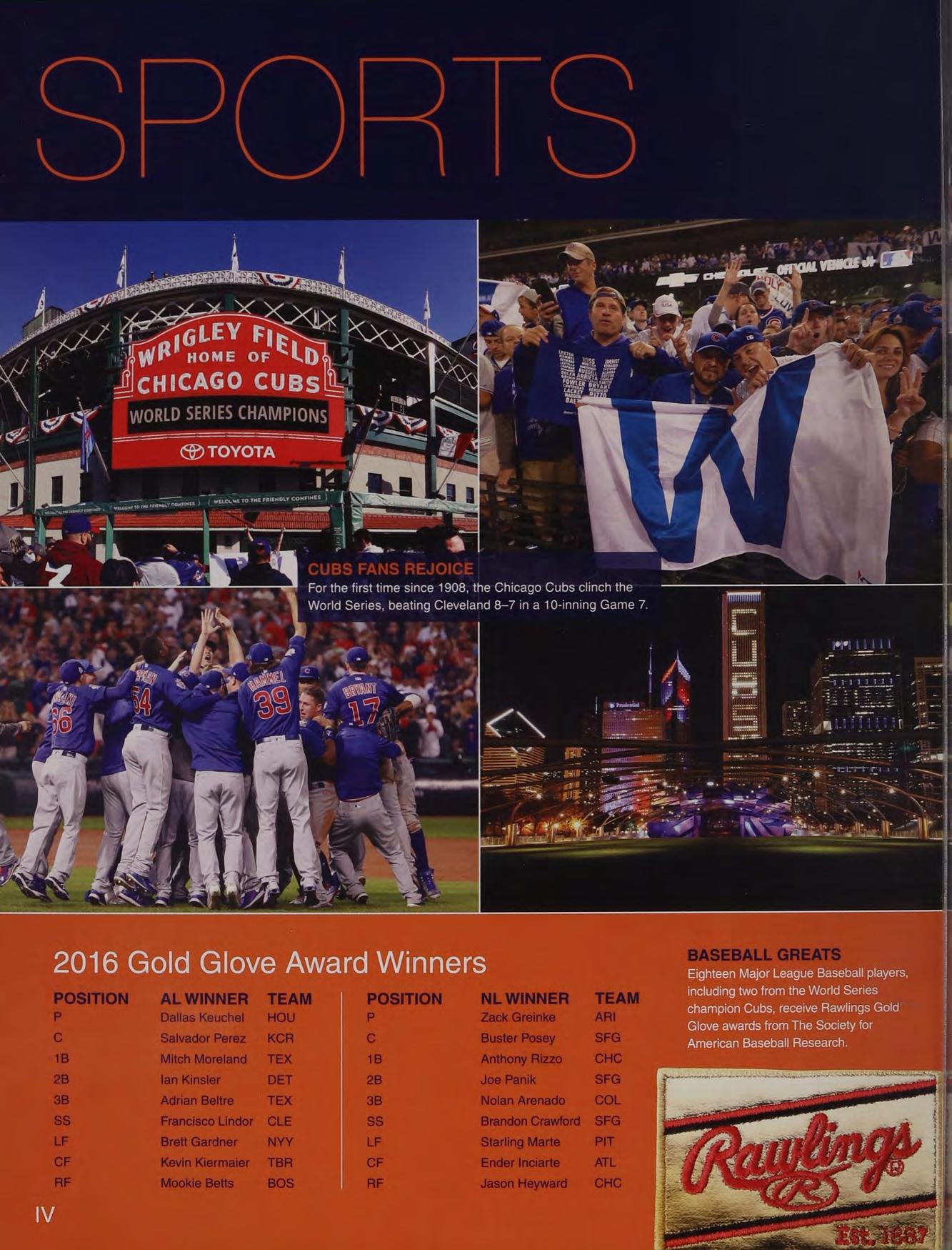 Eighteen Major League Baseball players, including two from the World Series champion Cubs, receive Rawlings Gold Glove awards from The Society for American Baseball Research.