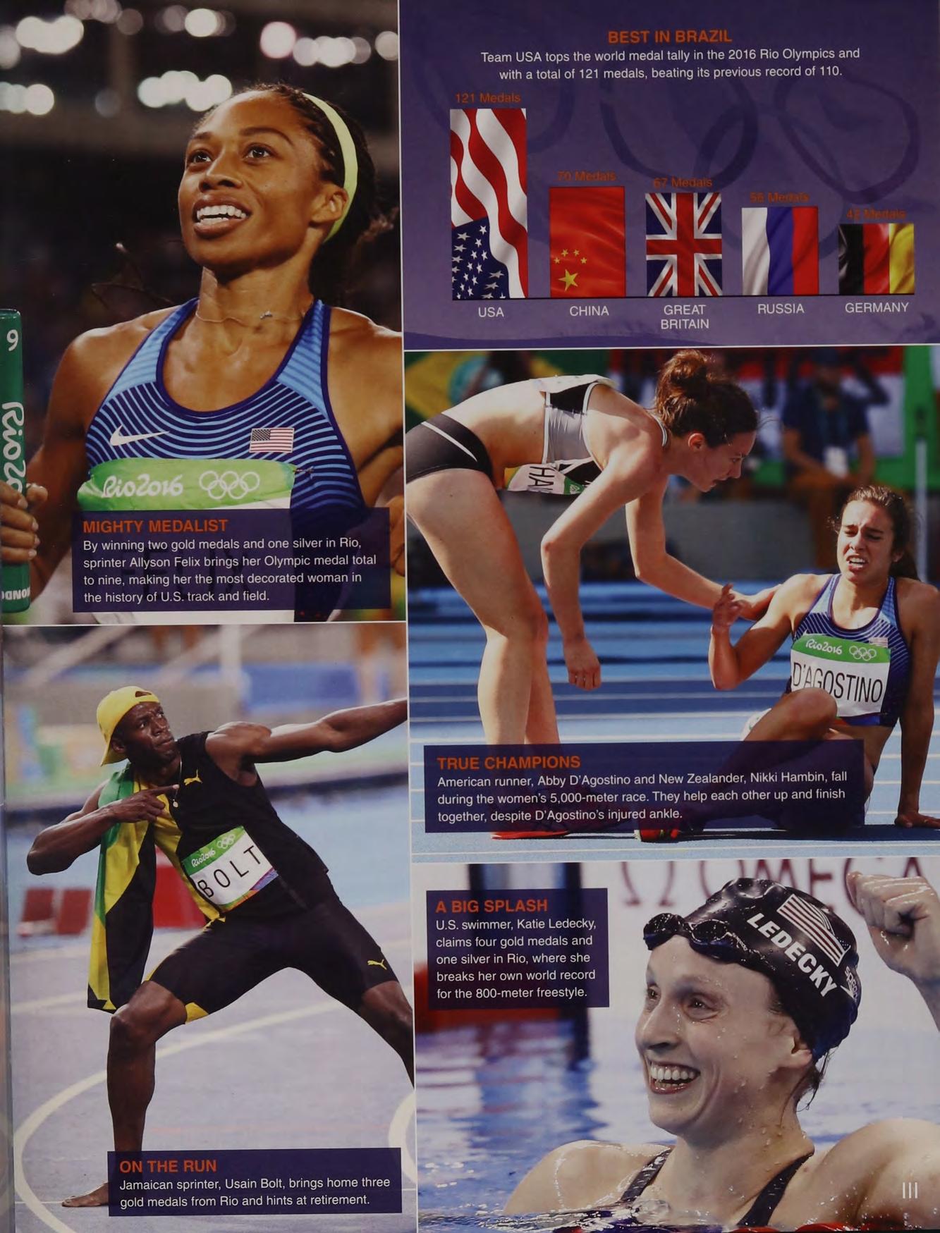 U.S. swimmer, Katie Ledecky, claims four gold medals and one silver in Rio, where she breaks her own world record for the 800-meter freestyle.