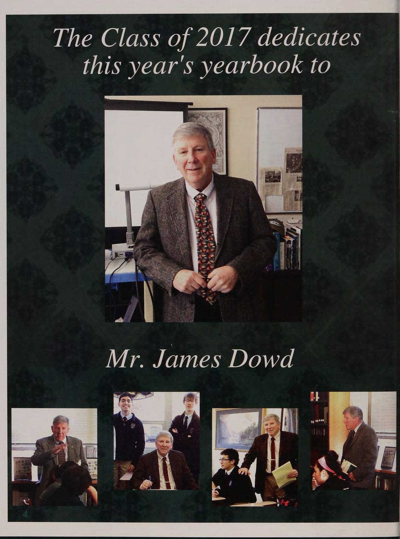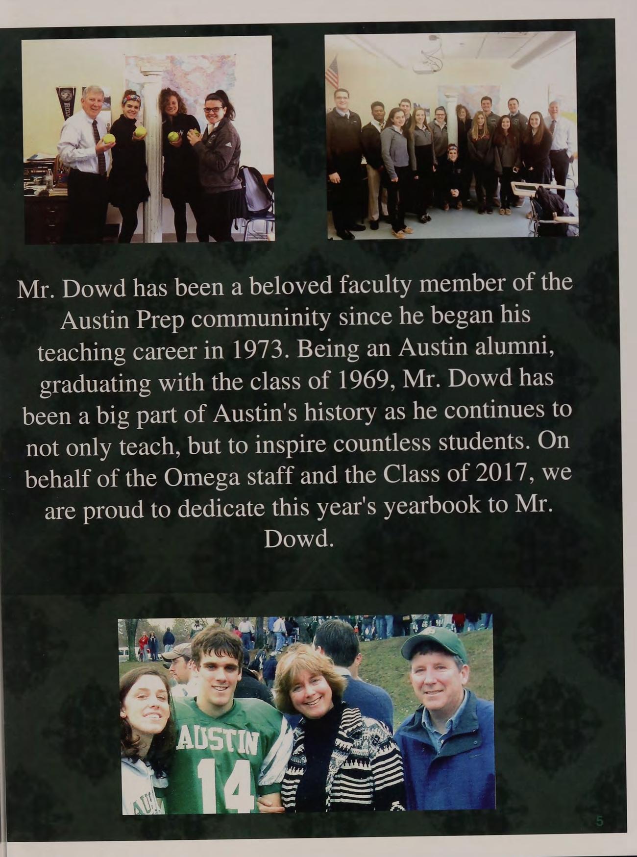 Mr. Dowd has been a beloved faculty member of the Austin Prep communinity since he began his teaching career in 1973. Being an Austin alumni, graduating with the class of 1969, Mr. Dowd has been a big part of Austin's history as he continues to not only teach, but to inspire countless students. On behalf of the Omega staff and the Class of 2017, we are proud to dedicate this year's yearbook to Mr. Dowd.