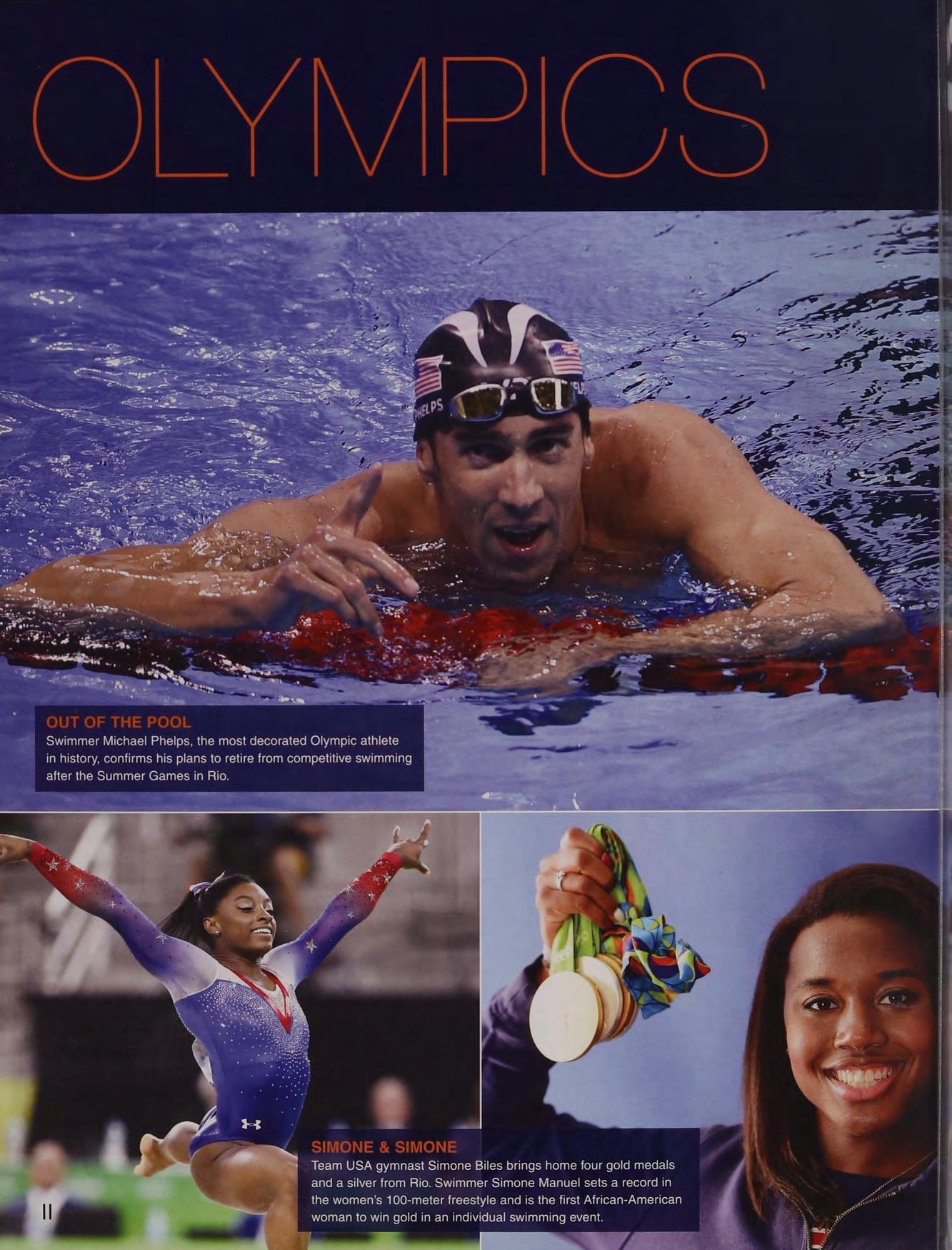 Team USA gymnast Simone Biles brings home four gold medals and a silver from Rio. Swimmer Simone Manuel sets a record in the women’s 100-meter freestyle and is the first African-American woman to win gold in an individual swimming event.