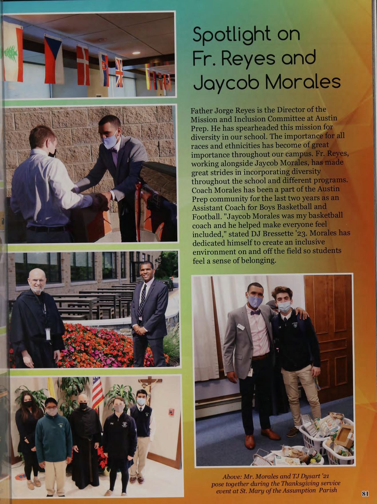 Father Jorge Reyes is the Director of the Mission and Inclusion Committee at Austin Prep. He has spearheaded this mission for diversity in our school. The importance for all races and ethnicities has become of great importance throughout our campus. Fr. Reyes, working alongside Jaycob Morales, hasmade great strides in incorporating diversity throughout the school and different programs: Coach Morales has been a part of the Austim Prep community for the last two years as am Assistant Coach for Boys Basketball and Football. "Jaycob Morales was my basketball coach and he helped make everyone feel included," stated DJ Bressette '23. Morales has dedicated himself to create an inclusive environment on and off the field so students feel a sense of belonging.