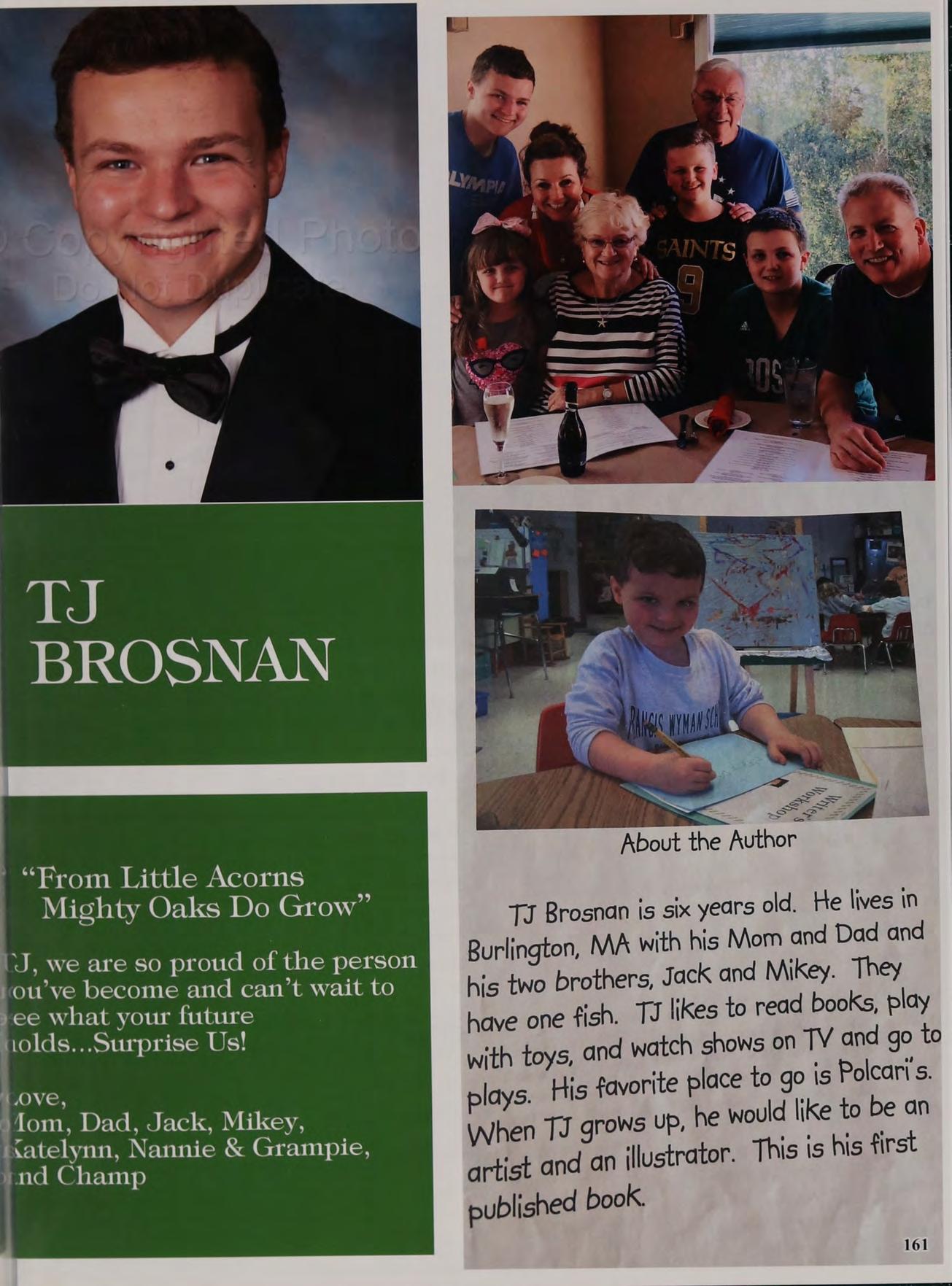 TJ Brosnan is six years old. He lives in Burlington, MA with his Mom and Dad and his two brothers, Jack and Mikey. They likes to read books, play with toys, and watch shows on TV and go to plays. His tavorite place to go is Polcar' s. When TJ grows UP, he would like to be an artist and an ‘llustrator. This is his first published book. have one fish. TJ