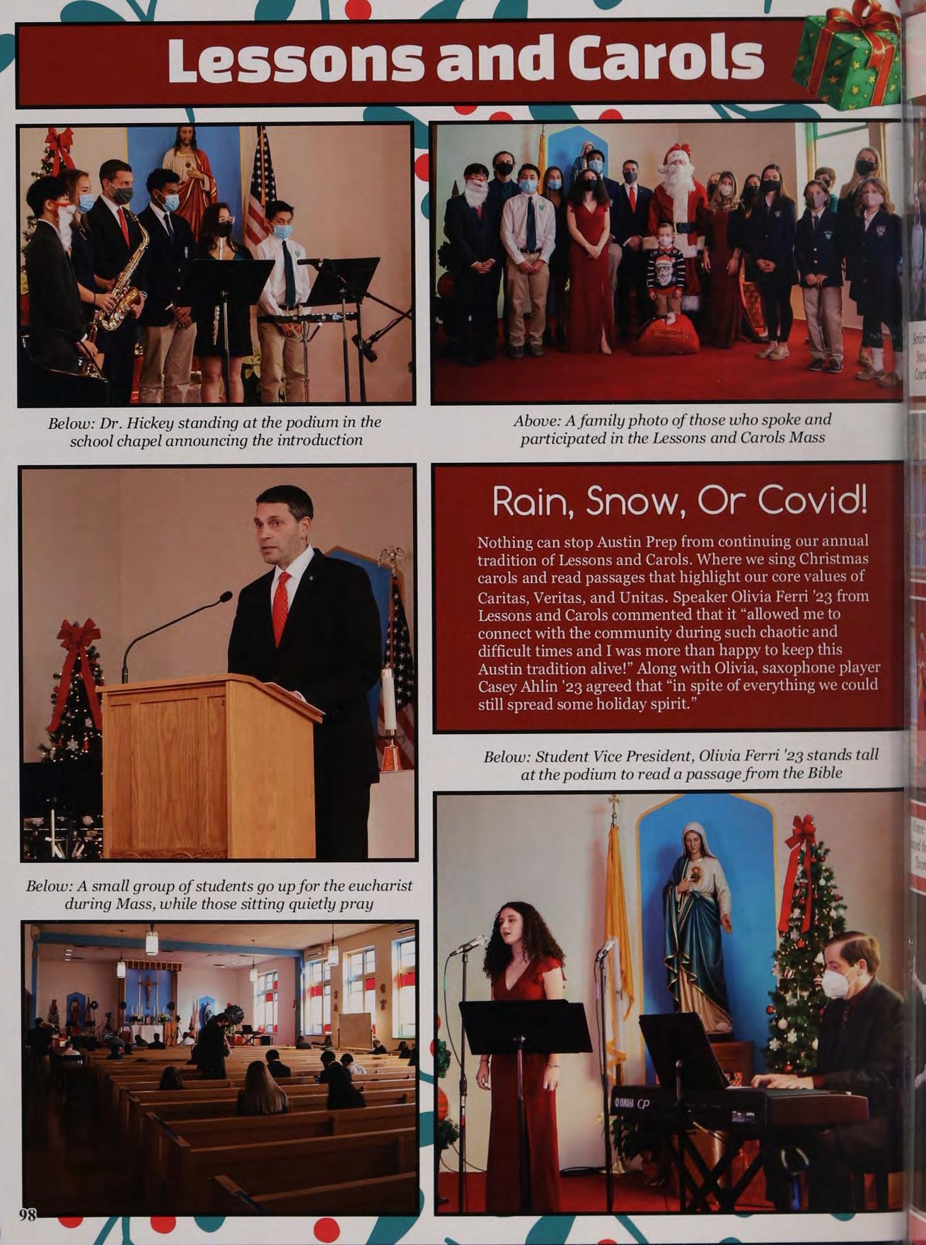 Due to the challenging circumstances of COVID-19, ighal Convocation Mass was delayed twice this year. Finally, on ith November 17th, Convocation Mass was held in Richard J. ix Meelia Hall. It is the annual tradition that officially marks |! start of the academic year. The entire Class of 2021 attende: the Mass, and the remaining students viewed the Mass through Livestream due to social distancing restrictions. A) During his remarks, Dr. Hickey noted that Austin Prep’s mission helps support our unity in the pandemic. “Think about that: It was the prayer of the son of God that we shou! all come together,” Dr. Hickey said, “We can do that by | f honoring the command of Jesus, to treat others the way we ip would want to be treated.” Seniors were grateful for the 1 opportunity to carry on Convocation traditions in person. *! F, was a remarkable experience for me since I’m graduating th ? year,” said Carrie Zheng'21, “I was afraid that we couldn't have the Mass this year because of COVID-19, butI’mglad\ found a way to hold it successfully.” |