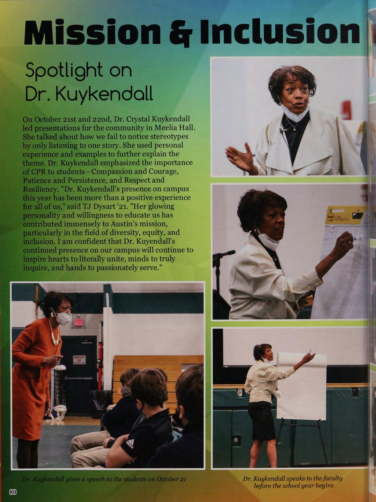 On October 21st and 22nd, Dr. Crystal Kuykendall led presentations for the community in Meelia Hall. She talked about how we fail to notice stereotypes by only listening to one story. She used personal experience and examples to further explain the theme. Dr. Kuykendall emphasized the importance of CPR to students - Compassion and Courage, Patience and Persistence, and Respect and iliency. “Dr. Kuykendall's presence on campus this year has been more than a positive experience or all of us,” said TJ Dysart '21. "Her glowing mality and willingness to educate us has ributed immensely to Austin's mission, articularly in the field of diversity, equity, and Jusion. I am confident that Dr. Kuyendall's continued presence on our campus will continue to nspire hearts to literally unite, minds to truly uire, and hands to passionately serve."