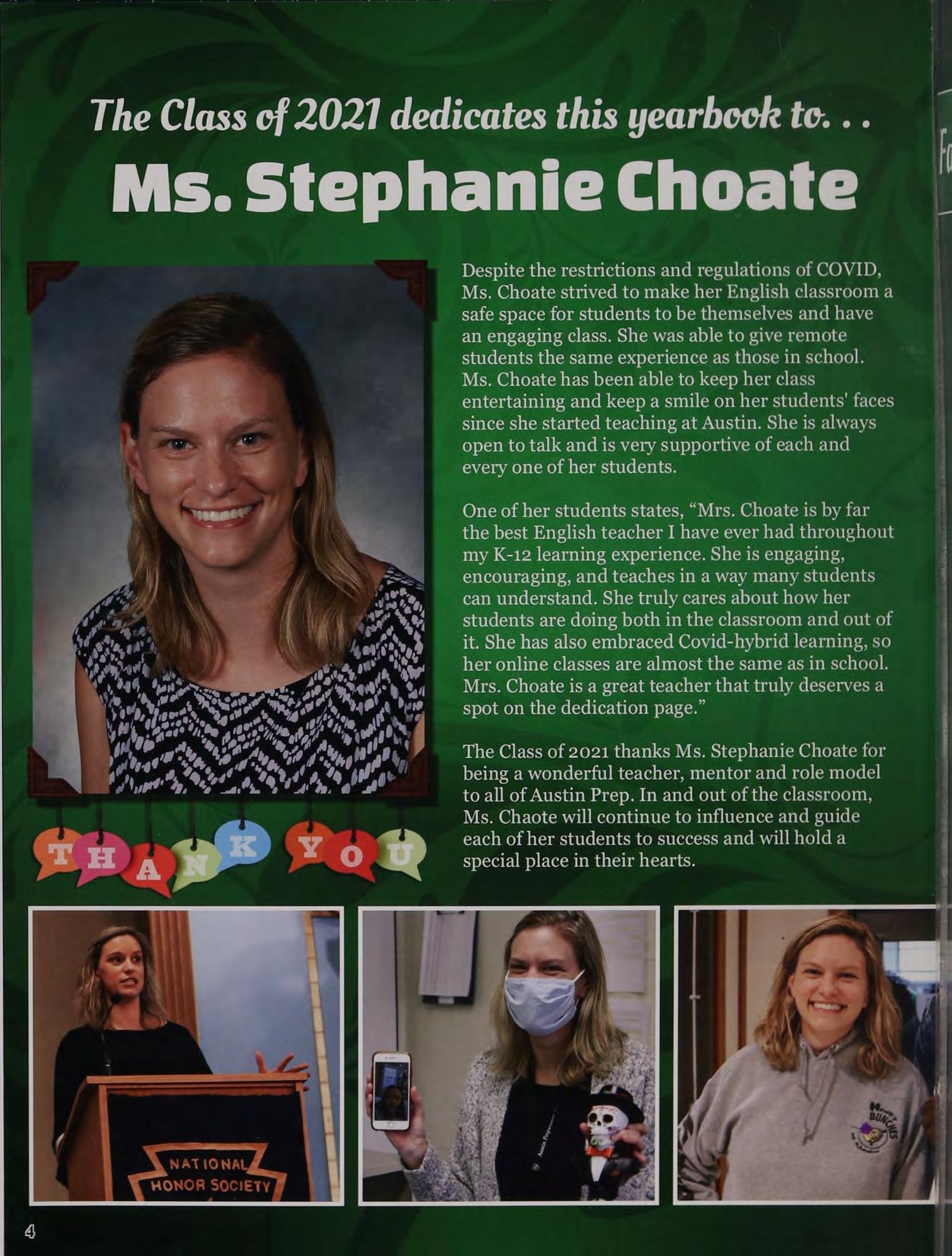 The Class of 2021 thanks Ms. Stephanie Choate for being a wonderful teacher, mentor and role model to all of Austin Prep. In and out of the classroom, Ms. Chaote will continue to influence and guide each of her students to success and will hold a special place in their hearts.