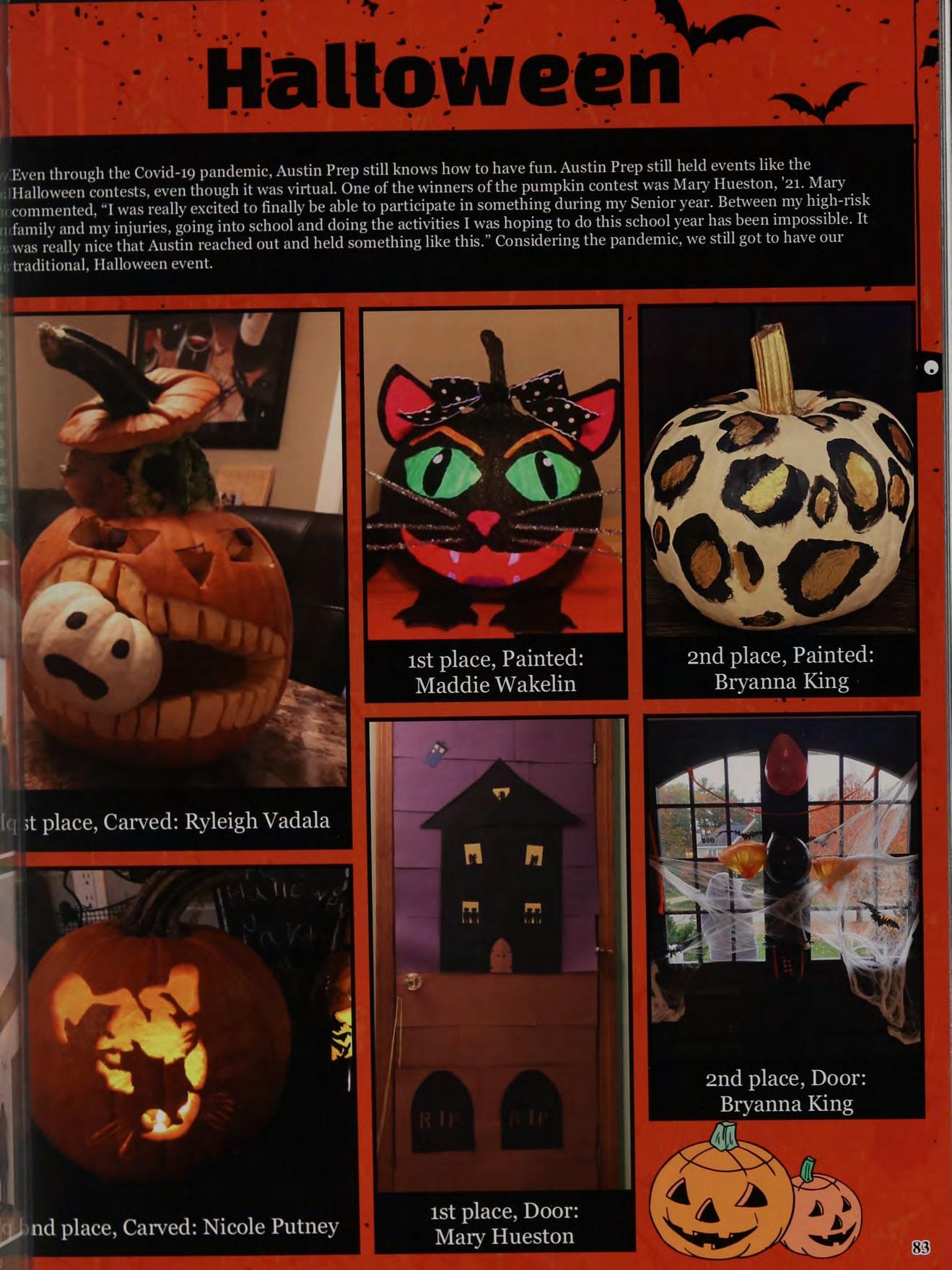Even through the Covid-19 pandemic, Austin Prep still knows how to have fun. Austin Prep still held events like the ./Halloween contests, even though it was virtual. One of the winners of the pumpkin contest was Mary Hueston, '21. Mary «commented, “I was really excited to finally be able to participate in something during my Senior year. Between my high-risk »family and my injuries, going into school and doing the activities I was hoping to do this school year has been impossible. It was really nice that Austin reached out and held something like this.” Considering the pandemic, we still got to have our