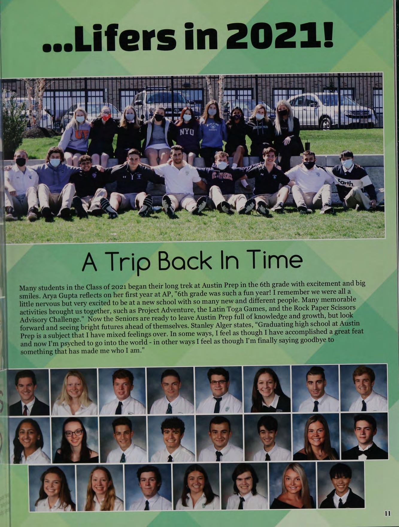 Many students in the Class of 2021 began their long trek at Austin Prep in the 6th grade with excitement and big ' smiles. Arya Gupta reflects on her first year at AP, "6th grade was such a fun year! I remember we were alla little nervous but very excited to be at a new school with so many new and different people. Many memorable activities brought us together, such as Project Adventure, the Latin Toga Games, and the Rock Paper Scissors Advisory Challenge." Now the Seniors are ready to leave Austin Prep full of knowledge and growth, but look forward and seeing bright futures ahead of themselves. Stanley Alger states, “Graduating high school at Austin Prep is a subject that I have mixed feelings over. In some ways, I feel as though I have accomplished a great feat and nowI'm psyched to go into the world - in other ways I feel as though I'm finally saying goodbye to something that has made me who I am."
