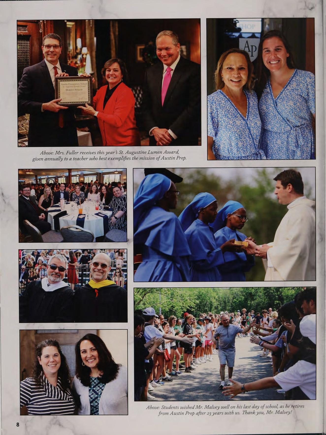 Above: Mrs. Fuller receives this year’s St. Augustine Lumen Award, given annually to a teacher who best exemplifies the mission of Austin Prep.