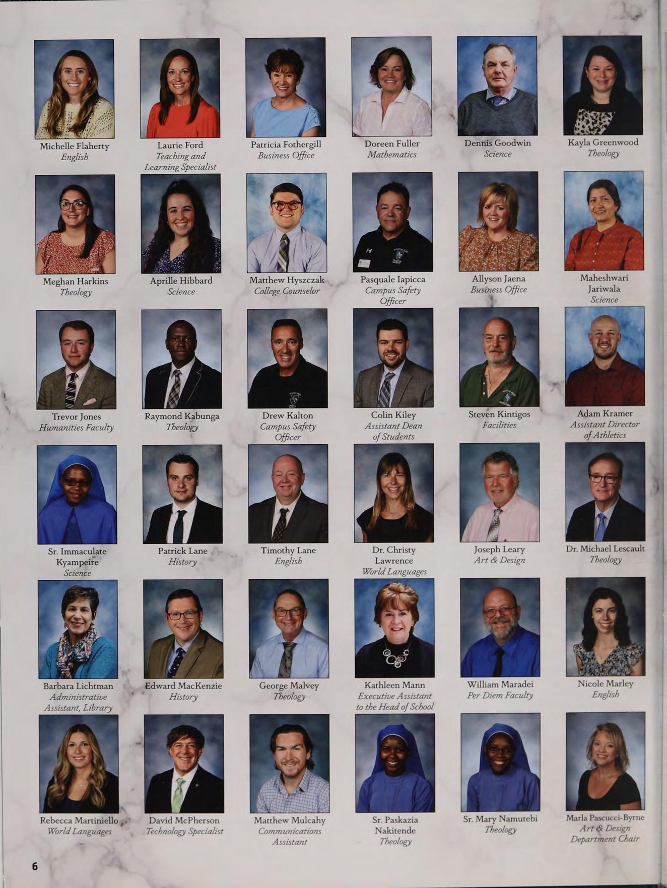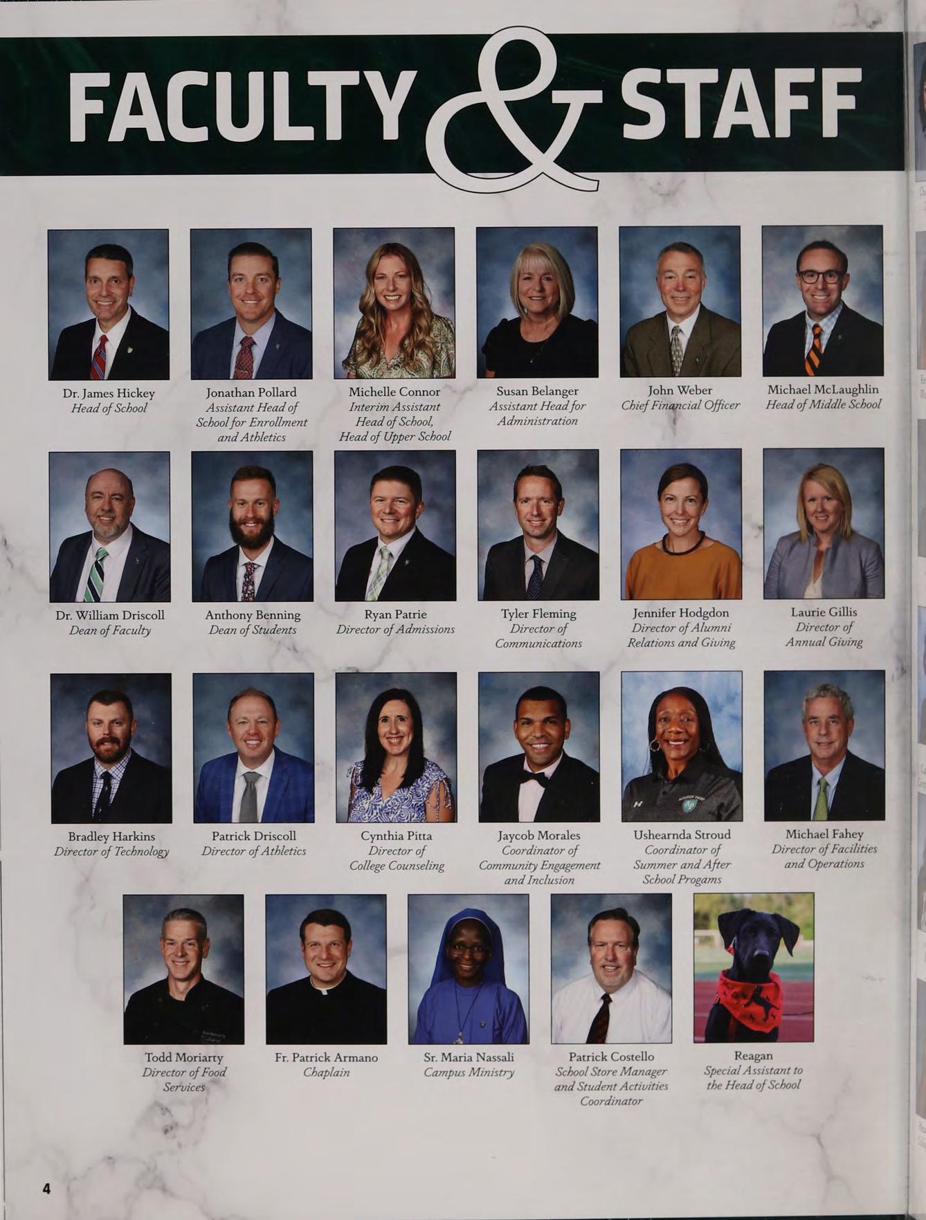 Todd Moriarty Fr. Patrick Armano Sr. Maria Nassali Patrick Costello Reagan Director of Food Chaplain Campus Ministry School Store Manager Special Assistant to Services and Student Activities the Head of School Coordinator