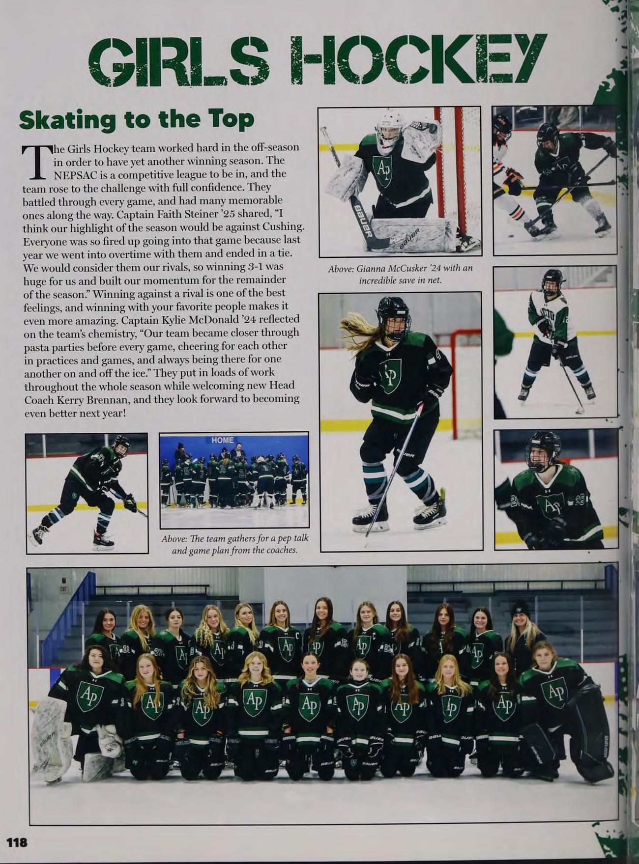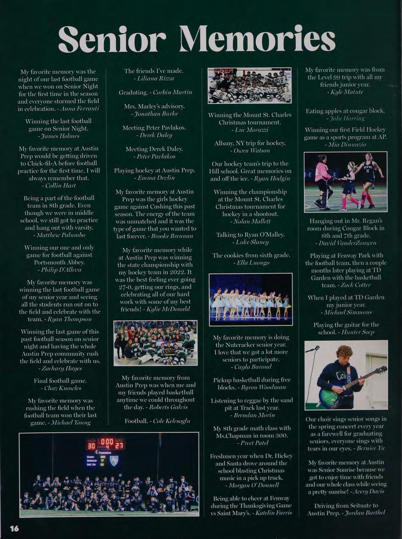 My favorite memory at Austin Prep was the girls hockey game against Cushing this past season. The energy of the team was unmatched and it was the type of game that you wanted to last forever. - Brooke Brennan
