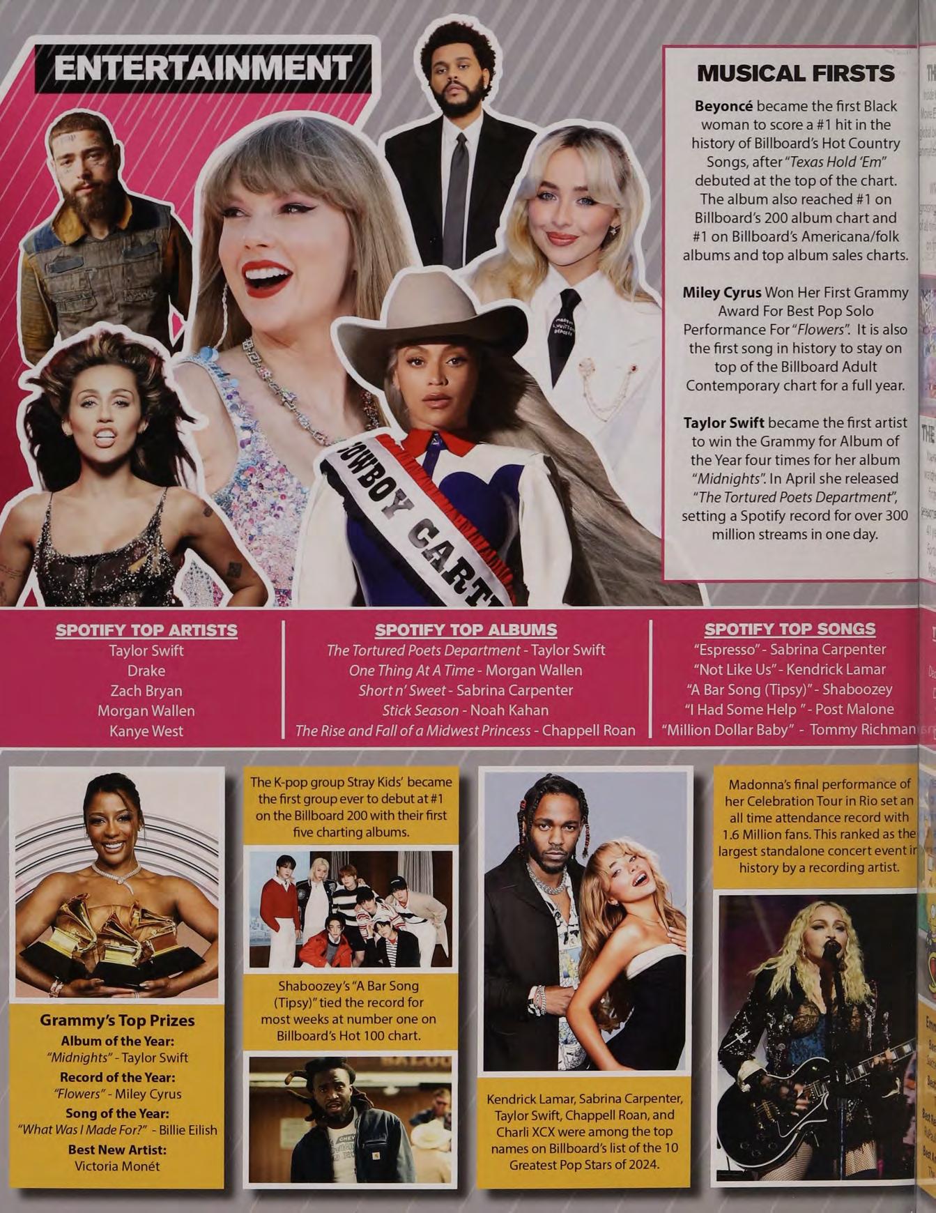 Taylor Swift became the first artist |... to win the Grammy for Album of |" the Year four times for heralbum “Midnights”. \n April she released “The Tortured Poets Department’, setting a Spotify record for over 300 |? million streams in one day.